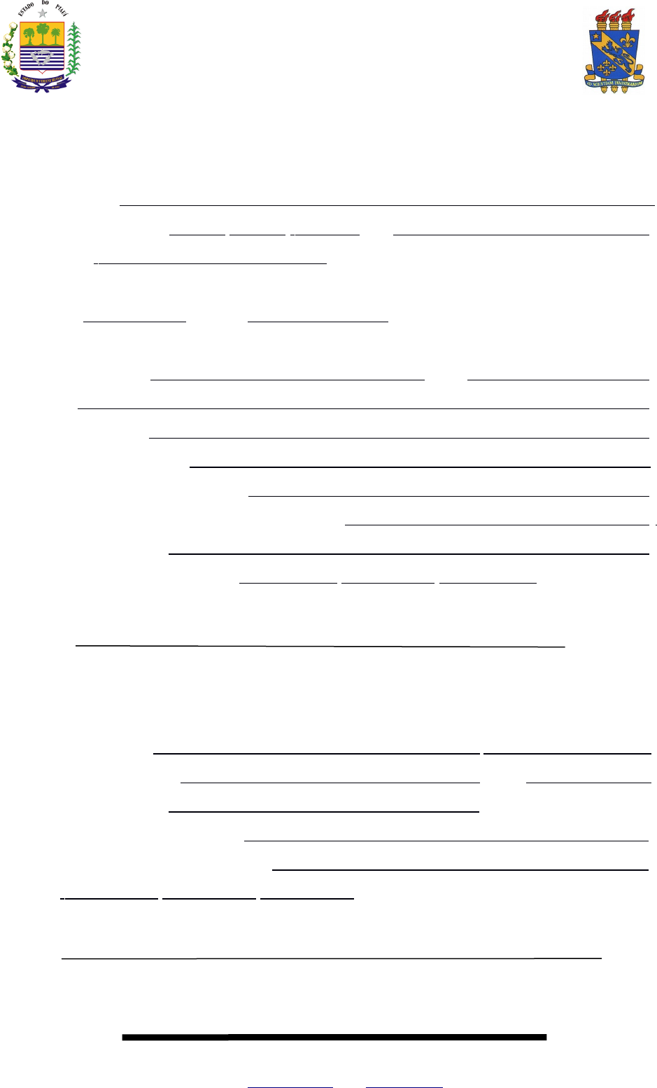 GOVERNO DO ESTADO DO PIAUÍ UNIVERSIDADE ESTADUAL DO PIAUÍ – UESPI PRÓ-REITORIA DE ENSINO DE GRADUAÇÃO – PREG DEPARTAMENTO DE ASSUNTOS PEDAGÓGICOS – DAP DIVISÃO DE ESTÁGIO CURRICULAR SUPERVISIONADO OBRIGATÓRIO FICHA DE INSCRIÇÃO DE ESTÁGIO OBRIGATÓRIO Estagiário(a): Data de nascimento / / CPF Matrícula: RG: _______________________________ Curso:______________________________________________________________ Período:___________ Turno: _________________ Disciplina: ESTÁGIO CURRICULAR SUPERVISIONADO OBRIGATÓRIO End. Residencial: Fone: Cidade: Local de Estágio: Endereço do Estágio: Supervisor do Estágio (local): Professor Supervisor do Estágio (UESPI): Horário de Estágio: Data de Inscrição do Estágio: / / Estagiário (a): MUDANÇA DE LOCAL DO ESTÁGIO Local de Estágio: Endereço do Estágio: Fone: Horário de Estágio: Supervisor do Estágio (local): Supervisor do Estágio na UESPI: Data: / / . Estagiário (a) Rua João Cabral, 2231 - Bairro Pirajá - CEP: 64.002-150 - Teresina - Piauí - Brasil Fones: Central (86) 3213-7150 (Ramal: 343) Fone/Fax PREG: 3213-7801 e-mail: dap@uespi .br Site: www.uespi.br http://www.uespi.br/ mailto:dap@uespi.br mailto:dapuespi@gmail.com GOVERNO DO ESTADO DO PIAUÍ UNIVERSIDADE ESTADUAL DO PIAUÍ – UESPI MUDANÇA DE LOCAL DO ESTÁGIO