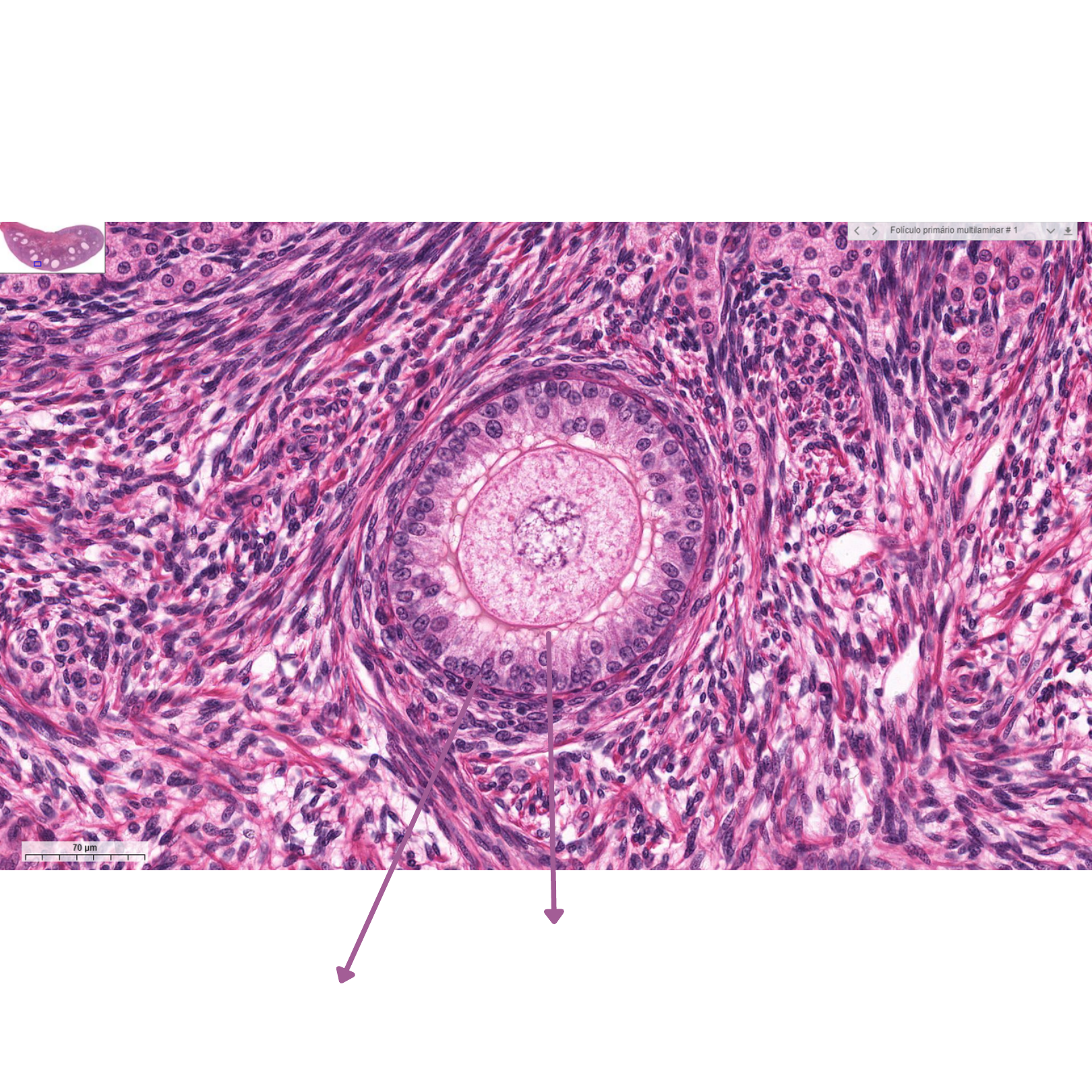 Folículo primário Zona pelúcida Células da granulosa Fonte: https://histologyguide.com/ Folículo primário: células foliculares cúbicas, ovócito maior, células foliculares começam a se multiplicar por divisão mitótica; Células da granulosa: células foliculares que se replicaram; Zona pelúcida: região proteica que faz o reconhecimento dos espermatozoides; Folículo unilaminar: uma única camada de células da granulosa; Multilaminar: mais de uma camada de células da granulosa.