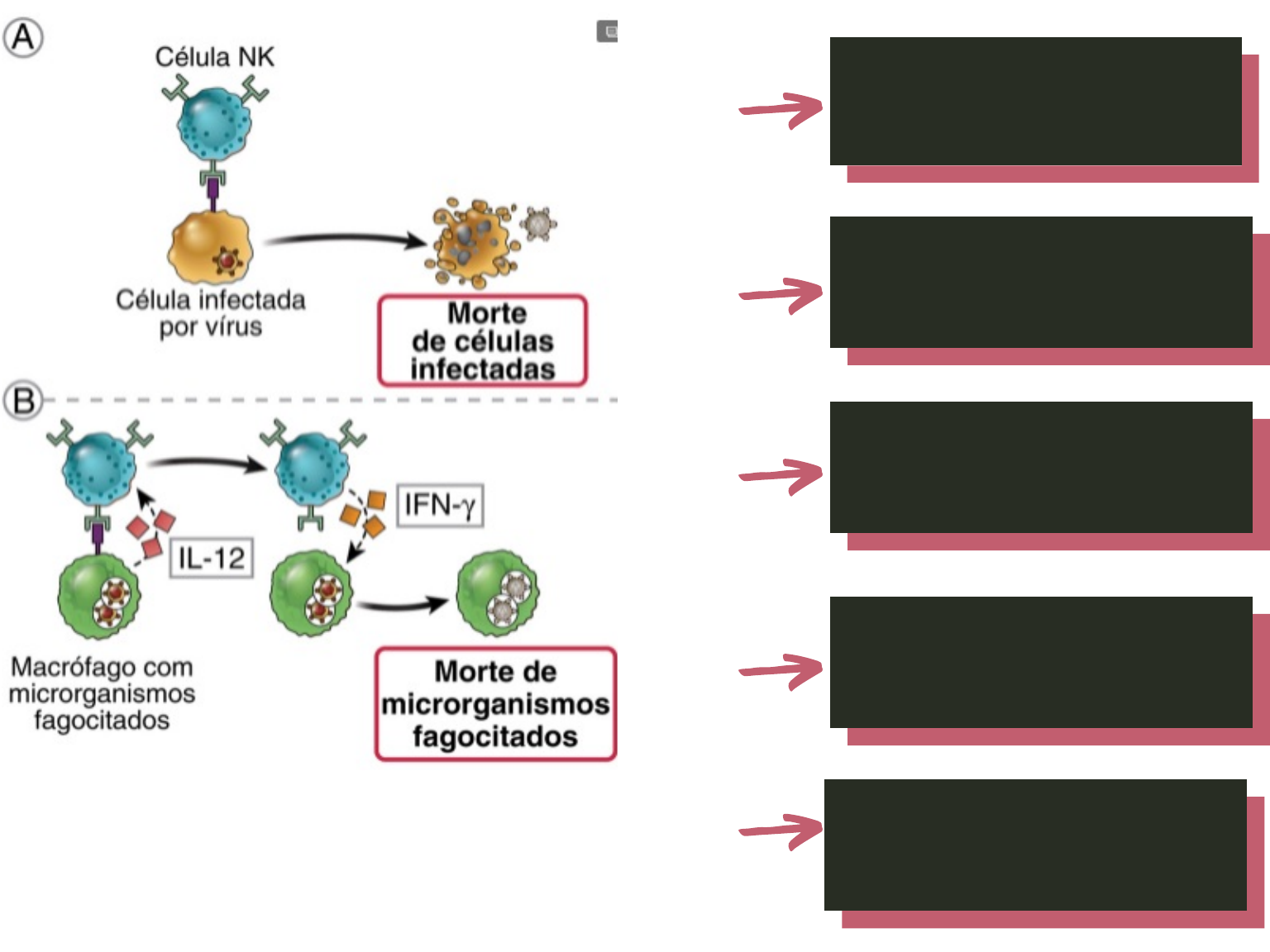 As células natural killer (NK) reconhecem células infectadas e perturbadas e respondem destruindo essas células e secretando a citocina ativadora de macrófagos IFN-γ Compõe cerca de 10% dos linfócitos no sangue e nos órgãos linfoides periféricos C É L U L A N K Elimina reservatórios celulares da infecção Sintetizam e secretam a citocina interferon-γ Matam as células hospedeiras infectadas por microrganismos intracelulares, eliminando, assim, os reservatórios da infecção Ativa os macrófagos para matar os microrganismos fagocitados. Referência: ABBAS, A.K.; LICHTMAN, A.H.; PILLAI, S. Imunologia Básica: Funções e distúrbios do sistema imunológico. 5° edição. GEN Guanabara Koogan, 30 de novembro de 2020.
