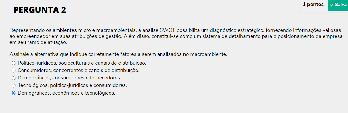 Representando os ambientes micro e macroambientais, a análise SWOT possibilita um diagnóstico estratégico, fornecendo informações valiosas ao empreendedor em suas atribuições de gestão. Além disso, constitui-se como um sistema de detalhamento para o posicionamento da empresa em seu ramo de atuação. Assinale a alternativa que indique corretamente fatores a serem analisados no macroambiente. Político-jurídicos, socioculturais e canais de distribuição. Consumidores, concorrentes e canais de distribuição. Demográficos, consumidores e fornecedores. Tecnológicos, político-jurídicos e consumidores. Demográficos, econômicos e tecnológicos.