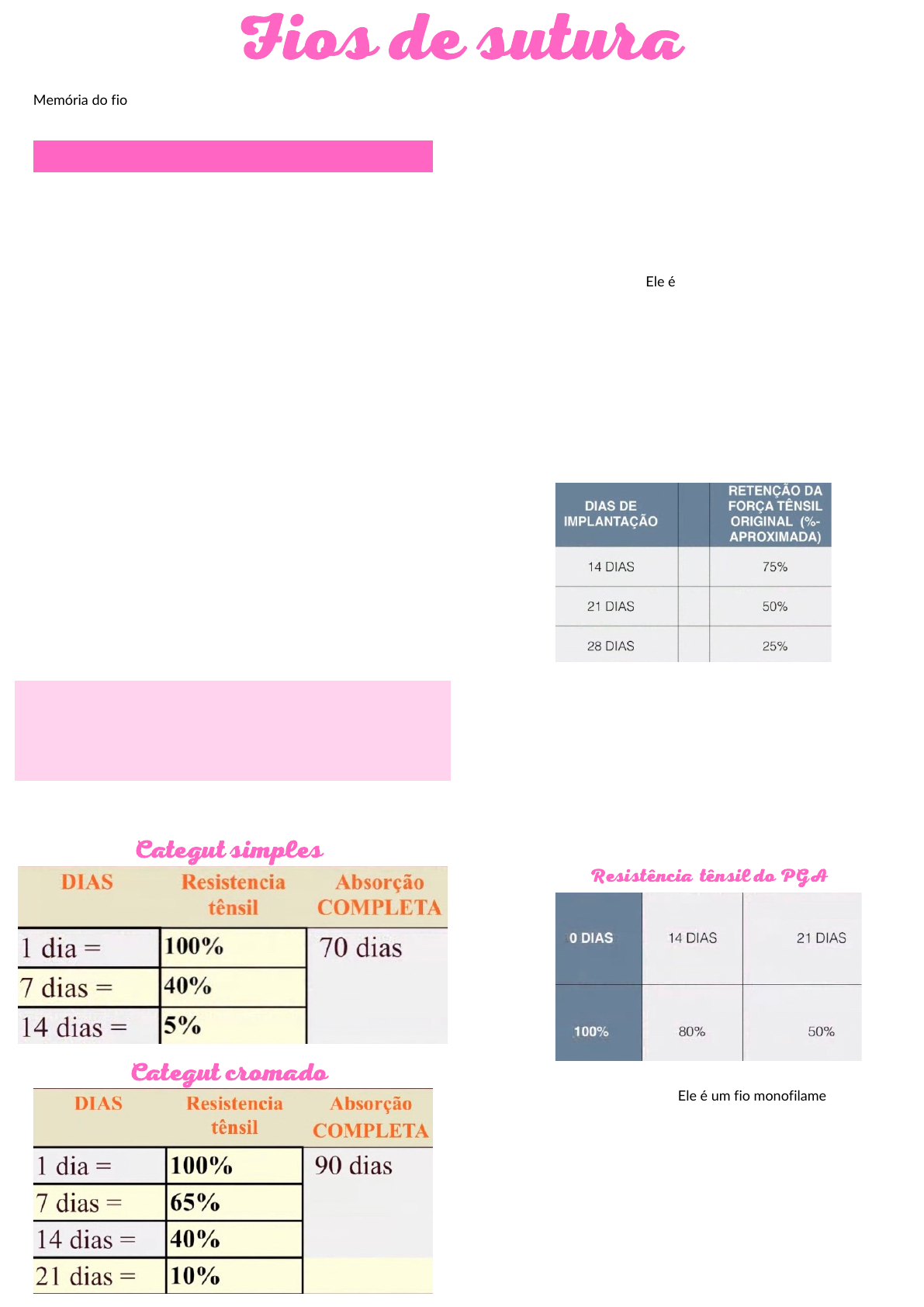 (É antigo). Ele é um fio absorvível natural e era utilizado como cordas de violino, é derivado da camada submucosa/ mucosa/serosa dos intestinos dos ovinos e bovinos abatidos, eles são coletados, purificados, processados (torcido) e esterilizado com cobalto 60. Tem aparência de monofilamentar, mas é considerado multifilamentar. Ele é monofilamentar quando for acima de 6-0. Ele é composto por 90% de colágeno (matéria orgânica). É de origem animal e é muito usado na medicina humana em cirurgias gastrointestinais. Na veterinária ele ainda é usado nas castrações, mas o poder de reação dele é muito grande, tem maior reação inflamatória, aderindo os tecidos adjacentes. Ele pode vir agulhado ou sem agulha. Quanto maior a reação do fio, mais ele causa aderências aos tecidos ao redor (tecidos adjacentes). Atenção- tomar muito cuidado com esse fio na hora da cistorrafia (sutura de bexiga), porque se a sutura entrar na luz do órgão pode predispor ao aparecimento de cálculos. Esse fio é tratado com ácido de cromo, cuja função é alongar e padronizar o tempo de absorção, além de reduzir a intensidade da reação do tecido. Temos 4 tipo: Fios de sutura Memória do fio é a capacidade que o fio tem de se manter com o formato da embalagem. É só esticar o fio que a memória sai. Após 12 horas da implantação ocorre a inflamação local, acarretando a degradação por fagocitose, com reação do tipo corpo estranho, com ações de enzimas proteolíticas. É contraindicado para cirurgias cardiovasculares e neurológicas (porque se fizermos uma sutura próxima ao nervo pode causar uma ração grande e o animal ficar com dor crônica), não devemos fazer laparorrafia/celiorrafia (sutura muscular ventral – fechamento de cavidade abdominal) com esse fio, pois vai ocorrer uma evisceração. Absorvíveis naturais Categut - Forma de degradação do fio categut - Polidioxanone (PDS ou PDX) - Ácido Poliglicólico (Dexon ou PGA) - Poliglactina 910 (viecryl) - •Tipo A ou EP 1 - simples ou não tratado (maior reação tecidual). •Tipo B ou EP 2 - tratamento cromado moderado. •Tipo C ou EP 3 - tratamento cromado médio. •Tipo D ou EP 4 - tratamento cromado extra. Quanto maior a letra ou o número da sua classificação, significa uma quantidade maior de cromo. Categut simples Categut cromado Ele é um fio absorvível, sintético, trançado (multifilamentar) e a sua resistência tênsil diminui por volta da 3 semana sendo absorvido em média com 60 dias. Ele tem menor reação inflamatória e a sua degradação ocorre por hidrólise (ação de líquidos, própria água do meio irá degradá-lo), então quando mais líquido tem na região mais rápido ele degrada. Ele pode ser violeta, branco ou incolor. Ele é composto por poliglactina 910, que é uma proteína do leite. É indicado para cirurgias no estômago, útero e bexiga. Ele tem proteção antibacteriana, que é vendido por algumas marcas e ele é mais caro por conta disso. Causa menos reação inflamatória. Ele é um fio do tipo trançado (multifilamentar) sintético, absorvível e a sua resistência tênsil diminui por volta das 2 semanas. Ele é composto por homopolímero de ácido glicólico e uma camada de estearato de cálcio. Sua degradação ocorre por hidrolise e a absorção completa ocorre entre 60-90 dias, ele pode ser violeta ou branco. É indicado para cirurgias no estômago, útero e bexiga e é contraindicado em cirurgias oftálmicas, cardíacas e neurológicas. Causa menor reação inflamatória (mas é inferior ao viecryl Resistência tênsil do PGA Ele é um fio monofilamentar sintético, um dos melhores fios que existe, ele é o mais próximo do ideal, mas é mais caro. Tem baixa memória apesar de ser monofilamentar (geralmente os fios monofilamentares são os que tem mais memória). A degradação/forca tênsil demora mais para ser perdida, sua absorção completa é por volta de 180 dias e sua degradação é por hidrólise. Ele pode ser branco ou violeta e já vem agulhado. Ele pode vir com agulha nas duas pontas, o que é ótimo para suturar uretra e próstata. Ele é um fio sintético, monofilamentar, sua absorção acontece por volta dos 90-120 dias e a sua degradação é por hidrólise. É indicado para cirurgias gastrointestinais e bexiga e contraindicado em cirurgias cardiovasculares, neurológicas e oftálmicas. Ele pode ser branco ou violeta. O fi Fios não absorvíveis Poliglecaprone 25 (Monocryl ou Caprofyl) - Fio de seda - Esses fios não são absorvidos ou digeridos, mas eles podem se fragmentar com o tempo (ex: nylon após 5 anos). Esses fios geralmente têm uma grande resistência à tensão e produzem reação tissular mínima. Eles estão agrupados em metais, fibras naturais e sintéticas. É preparado com fios de tecidos pelas larvas da seda, utilizado em cirurgias oftálmicas e cardiovasculares. Fio de algodão - São fibras de algodão, sua dificuldade de manipulação é média e esse fio pode causar fistulação. Também causa muita reação tecidual e aderências. Fio de aço - É um fio de aço inoxidável F-138 ou titânio. É usado para o fechamento do tórax. Invaginante - Suturas de origem natural Suturas de origem sintética Nylon cirúrgico - É um fio inabsorvível sintético, ele tem como princípio poliamida e pode ser prensado como fio monofilamentar ou trançado (multifilamentar). Ele escorrega e precisamos dar mais nós, além da alta memória quando monofilamentar. Ele tem elevada resistência à tensão e reação tissular mínima, pequeno coeficiente de fricção/atrito. Ele é indicado para fechamento geral, como pele, e requer grande quantidades de nós. Pode ser utilizado na cistorrafia (desde que não entre na luz se não predispõe o aparecimento de cálculo), e na gastrorrafia (desde que não entre na luz se não pode predispor ao aparecimento de úlcera gástrica). Poliéster (Ethibond) - Ele é um fio multifilamentar, trançado a partir de