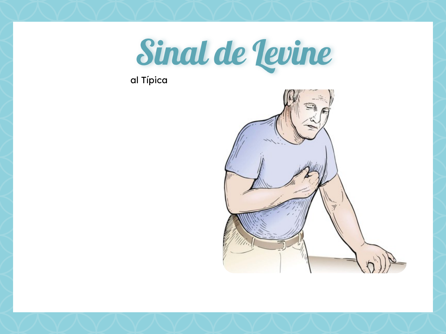 Dor Precordial Típica Caracterizado por exibição de mão fechada em movimentos circulares sobre o tórax. A dor torácica de origem cardíaca é descrita geralmente como opressão, queimação ou mal-estar torácico mal definido Esse sinal é altamente sugestivo de dor de origem isquêmica, ou seja, tem uma especificidade alta. Contudo, a sensibilidade é baixa, portanto se não estiver presente, não afasta dor anginosa. Já a dor pontual, bem localizada, súbita e de curtíssima duração geralmente não se relaciona com doença coronariana. Quanto maior a área demonstrada, maior a chance de ser isquemia. enf_sara
