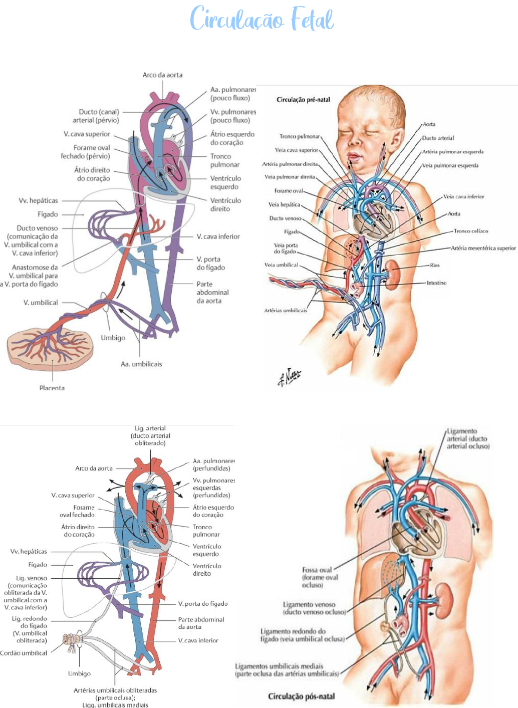 Medicina nove de julho – 2° semestre @ray.medd 1) Pré-natal 2) Pós-natal Medicina nove de julho – 2° semestre @ray.medd 3) Quais vasos constituem o cordão umbilical? Veia umbilical e Artérias umbilicais 4) Qual o único vaso da circulação fetal que tem sangue totalmente rico em O2? Veia umbilical 5) A veia umbilical se transforma em qual estrutura no neonato? Ligamento redondo do fígado 6) O ducto venoso se transforma em qual estrutura no neonato? Ligamento venoso 7) O forame oval se transforma em qual estrutura no neonato? O forame oval se fecha ao nascimento, formando a fossa oval 8) O ducto arterial se transforma em qual estrutura no neonato? Ligamento arterioso 9) As artérias umbilicais se transformam em qual estrutura no neonato? Ligamentos umbilicais medianos 10) Quais artérias dão origem as artérias umbilicais? Artérias ilíacas internas 11) Qual estrutura anatômica conecta o tronco pulmonar ao arco da aorta? Ducto arterial