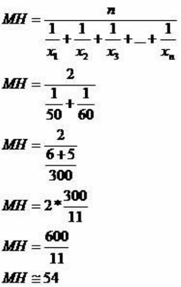 Média Harmônica A média harmônica está relacionada ao cálculo matemático das situações envolvendo as grandezas inversamente proporcionais. Como exemplo, temos a relação entre velocidade e tempo. Suponha que, em uma determinada viagem, um carro desenvolva duas velocidades distintas, durante a metade do percurso ele manteve a velocidade de 50 km/h e durante a metade restante sua velocidade foi de 60 km/h. Vamos determinar a velocidade média do veículo durante o percurso. De acordo com a média harmônica temos a seguinte relação: A velocidade média do veículo durante todo o percurso será de aproximadamente 54 km/h. Caso calculássemos a velocidade média utilizando a média aritmética chegaríamos ao resultado de 55 km/h. Esse valor demonstra que a velocidade e o tempo de percurso nos dois trechos seriam iguais. Mas precisamos considerar que no primeiro trecho o automóvel levou um tempo maior para o percurso, pois a velocidade era de 50 km/h e no segundo trecho o tempo decorrido foi menor, devido à velocidade de 60 km/h. Nesse momento, observamos a relação inversa entre velocidade e tempo e, para que não ocorra erro, é aconselhável nessas condições a utilização da média harmônica. Por Marcos Noé Graduado em Matemática Equipe Brasil Escola