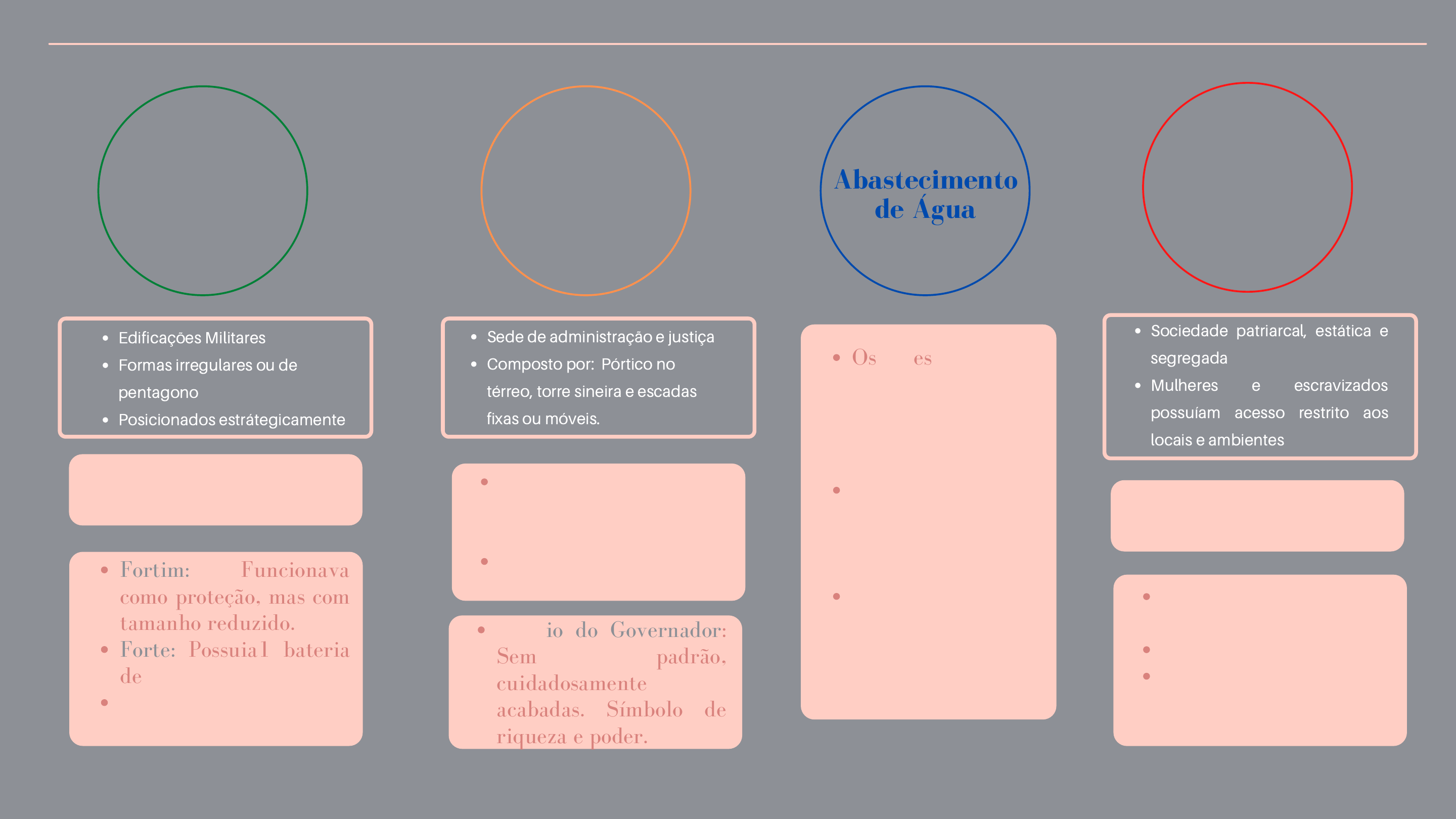Fortificações Edificações Militares Formas irregulares ou de pentagono Posicionados estrátegicamente Fortim: Funcionava como proteção, mas com tamanho reduzido. Forte: Possuia1 bateria de artilharia. Fortaleza: Possuía 2 ou mais baterias. + de 1300 fortes foram construídos Casa de Câmara e Cadeia / Palácio do Governador Sede de administração e justiça Composto por: Pórtico no térreo, torre sineira e escadas fixas ou móveis. Pavimento Inferior: Celas, para expor os escravizados. Pavimento Superior: Câmara. Palácio do Governador: Sem padrão, cuidadosamente acabadas. Símbolo de riqueza e poder. Abastecimento de Água Os escravizados chamados de "Aguadeiros" coletavam a água nos chafarizes. A água corria pelas canaletas dos aquedutos, por gravidade. Chafariz dividido em: Bebedouro, tanque e bebedouro para animais Habitação e Sociedade Sociedade patriarcal, estática e segregada Mulheres e escravizados possuíam acesso restrito aos locais e ambientes Setor Social/Trabalho: Térreo, salão, loja. Setor intimo: Alcovas. Setor Serviço: Sala da família, cozinha e quintal. O lote colonial era estreito e longo.