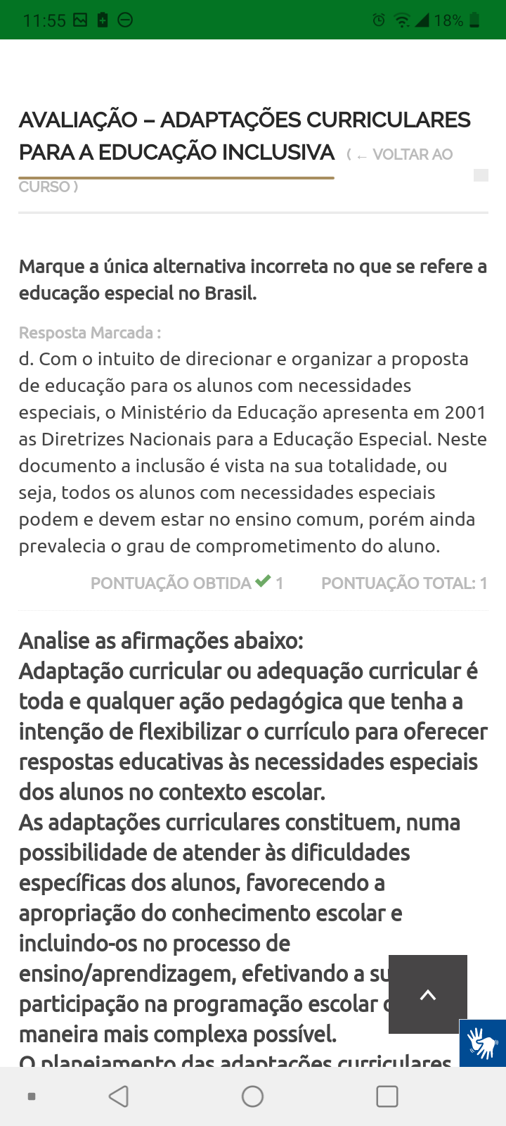 Marque a única alternativa incorreta no que se refere a educação especial no Brasil. Resposta Marcada : d. Com o intuito de direcionar e organizar a proposta de educação para os alunos com necessidades especiais, o Ministério da Educação apresenta em 2001 as Diretrizes Nacionais para a Educação Especial. Neste documento a inclusão é vista na sua totalidade, ou seja, todos os alunos com necessidades especiais podem e devem estar no ensino comum, porém ainda prevalecia o grau de comprometimento do aluno.
