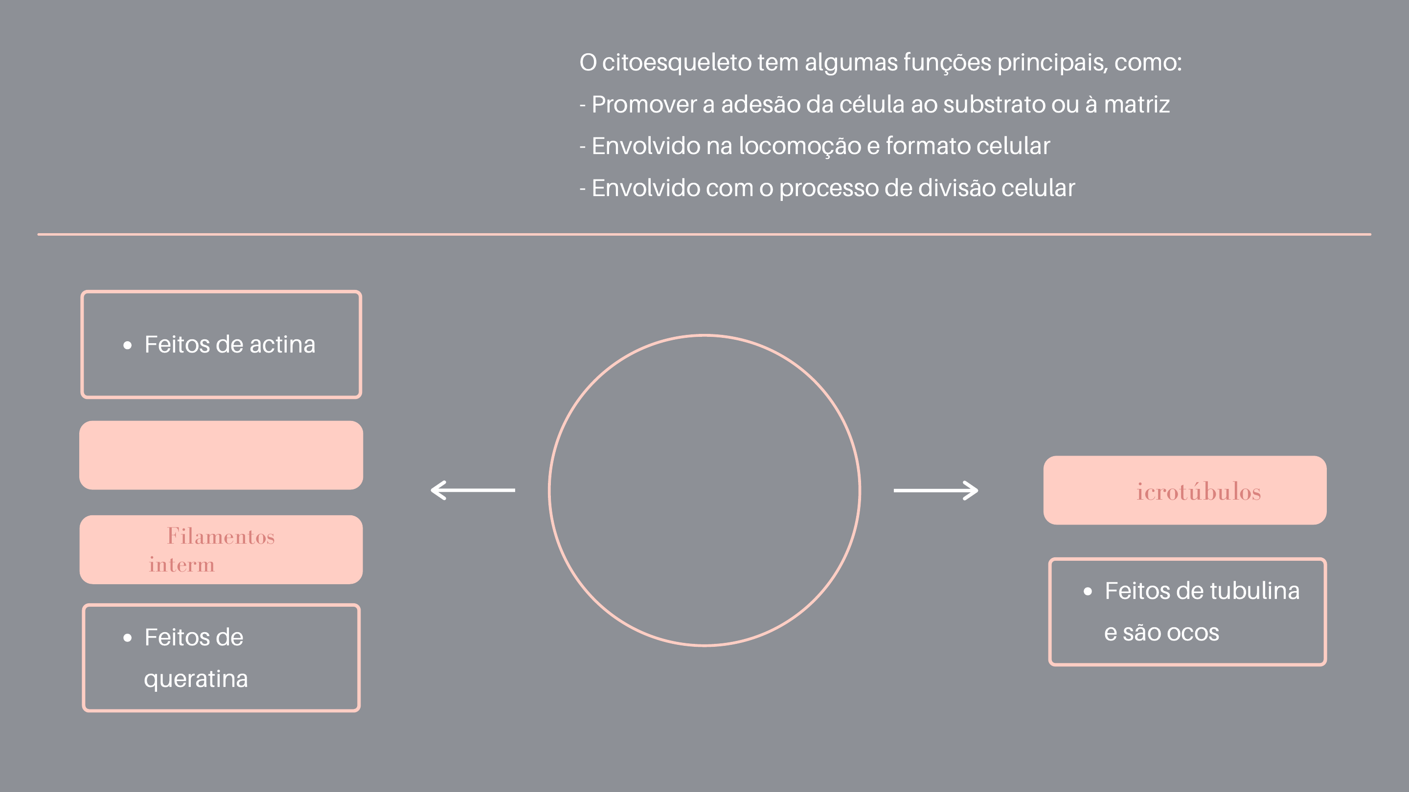 Citoesqueleto Componentes do citoesqueleto Feitos de actina Filamentos intermediários Feitos de queratina Microfilamentos Microtúbulos Feitos de tubulina e são ocos O citoesqueleto tem algumas funções principais, como: - Promover a adesão da célula ao substrato ou à matriz - Envolvido na locomoção e formato celular - Envolvido com o processo de divisão celular