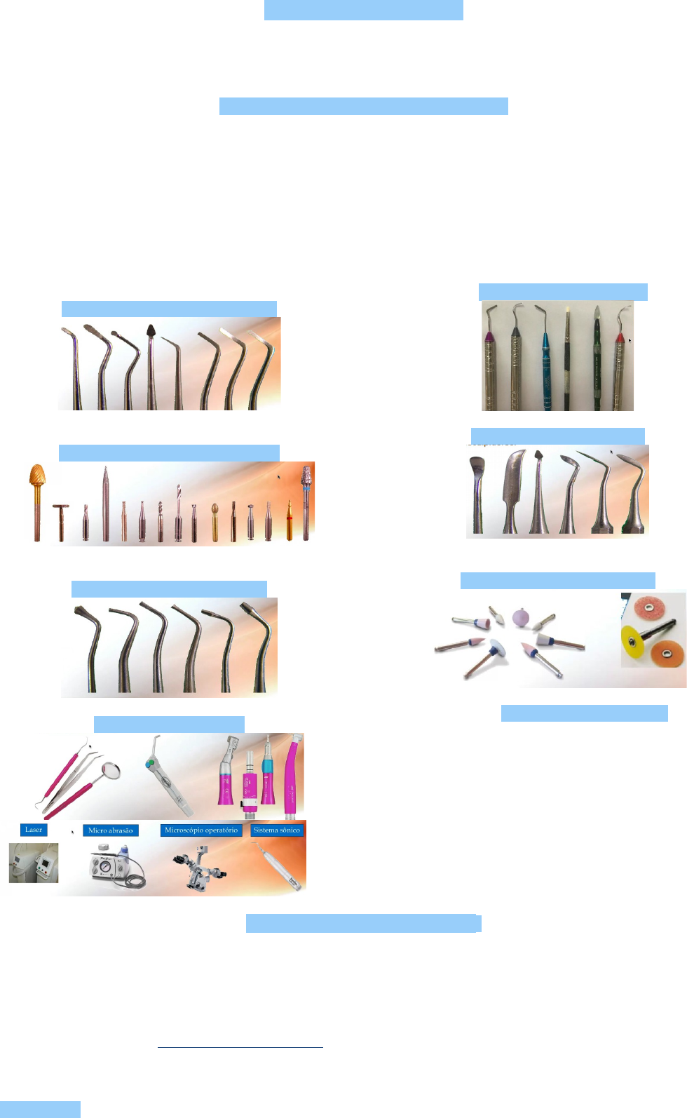 Instrumentos operatórios Para obtermos bons preparos cavitários, necessitamos usar instrumentos que nos deem condições para acessar a lesão cariosa possibilitando diferentes abordagens, de acordo com o tipo de procedimento a ser realizado. Classificação dos instrumentos operatórios · Cortantes manuais · Cortantes rotatórios · Condensadores · Inserção · Esculpidores · Polimento · Auxiliares · Alternativos (laser, sistemas sônicos, abrasão, ar) Instrumentos de inserção Instrumentos cortantes manuais Ex: Colher de dentina Instrumentos cortantes rotatórios Ex: Brocas Instrumentos condensadores Instrumentos auxiliares Instrumentos esculpidores Os três da direita ainda são utilizados Instrumentos para polimento Instrumentos alternativos Instrumentos cortantes manuais · No início eram grosseiros · Participavam diretamente na execução do preparo · Lâminas cortantes largas · Diminuíam o uso dos instrumentos rotatórios · Os instrumentos de Black são os que ficaram · Atualmente são menores e mais precisos · Com a evolução, instrumentos cortantes manuais foram substituídos em quase sua totalidade por instrumentos rotatorios de corte Finalidades: · Escavar e remover a dentina cariada · Cortar, clicar e planificar a estrutura dental. · Complementar a ação dos instrumentos rotatórios Constituição: Cabo · Oitavado e serrilhado para facilitar a preensão · Pode ter ponta ativa única ou dupla · Tem uma superfície lisa com a fórmula do instrumento em números Fórmulas dos instrumentos de black: Conjunto dos números, indicam característica da haste e lâmina A ordem numérica da formula indica: largura, comprimento e angulo A formula pode ser de 3 ou 4 números Além dos numeros da formula, há também o numero de serie do instrumento Fórmula de 3 números Instrumentos cuja extremidade cortante da lamina está em ângulo reto com o eixo longitudinal da própria lâmina. O 1° indica a largura da lamina (em décimos de mm) O 2° indica o comprimento da lâmina (em mm) O 3° indica o ãngulo entre a lâmina e o eixo longitudinal do cabo (em graus centesimais) Fórmula de 4 números Nos instrumentos cuja extremidade cortante da lâmina esta em angulação não perpendicular ao eixo longitudinal da lamina O 1° indica a largura da lamina (em décimos de mm) O 2° indica o ângulo formado pela extremidade cortante da lamina e o eixo longitudinal do inatrumento (em graus centesimais) O 3° indica o comprimento da lâmina (em mm) O 4° indica o ângulo entre a lâmina e o eixo longitudinal do instrumento (em graus centesimais) Intermediario, haste ou colo Parte que une a ponta ativa ao cabo do instrumento Pode ser mono, bi ou trianglado Monoangulado • Ângulo entre a haste e a ponta ativa; • São os cinzéis e a maioria das enxadas. Biangulado • Ângulo entre a haste e a ponta ativa; • Mais um ângulo ao longo da haste; • Algumas curetas, machados e cinzéis. Triangulado • Ângulo entre a haste e a ponta ativa; • Mais dois ângulos ao longo da haste; • Algumas curetas, machados e enxadas. Lâmina ou ponta ativa É a parte afiada que realiza função especifica e da nome ao instrumento Classificação Mondelli Cinzel reto Cinzéis monoangulados Cinzéis biangulados Machados Escavadores ou colheres de dentina Recortadores de margem gengival Formadores de ângulos Discóide e cleóide Equipamentos Histórico: 1871: Morrison adaptou o motor dentário a um amaquina de costura, transferindo a força dom operador para os pés. 1883: surgimento do motor elétrico dentário 1910: peça de mao com transmissão por correira 1950: surgimento da turbina de ar Turbina de alta rotação O sistema de impulsão dos nossos motores pode ser: Eletro-mecanico: motor elétrico Pneumático: micromotores (que é o que usamos) Velocidades: Baixa: menos de 6.000 rpm Média: entre 6.000 e 100.00 rpm Alta: acima de 100.000 rpm Os instrumentos rotatórios apresentam 3 partes: Haste: parte da broca que se conecta ao contra-ângulo, á turbina ou á peça de mão Intermediário: é a porção do instrumento que liga o cabo ou haste á ponta ativa. É mias delgado que o cabo para facilitar a visibilidade do operador Ponta ativa: é a parte de trabalho da broca, por isso mesmo é a parte do instrumento que apresenta maior variação Instrumentos rotatórios de corte Apresentam laminas cortantes para promover a redução de estrutura dental e de materiais odontológicos por ação de corte Classificação das brocas De acordo com o material fabricado: · Aço (liga ferro-carbono) · Caboneto de tungstênio (Carbide) De acordo com a ponta ativa Esférica: · · Remoção de tecido cariado · Confecção de retenções · Acesso a cavidade em dentes anteriores · Esférica lisa; ¼ a 11 · Esférica picotada: 502 a 507 · É a broca de eleição para começar qualquer acesso, são várias colheres de dentina Cilíndrica: · · Confecção de paredes circundantes paralelas · Avivas ângulos diedros · Cilíndrica lisa: 55 a 60 · Cilíndrica picotada: 556 a 562 · Cavidades que necessitam de uma maior retenção do material restaurador; · Promove preparos mais expulsivos, geralmente usada para restaurações indiretas. Uma vez que o corte dessa lamina é mais lateral e na base. Tronco- Cônica · · Determinar paredes circundantes expulsivas · Determinar sulcos ou canaletas em cavidades para RMF · Tronco-conica lisa: 600 a 602 · Tronco-conica picotada: 699 a 706 · Planifica e promove uma retenção devido ao seu formato Cone invertido · · Determinar retenções adicionais · Planificar paredes pulpares e axiais · Avivar ângulos diedros · Numerçao: 33 ¼ a 44 Roda · · Determinar retenções (especialmente em Classe 5 vedtibular) · Numerações: 11 ¼ a 22 Periforme ou forma de bala · · Determinar paredes convergentes · Determinar ângulos internos arredontados · Numerações: 329 a 322 e 331L a 333L · Preparo mais homogêneo que gera menos tenção de dor