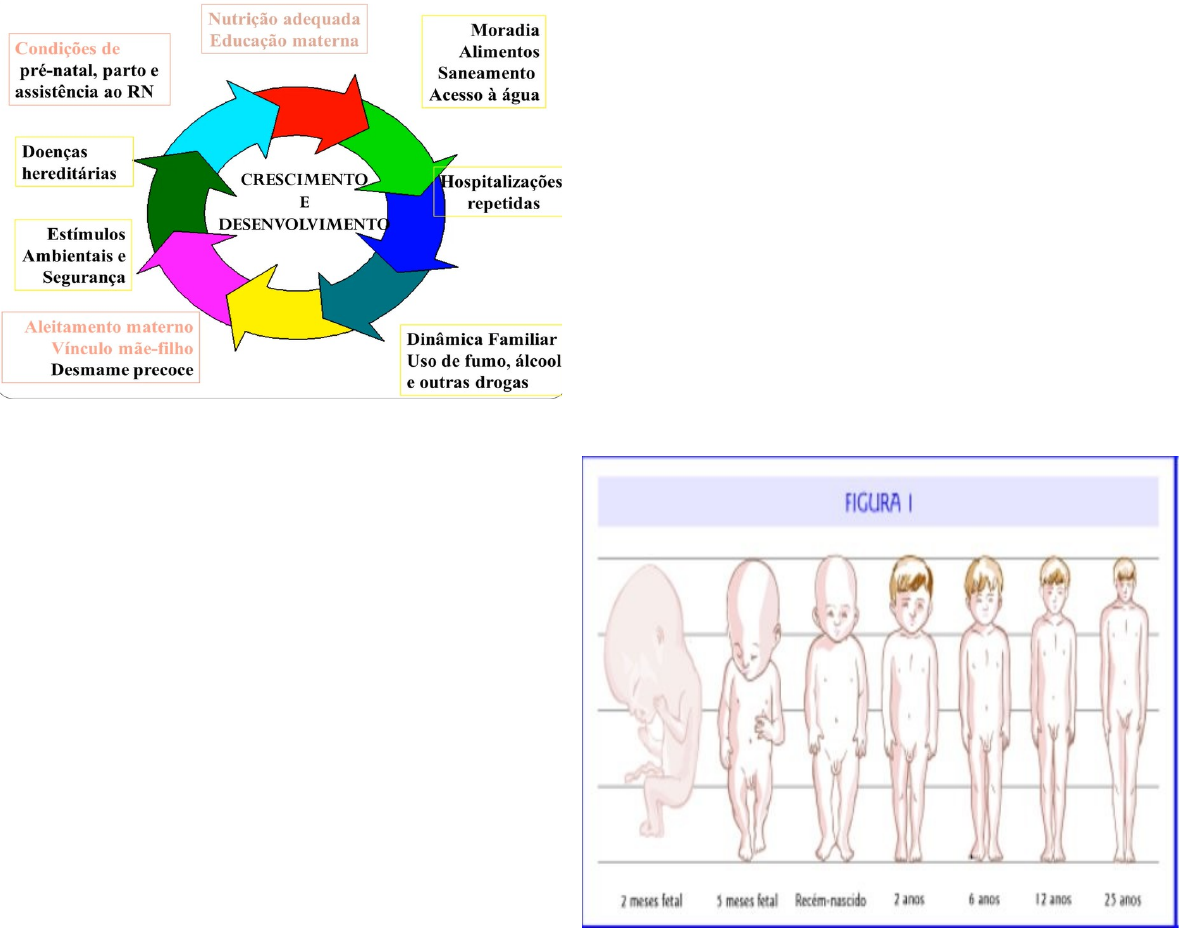 CRESCIMENTO: significa aumento físico do corpo, como um todo ou em suas partes, e pode ser medido em termos de centímetros ou de gramas. Traduz aumento do tamanho das células hipertrofia ou de seu número hiperplasia; (estatura, altura e peso)CRESCIMENTO E DESENVOLVIMENTO INFANTIL DESENVOLVIMENTO: é um conceito amplo que se refere a uma transformação complexa, contínua, dinâmica e progressiva, que inclui, além do crescimento, a maturação, a aprendizagem e os aspectos psíquicos e sociais; (reflexos, controle motor, por exemplo) Para o pleno desenvolvimento as crianças necessitam, além da saúde, de amor e segurança, novas experiencias, estímulos e de responsabilidades que gradativamente devam cumprir desde de sua infância; CRESCIMENTO O crescimento tem fatores influentes como por exemplo: o planejamento familiar, o pré-natal de qualidade, as doenças hereditárias, cuidados com o RN, acompanhamento do crescimento da criança; O crescimento é considerado um dos melhores indicadores de saúde da criança, em razão dos de sua extrema dependência de fatores extrínsecos (ambientais, alimentação, doenças, serviço de saúde, saneamento básico); O crescimento depende de fatores intrínsecos também, como: geneticamente determinados, genético, mal formação e metabólicos; A herança genética do ponto de vista do crescimento, quando recebida do pai e da mãe estabelece um potencial ou alvo que pode ser atingido: · No crescimento linear: o termo comprimento para crianças menores de 2 anos de idade (criança deitada) e altura a partir dos 2 anos de idade (criança/adulto em pé); · Na velocidade do crescimento das diferentes partes do corpo; · Na velocidade do crescimento das diferentes partes do corpo (linfoide, reprodutivo, cabeça e cérebro, gral); · A influência do meio ambiente ocorre desde a vida intrauterina, quando o crescimento é limitado a partir de um certo momento pelo espaço da cavidade intrauterina, até a idade adulta; A avaliação periódica do ganho de peso permite o acompanhamento do progresso individual de cada criança, identificando aquelas de maior risco de morbi/mortalidade, sinalizando o alarme precoce para a desnutrição, causa básica da instalação ou do agravamento da maior parte dos problemas de saúde infantil, também se atentando a obesidade que se caracteriza como um problema de saúde pública; METODOLOGIA DE AVALIZAÇÃO DE CRESCIMENTO As medidas antropométricas básicas são: o peso, a estatura (comprimento ou altura), o perímetro cefálico (cabeça da criança) e perímetro braquial; A partir dos índices antropométricos são construídos indicadores: 1) coletar medidas antropométricas com metodologia padronizada; 2) relacionar essas medidas com sexo, idade ou outra variável da criança (índices), comparando-as com os valores de referência; 3) verificar se os valores encontrados estão dentro dos limites (pontos de corte) estabelecidos como normais. DESENVOLVIMENTO É um conceito amplo que se refere a uma transformação complexa, continua, dinâmica e progressiva, que inclui, além do crescimento, a maturação, a aprendizagem e os aspectos psíquicos e sociais; INFLUÊNCIA DE FATORES Intrínsecos: determinam as características físicas da criança, cor dos seus olhos e outros atributos geneticamente determinados; Extrínsecos: estando diretamente relacionados com o ambiente da vida intrauterina, proporcionando pela mãe por meio das suas condições de saúde e nutrição; A equipe deverá conhecer os aspectos mais relevantes do desenvolvimento e estar preparada para fazer algumas intervenções, se necessário, mas principalmente identificar com clareza aquelas crianças que devem ser referidas para tratamento especializado; CARACTERÍSTICAS BIOLÓGICAS Posição supina (RN) – posição ereta: desenvolvimento motor; Aparelho visual e flexibilidade visual – visão e movimentos finos e motores; Capacidade de comunicação – competência auditiva e a escuta; Evolução social – adaptação com meio; FATORES DE MATURAÇÃO NEUROLÓGICA Modificações anatômicas: estruturais, bioquímicas, funcionais, processos emocionais, processos cognitivos e experiências e aprendizagem; ETAPAS DO DESENVOLVIMENTO Período pré-natal: da concepção ao nascimento; Período neonatal: 0 a 28 dias de vida; Primeira infância: lactente (29 dias a 2 anos exclusive); Infância (segunda infância ou pré-escolar 2 a 6 anos exclusive); PERÍODO PRÉ-NATAL: a criança existe para a mãe mesmo antes de nascer, ou até mesmo antes de ser concebida, e esse desejo materno pelo filho pode influenciar vários aspectos do seu desenvolvimento. PERÍODO NEONATAL: as respostas a estímulos evoluem de reflexos generalizados, envolvendo todo o corpo para ações voluntarias: reflexos corticais; O bebê começa a formar a imagem do seu corpo, a partir das atividades exploratórias de seu próprio corpo, através do olhar da mãe. Assim, nesse mundo a dois, vai constituir a noção de si mesmo; INFÂNCIA: Época dos jogos simbólicos, ou seja, das brincadeiras do faz-de-contas, onde a criança é capaz de fazer-se passar por um outro, encenando um personagem; MARCOS DO DESENVOLVIMENTO DA CRIANÇA O bebê deve começar a mamar logo após o nascimento. O bebê gosta de ouvir a mãe falar e cantarolar enquanto cuida dele. Ele já consegue demonstrar sinais de prazer (sorrir) e desconforto (chorar ou resmungar); (1 A 2 MESES) O bebê fica protegido pelo leite materno e raramente adoece; No colo da mãe, se sente seguro e acalentado; Ele gosta de ficar em várias posições e olhar para objetos coloridos. Mas rosto sobretudo, gosta de ver o da mãe; Responde ao sorriso. OBS: lembrando que os RN prematuros não irão responder da mesma forma; (3 A 4 MESES) O bebê está bem mais ativo: olha para quem o observa, acompanha com o olhar e responde com balbucios quando alguém conversa com ele; Gosta de pôr as mãos e objetos na boca; Aprecia a companhi