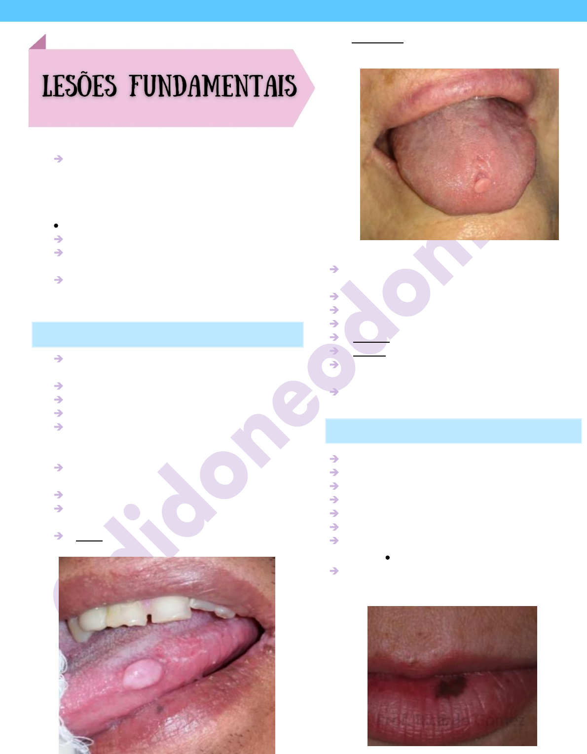 PATOLOGIA BUCAL @DIDONEODONTO Resumo por: Giovana Didoné O reconhecimento da lesão fundamental é o primeiro passo no estabelecimento da hipótese diagnóstica. Formular hipóteses de diagnóstico: História clínica da doença; Característica (s) da (s) lesão/lesões produzida (s); Semelhanças nos aspectos clínicos. Características: Localização: mucosa jugal, labial, palato duro; Tamanho: em mm ou cm; Limites: área da lesão; Número: única, múltiplas; Forma: oval, circular, lentiliforme, cordoniforme, linear, globosa, arredondada, elevada. Cor: enegrecida, acastanhada, esbranquiçada, semelhante a mucosa, azulada; Bordas: elevadas, deprimida, irregulares; Base: consistente, infiltrada, mole, séssil, pediculada; *Séssil: tem a base mais alargada; *Pediculada: são sustentados por uma haste (ou pedículo). Consistência: fibrosa, borrachosa, flácida, endurecida*, elástica; Superfície: brilhante, opaca; Textura: lisa, rugosa, papulosa; Contorno: - Nítidos: bem definido; - Difuso: não definidos, regulares, irregular; Fundo: necrótico, purulento, granuloso, hemorrágico; Profundidade: rasa, profunda. Tipos de Lesões Fundamentais: Mácula ou mancha (alteração de cor); Pápula; Placa; Vesícula ou bolha; Nódulo; Erosão; Úlcera. Mancha ou máculas: Alteração de cor sem elevação ou depressão, sua pigmentação pode ser endógena ou exógena. PATOLOGIA BUCAL @DIDONEODONTO Resumo por: Giovana Didoné Vitropressão: Vitroscopia ou manobra de vitropressão é uma manobra de que consiste na pressão de uma lâmina de vidro, contra alguma lesão cutânea. O intuito de tal manobra é de verificar se a lesão é vascular ou não. Pápula: Lesão circunscrita sólida, elevada; Pode ser séssil ou pediculada; Até de 5 mm de diâmetro; Placa papulosa: aglomeradas/projeções; Exs: Estomatite nicotínica, grânulos de Fordyce. Estomatite nicotínica na imagem acima. Nódulo: Lesão circunscrita sólida; Pode ser séssil ou pediculado; Até 3 cm diâmetro; Endofítico ou exofítico; *Endofítico: dentro da mucosa, precisa palpar para sentir. *Exofítico: fora da mucosa, não precisa palpar para sentir. Exs: Lesões proliferativas não neoplásicas. Placa: Área ou zona mais elevada que a superfície adjacente, mais extensa do que alta; Pode variar: cor, superfície, limite, textura, forma, contorno, número; Exs: leucoplasias, queratoses irritativas, líquen plano. PATOLOGIA BUCAL @DIDONEODONTO Resumo por: Giovana Didoné Vesículas e Bolhas: São elevações teciduais com conteúdo líquido; Vesícula até 3 mm; Bolha acima de 3 mm; Serosas, sanguinolentas, pustulosas; Pode ser: - intra - epitelial ou supra – basal; - sub - epitelial ou juncional; Importante: raramente são encontradas íntegras na cavidade bucal. Erosão: Perda parcial do epitélio sem exposição do tecido conjuntivo muitas vezes secundariamente à ruptura de uma vesícula ou bolha . Ex: líquen plano erosivo, língua geográfica. Úlcera ou ulceração. Perda total do epitélio com exposição do conjuntivo, muitas vezes se apresenta deprimida ou escavada