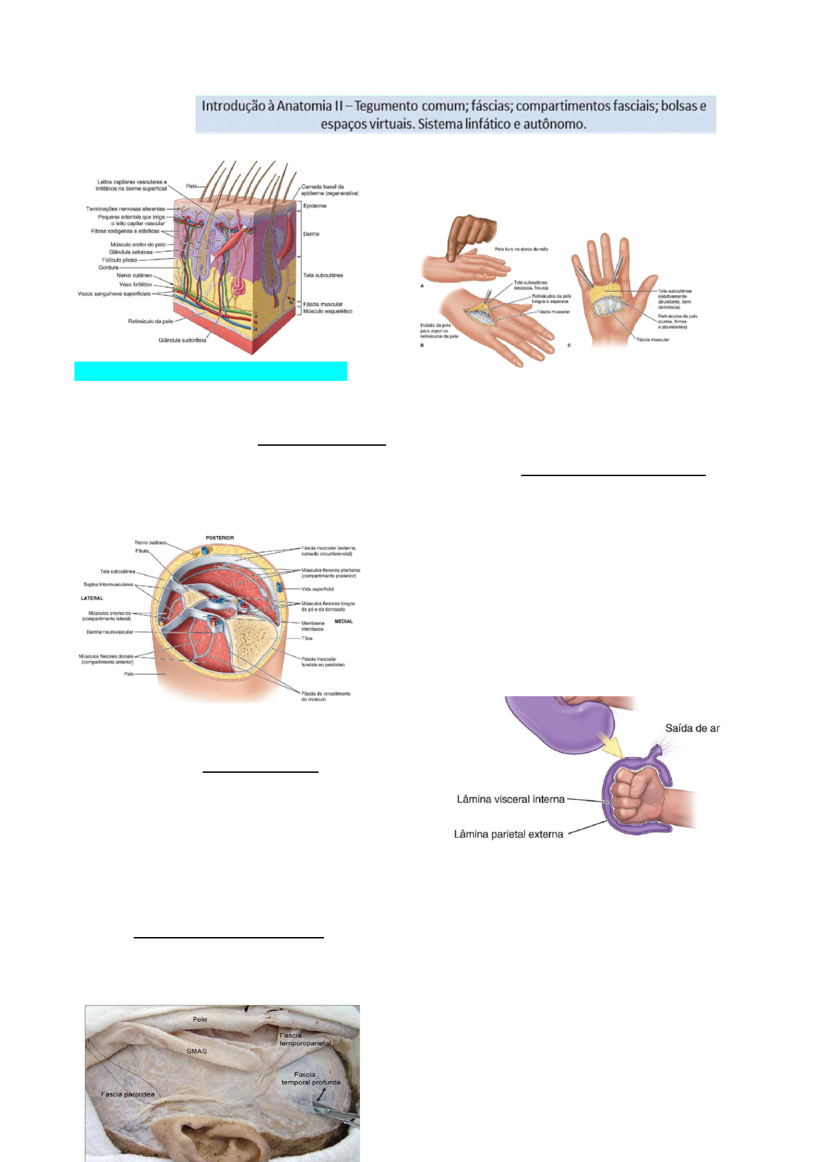 Anatomia II Aula 1 Sistema fascial m I. Fáscias: membranas de TC denso desprovido de gordura que reveste os músculos e outras estruturas do corpo. As fáscias profundas formam compartimentos nos membros através dos chamados septos intermusculares, que se estendem desde a bainha fascial até se fixarem nos ossos. -Sua espessura pode variar. - Limita a expansão externa dos ventres dos músculos esqueléticos que se contraem. Subdivisão: ➤Fáscia/Tela subcutânea: região situada entre a pele sobrejacente (derme) e a fáscia muscular subjacente profunda, constituição: TC frouxo e adiposo: -Camada externa = panículo adiposo -Camada interna= geralmente sem gordura e com muito tecido elástico. -Contém glândulas sudoríferas, vasos sanguíneos superficiais, vasos linfáticos e nervos cutâneos . As estruturas neurovasculares da pele (nervos cutâneos, vasos superficiais) seguem na tela subcutânea, distribuindo apenas seus ramos terminais para a pele. ➤Fáscia profunda/muscular: Cobre diretamente os músculos. Formada por TC denso modelado. ➤Fáscia subserosa/ visceral: entre a camada de revestimento interno da fáscia profunda e as membranas serosas. II. Retináculos: Espessamento acentuado da fáscia muscular em regiões específicas para estabilizar os tendões dos músculos. B. Retináculos da pele longos e relativamente esparsos possibilitam a mobilidade da pele demonstrada na parte A. C. A pele da palma (como a da planta do pé) está firmemente ligada à fáscia muscular subjacente pelos retináculos curtos, densos e espessos. III. Bolsas: sacos ou envoltórios fechados de túnica serosa (delicada membrana de TC que secreta um líquido para lubrificar a face interna lisa). Podem formar espaços pela liberação desse líquido: condição patológica. -Bolsas subcutâneas: são encontradas na tela subcutânea entre a pele e as proeminências ósseas, como o cotovelo ou o joelho; - Bolsas subfasciais: situam-se sob a fáscia muscular; - Bolsas subtendíneas: facilitam o movimento dos tendões sobre o osso. - Bainhas sinoviais dos tendões são um tipo especializado de bolsas alongadas que envolvem os tendões, geralmente quando atravessam túneis osteofibrosos que fixam os tendões no lugar ~Analogia ao balão úmido: lâmina parietal e visceral.