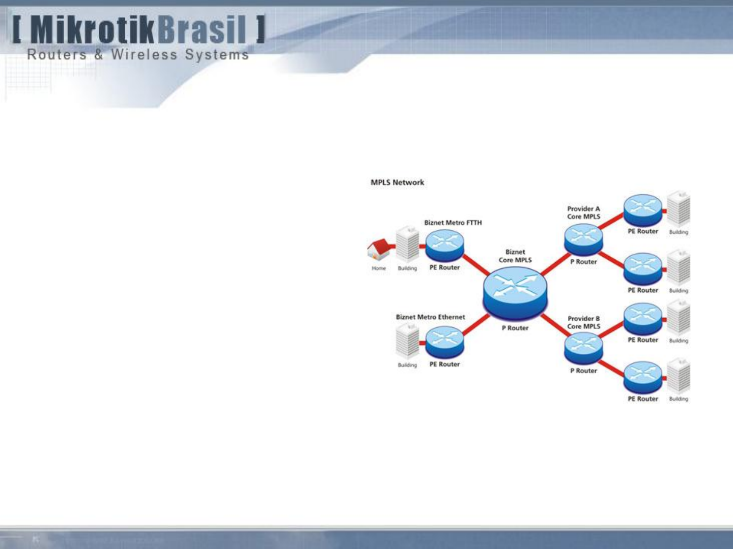 MPLS Multi Protocol Label Switching 2 Nome: Edson X. Veloso Júnior Engenheiro em Eletrônica Provedor de Internet desde 2002 Integrante da equipe de instrutores da MikrotikBrasil desde 2007 Certificado Mikrotik: MTCNA, MTCWE, MTCUME, MTCRE and MTCINE Certificado Trainer Mikrotik Discussão sobre topologias usuais de redes Switching, Bridging, Redes IP, etc 3 Típica Rede em Camada 2 Exemplos de tecnologia empregadas: ATM, Frame Relay, Ethernet, etc Rede Roteada Gateway dos clientes é distribuido e próximo aos clientes Domínios de broadcast segregados Mesmo nas redes roteadas podem haver segmentos em camada 2 Rede Roteada com Concentrador PPPoE “Bridge over Routing” Uso de protocolo de roteamento dinamico, porém com Túneis transparentes até o concentrador. Routing x Bridging x Switching Routing x Bridging x Switching Bridging e Switching ocorrem na camada II, porém em níveis distintos. O processo de Switching é normalmente mais rápido (“wire speed”) O processo de Routing requer a consulta a tabelas de roteamento e por isso precisa examinar o cabeçalho do pacote 7 Bridge Switch REDE ENLACE FÍSICA TRANSPORTE APRESENTAÇÃO APLICAÇÃO SESSÃO Routing Switching Switching é um método de comunicação em redes que agrupa os dados transmitidos em pacotes de tamanhos determinados, independetemente de seu conteúdo, tipo ou estrutura. Cada bloco é então transmitido de forma independente e a rede é capaz de alocar os recursos de transmissão conforme a necessidade, otimizando dessa forma a capacidade de utilização dos links. 8 9 MPLS – Multi Protocol Label Switching MPLS, ou MultiProtocol Label Switching, é uma tecnologia de encaminhamento de pacotes baseada em rótulos (labels) que funciona, basicamente, com a adição de um rótulo nos pacotes de tráfego (O MPLS é indiferente ao tipo de dados transportado, pode ser tráfego IP ou outro qualquer) à entrada do backbone (chamados de roteadores de borda) e, a partir daí, todo o roteamento pelo backbone passa a ser feito com base neste rótulo. Substitui a decisão de roteamento IP por pacotes (baseada em campos do cabeçalho IP, normalmente endereço IP de destino) e tabelas de roteamento. Esta abordagem acelera o processo de roteamento porque a pesquisa do próximo salto (hop) se torna muito simples comparado ao roteamento por lookup. Eficiência do encaminhamento de pacotes é a maior vantagem do MPLS. Cada rótulo representa um índice na tabela de roteamento do próximo roteador. Pacotes com o mesmo rótulo e mesma classe de serviço são indistingüiveis entre si e por isso recebem o mesmo tipo de tratamento. O objetivo de uma rede MPLS não é o de se conectar diretamente a sistemas finais. Ao invés disto ela é uma rede de trânsito, transportando pacotes entre pontos de entrada e saída. 10 Cabeçalho MPLS Também chamado de Layer 2.5 (porque está localizado entre o Layer 2 e Layer 3 do modelo OSI) MPLS L2 L3 LABEL EXP S TTL O cabeçalho pode ser formado por um ou vários campos 32bit: Label (20 bits) - Rótulo EXP (3 bits) – Classe do Serviço (experimental) End of stack flag(1 bit) – Fim da pilha TTL (8 bits) – Tempo de vida MPLS – Multi Protocol Label Switching Ele é chamado de multiprotocolo pois pode ser usado com qualquer protocolo da camada 3, apesar de quase todo o foco estar voltado no uso do MPLS com o IP. Este protocolo é na verdade um padrão que foi feito com base em diversas tecnologias similares desenvolvidas por diferentes fabricantes. Ele é referido por documentos do IETF como sendo uma camada intermediária entre as camadas 2 e 3, fazendo com que estas se “encaixem” melhor. 11 MPLS – Histórico → O MPLS surgiu como uma resposta de fabricantes de equipamentos e centros de pesquisa a várias necessidades que surgiram com a popularização da internet e diversificação de seus serviços. → Talvez a mais primordial destas necessidades seja a sobrecarga que esta sendo aplicada aos roteadores da rede devido ao sempre crescente número de usuários. Os roteadores IP possuem um algoritmo de roteamento que é ineficiente a medida que o tamanho da rede cresce pois para definir qual será o próximo salto (hop) do pacote, cada roteador tem que analisar mais informações do que é realmente necessário. → Além disso cada roteador tem que realizar o mesmo processo, que é muito semelhante para todos os roteadores, para cada um dos pacotes, sem guardar nenhum tipo de memória sobre cada pacote. Isto é especialmente ineficiente devido ao fato de que a maioria dos pacotes IP pertencem na verdade a fluxos de pacotes com mesmas origens e destinos. → Outro fator extremamente importante é o custo dos roteadores. Esse custo é em geral muito elevado, o que exige grandes investimentos quando surge a necessidade de se aumentar a rede. 12 → Com base nestes fatores pode-se chegar a conclusão de que uma rede baseada no algoritmo de roteamento padrão das redes IP não é escalonável. Ou seja, não é possível aumentar-se o tamanho de uma rede indefinidamente pois por mais rápidos que os roteadores sejam individualmente, a repetição excessiva de tarefas semelhantes torna o atraso da rede proibitivo. → Ficou claro então a necessidade de novos algoritmos de roteamento. Porém, agora entra em cena um outro fator. Mesmo que fosse desenvolvido um algoritmo de roteamento extremamente eficiente, este não seria muito útil se não fosse compatível com os protocolos e equipamentos já existentes. → Junto a todos estes fatores pode-se somar a necessidade de novas funcionalidades de roteamento como por exemplo as classes de serviço. Isto decorre do aparecimento de tecnologias como vídeo e voz sobre IP que são extremamente sensíveis ao atraso, em especial atrasos diferenciados para pacotes de um mesmo fluxo. Para ajudar a resolver este problema é necessário se dar prioridade a esses tipos de pacotes, e essa priorização não é suportada por roteadores IP padrão. MPLS – H