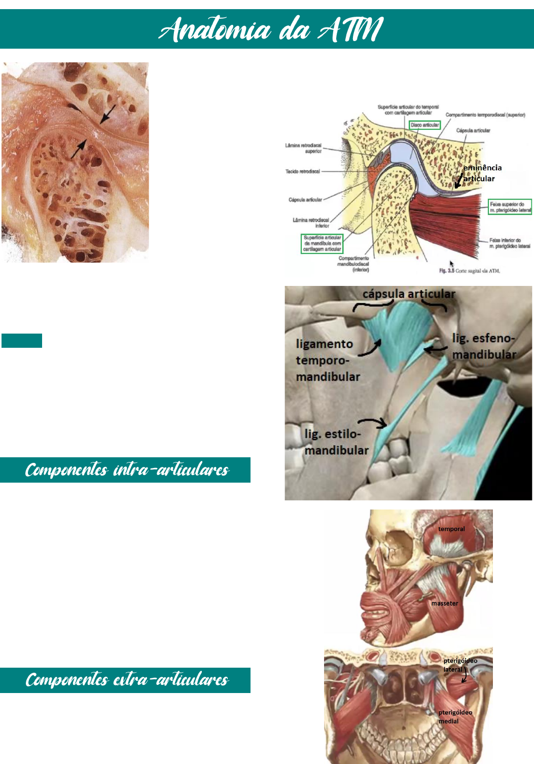 Articulação Temporo- mandibular • A mais complexa do corpo humano, de relação direta e indireta com várias estruturas relacionadas. • Diartrodial (por ser descontínua de 2 ossos; lado direito trabalhando síncrono com o esquerdo = bicondilares; articulação em gínglimo, diartrose, sinovial) Função: regular e realizar os movimentos da Mandíbula e permitir amplos movimentos de forma sincronizada (articulação dinâmica). Essa sincronização torna possível a plena eficiência dos processos de mastigação, deglutição, respiração e fala. Associados a região interna da articulação. ‣ Superfícies articulares ‣ Cabeça/Côndilo da Mandíbula ‣ Fossa articular ‣ Eminência articular ‣ Disco articular ‣ Membrana sinovial (revestimento) ‣ Líquido sinovial (sinóvia) ‣ Cartilagem articular Associados a região externa da articulação. ‣ Cápsula articular (delimita a ATM – o que é intra x extra) ‣ Ligamento temporomandibular ‣ Ligamento esfenomandibular ‣ Ligamento estilomandibular ‣ Músculos da mastigação O Disco Articular é de tecido conjuntivo fibrocartilaginoso denso, avascular e aneural. Inserção: região posterior retrodiscal Possuem a capacidade de prender as bordas medial e lateral do Disco à cabeça da Mandíbula. Ajuda a delimitar os espaços articulares superior e inferior. Sendo o Tecido Retrodiscal altamente vascularizado e inervado. Porção posterior: funde-se com a parede posterior da cápsula articular, formando o tecido retrodiscal/zona bilaminar (tecido conjuntivo frouxo com fibras elásticas, ricamente vascularizada e inervada). Porção medial e lateral: fundem-se com a cápsula articular – ligamentos colaterais lateral e medial. Funções: garantir uma superfície articular móvel e distribuição de carga ideal. Rotação (gira sem sair da cavidade articular) e Translação (sai da cavidade articular). Com redução: volta para posição após abertura de boca/translação. Sem redução: não volta para a posição original após abertura de boca. Íntima relação com o Nervo Facial, apesar de não ser ele o responsável pela sua inervação. Deposição de cartilagem (branco) - maior deposição cartilagem em regiões onde a mandíbula “trabalha/movimenta-se” mais