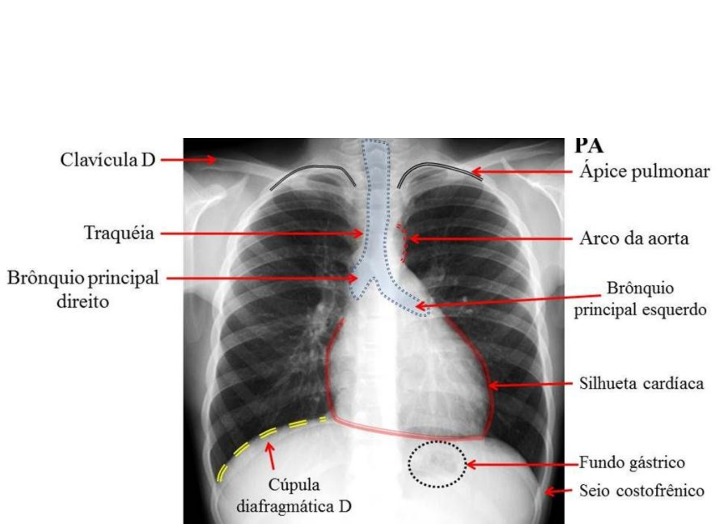 Exames de Imagem @vidadefisio_study Raio X de Toráx Hemograma O hemograma é uma das análises de sangue mais úteis e mais solicitadas na prática clínica. Células que estudamos através do hemograma: Hemácias (glóbulos vermelhos). Leucócitos (glóbulos brancos). Plaquetas. A- ERITROGRAMA: O eritrograma é a primeira parte do hemograma. É o estudo dos glóbulos vermelhos (hemácias/eritrócitos). Os três primeiros dados, contagem de hemácias, hemoglobina e hematócrito, são analisados em conjunto. Quando estão reduzidos, indicam anemia, isto é, baixo número de glóbulos vermelhos no sangue Quando estão elevados indicam policitemia, que é o excesso de hemácias circulantes. Se por um lado a falta de hemácias prejudica o transporte de oxigênio, por outro, células vermelhas em excesso deixam o sangue muito espesso, atrapalhando seu fluxo e favorecendo a formação de coágulos e trombose. B- LEUCOGRAMA: É a parte do hemograma que avalia os leucócitos (glóbulos brancos) São as células de defesa responsáveis por combater agentes invasores. O valor normal dos leucócitos varia entre 4000 a 11000 células por microlitro (ou milímetros cúbicos). • LEUCOCITOSE= leucócitos aumentados – (Infecção bacteriana/Leucemia) • LEUCOPENIA= leucócitos diminuídos - (Infecção viral/ Imunossupressão) Existem cinco tipos de leucócitos, cada um com suas particularidades: 1) Neutrófilos: Quando temos um aumento do número de leucócitos totais, causado basicamente pela elevação dos neutrófilos, estamos provavelmente diante de um quadro infeccioso bacteriano. 2) Segmentados e bastões: Os bastões são os neutrófilos jovens. Quando estamos infectados, a medula óssea aumenta rapidamente a produção de leucócitos e lança na corrente sanguínea, neutrófilos jovens recém-produzidos. A infecção deve ser controlada rapidamente. Os segmentados são os neutrófilos maduros. Quando o paciente não está doente ou já está em fase final de doença, praticamente todos os neutrófilos são segmentados, ou seja, células maduras. 3) Linfócitos: Quando temos um processo viral em curso, é comum que o número de linfócitos aumente, às vezes, ultrapassando o número de neutrófilos. Os linfócitos são as células que fazem o reconhecimento de organismos estranhos, iniciando o processo de ativação do sistema imune. 4) Monócitos: Quando um tecido está sendo invadido por algum germe, o sistema imune encaminha os MONOCITO para o local infectado. Este se ativa, transformando-se em MACROFAGO, uma célula capaz de “comer” micro-organismos invasores. Os monócitos tipicamente se elevam nos casos de infecções, principalmente naquelas mais crônicas, como a tuberculose. 5) Eosinófilos: Os eosinófilos são os leucócitos responsáveis pelo combate de parasitas e pelo mecanismo da alergia. O aumento de eosinófilos ocorre em pessoas alérgicas, asmáticas ou em casos de infecção intestinal por parasitas. 6) Basófilos: Sua elevação normalmente ocorre em processos alérgicos e estados de inflamação crônica. C- PLAQUETAS: As plaquetas são fragmentos de células responsáveis pelo início do processo de coagulação. • O valor normal das plaquetas varia entre 150.000 a 450.000 por microlitro (uL). Porém, até valores próximos de 50.000, o organismo não apresenta dificuldades em iniciar a coagulação. • Quando os valores se encontram abaixo das 10.000 plaquetas/uL há risco de morte, uma vez que pode haver sangramentos espontânea. @vidadefisio_study Como interpretar o hemograma corretamente Diagnóstico de anemia: Caracterizada por hemoglobina < 13,5 g/dL e/ou hematócrito < 41 % em homens, e hemoglobina < 12,0 g/dL e/ou hematócrito < 36% em mulheres. Volume Corpuscular Médio (VCM): Considera-se normal de 80-100 fL. • < 80 fL = Microcitose: Anemia ferropriva; talassemias; anemia sideroblásticas; anemia de doença crônica (tardia); deficiência de cobre; • 80-100 fL = Normocitose: Anemia ferropriva (precoce); anemia de doença crônica; perda aguda de sangue; doença renal crônica; anemia aplásica e supressão medular; hipotireoidismo; hipopituitarismo; • > 100 fL = Macrocitose: Abuso de álcool; deficiência de ácido fólico; deficiência de vitamina B12; reticulocitose (recuperação de anemias hemolíticas, carenciais e sangramentos); síndromes mielodisplásicas; leucemia mielóide aguda; hepatopatia crônica; medicamentos (ex.: zidovudina, hidroxiureia); hipotireoidismo; • >115 fL: Macrocitose > 115 fL é quase que exclusivamente causada por deficiência de vitamina B12 e/ou ácido fólico. Você sabe o impacto de um “simples” hemograma? Hemoglobina Corpuscular Média (HCM): Considera-se normal de 28-34 g/dL de hemácias. • < 28 = Hipocromia: Anemia ferropriva; talassemias; • > 34 = Hipercromia: Costuma acompanhar macrocitoses. Concentração de Hemoglobina Corpuscular Média (CHCM): Considera-se normal de 31-36 g/dL de hemácias. • < 31: Anemia ferropriva; talassemias; • > 36: Esferocitose (hereditária ou adquirida); doença falciforme e hemoglobinopatia C. Reticulócitos: revela a atividade medular de produção de eritrócitos, estando aumentado em estados hiperproliferativos e diminuído em estados hipoproliferativos. • Aumentados: Reflete uma resposta hematopoiética aumentada (hemólise contínua ou perda de sangue); • Diminuídos: Reflete uma resposta hematopoiética inadequada (anemia aplásica, invasão medular, infecção, quimioterapia e outras causas de supressão medulares). Série Branca: pode sugerir a causa diagnóstica subjacente: • Leucopenia: Pode sugerir anemia aplásica; • Leucocitose: Pode refletir presença de infecção, inflamação sistêmica ou neoplasia hematológica; • Monocitose: Pode refletir a presença de síndrome mielodisplásica; • Neutropenia: Pode ser consequente de tratamento quimioterápico; • Linfopenia: Pode ser consequente a infecção por HIV ou outros vírus. Plaquetas: