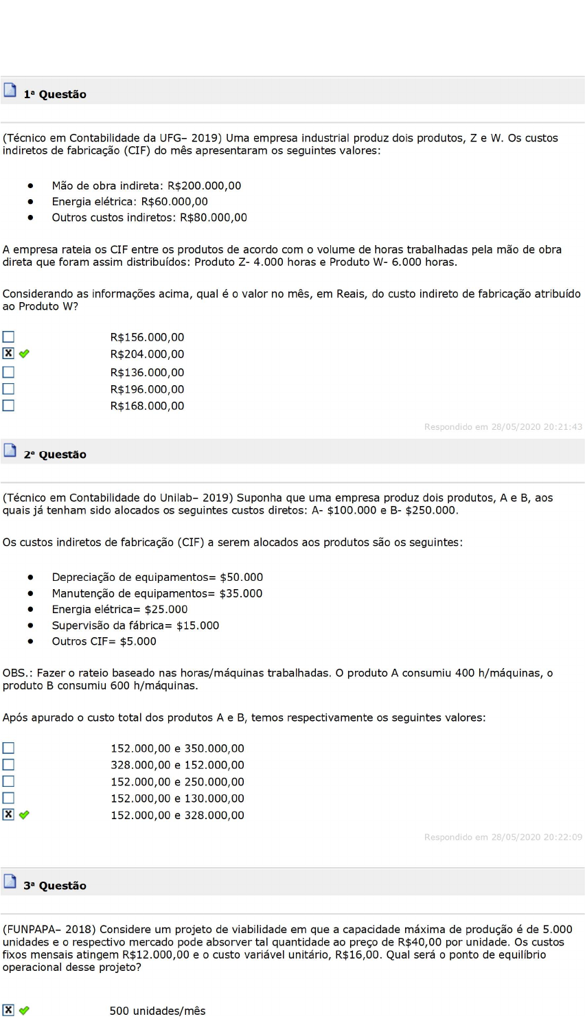 BASES DE GESTÃO 9a aula 1a Questão (Técnico em Contabilidade da UFG‒ 2019) Uma empresa industrial produz dois produtos, Z e W. Os custos indiretos de fabricação (CIF) do mês apresentaram os seguintes valores: Mão de obra indireta: R$200.000,00 Energia elétrica: R$60.000,00 Outros custos indiretos: R$80.000,00 A empresa rateia os CIF entre os produtos de acordo com o volume de horas trabalhadas pela mão de obra direta que foram assim distribuídos: Produto Z- 4.000 horas e Produto W- 6.000 horas. Considerando as informações acima, qual é o valor no mês, em Reais, do custo indireto de fabricação atribuído ao Produto W? R$156.000,00 R$204.000,00 R$136.000,00 R$196.000,00 R$168.000,00 Respondido em 28/05/2020 20:21:43 2a Questão (Técnico em Contabilidade do Unilab‒ 2019) Suponha que uma empresa produz dois produtos, A e B, aos quais já tenham sido alocados os seguintes custos diretos: A- $100.000 e B- $250.000. Os custos indiretos de fabricação (CIF) a serem alocados aos produtos são os seguintes: Depreciação de equipamentos= $50.000 Manutenção de equipamentos= $35.000 Energia elétrica= $25.000 Supervisão da fábrica= $15.000 Outros CIF= $5.000 OBS.: Fazer o rateio baseado nas horas/máquinas trabalhadas. O produto A consumiu 400 h/máquinas, o produto B consumiu 600 h/máquinas. Após apurado o custo total dos produtos A e B, temos respectivamente os seguintes valores: 152.000,00 e 350.000,00 328.000,00 e 152.000,00 152.000,00 e 250.000,00 152.000,00 e 130.000,00 152.000,00 e 328.000,00 Respondido em 28/05/2020 20:22:09 3a Questão (FUNPAPA‒ 2018) Considere um projeto de viabilidade em que a capacidade máxima de produção é de 5.000 unidades e o respectivo mercado pode absorver tal quantidade ao preço de R$40,00 por unidade. Os custos fixos mensais atingem R$12.000,00 e o custo variável unitário, R$16,00. Qual será o ponto de equilíbrio operacional desse projeto? 500 unidades/mês 400 unidades/mês 300 unidades/mês 200 unidades/mês 600 unidades/mês Respondido em 28/05/2020 20:22:52 4a Questão (Auditor Fiscal da Prefeitura de São José do Rio Preto‒ 2019) Considere uma empresa industrial com os seguintes dados relativos ao exercício de 2019: Custos variáveis de produção= R$50,00 por unidade. Custos e despesas fixas= R$6.000,00 no exercício. Preço de venda= R$80,00 por unidade. Assuma que a empresa teve toda a produção acabada e que vendeu tudo o que produziu (ou seja, os saldos iniciais e finais para os estoques de [I] produto em processamento e [II] de produção acabada são iguais a zero). O ponto de equilíbrio contábil (PEC) é de: 130 unidades. 200 unidades. 120 unidades. 180 unidades. 75 unidades. Respondido em 28/05/2020 20:23:13 BASES DE GESTÃO 10a aula 1a Questão Fernando sabe que precisa implantar uma profunda mudança em seu perfil como gestor, desenvolvendo competências mais contemporâneas, por exemplo: I- Tecnologia, design e programação. II- Liderança e influência social. III- Pensamento inovador e analítico. Está(ão) correto(s): Apenas o item I. Apenas os itens II e III. Apenas o item III. Apenas os itens I e II. Apenas os itens I e III. Respondido em 28/05/2020 20:24:14 2a Questão A natureza complexa dos cenários em que estão inseridas as organizações contemporâneas exigem um novo modelo de configuração que possa garantir sua sobrevivência em ambientes mutáveis e turbulentos. Tal modelo exige: I- A adoção de um senso de propósito claro e comprometimento social com o legado da organização. II- O entendimento de que as organizações têm um amplo espectro de responsabilidades que vão além da produção de bens e serviços para obter lucro. III- O desenvolvimento de estruturas internas de conhecimento que garantam sua adequação em ambientes com alto grau de descontinuidade. Estão corretos os itens: II, apenas. II e III. I e II. I e III. I, II e III. Respondido em 28/05/2020 20:26:00