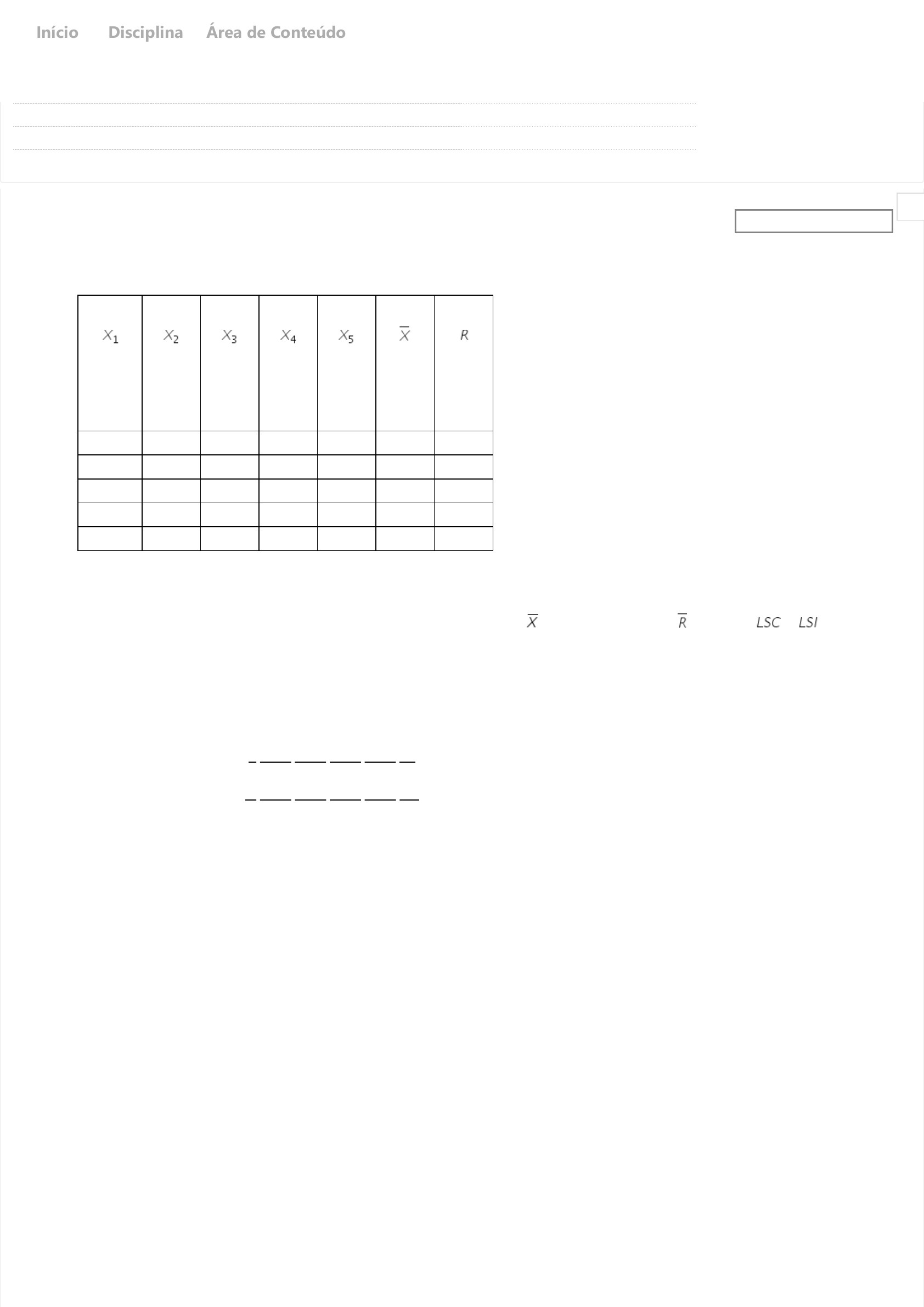Resultado da tentativa 10 em 10 pontos Tempo decorrido 89 horas, 59 minutos Resultados exibidos Respostas enviadas, Respostas corretas, Comentários Pergunta 1 Resposta Selecionada: Resposta Correta: [Nenhuma] Comentário da resposta: [Sem Resposta] A partir do estudo realizado na disciplina de Controle Estatístico de Processos, aprendemos a criar os gráficos de controle. Esses podem ser obtidos a partir do cálculo de e . Um determinado experimento coletou os dados que estão presentes na Tabela 1. 0,65 0,7 0,65 0,65 0,85 0,70 0,20 0,75 0,85 0,75 0,85 0,65 0,77 0,20 0,75 0,80 0,80 0,70 0,75 0,76 0,10 0,6 0,70 0,70 0,75 0,65 0,68 0,15 0,7 0,75 0,65 0,85 0,80 0,75 0,20 Tabela 1: Dados obtidos para 5 Tabela 1: Dados obtidos para 5 amostras coletadas a cada hora. Na Tabela, estão indicados os valores obtidos, assim como a média amostral e a amplitude amostral . Encontre e para as médias dos dados obtidos. Média das médias: X = 0,70+0,77+0,76+0,68+0,75 = 0,732 5 R = 0,20+0,20+0,10+0,15+0,20 = 0,17 5 Para a média: A2 = 0,577 valor tabelado. LSC = X + (A2 * R) LSC = 0,73 + (0,577 * 0,17) LSC = 0,83009 Para calcular LSI: LSI = X - (A2 * R) LSI = 0,73 - (0,577 * 0,17) LSI = 0,63391 Para a amplitude: D4 = 2,114 valor tabelado. LSC = (D4 * R) LSC = (2,114 * 0,17) LSC = 0,35938 LC = 0,17 LSI = (D3 * R) D3 = 0 o valor é tabelado. LSI = (0 * 0,17) LSI = 0 10 em 10 pontos Exibir critério de avaliação Início Disciplina Área de Conteúdo Voltar https://anhembi.blackboard.com/ https://anhembi.blackboard.com/webapps/late-course_engine_soap-BBLEARN/Controller?COURSE_ID=_735910_1 Sexta-feira, 24 de Setembro de 2021 19h16min56s BRT