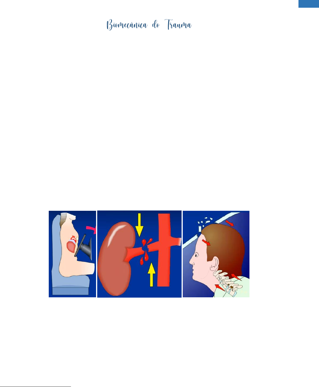 1 Eduarda Rebés Müller Trauma é o ferimento ou lesão caracterizado por uma alteração estrutural ou desequilíbrio fisiológico, resultante da exposição aguda à energia mecânica, térmica, elétrica, química, ou da ausência de algo essencial como calor ou oxigênio Mecanismo de trauma: processo de avaliação da cena de um acidente para determinar quais lesões podem ter ocorrido das resultantes forças que agem sobre um corpo Física e troca de energia Primeira lei de Newton (Lei da Inércia): um objeto em repouso tenderá a permanecer em repouso, até que uma força externa atue sobre ele Lei da Conservação de Energia de Newton: a energia não poderá ser criada, nem destruída, apenas transformada Segunda Lei de Newton: a força é igual a massa vezes a aceleração Energia cinética Energia cinética = m.v² / 2 Ao dobrar a massa, dobra-se a energia cinética Ao dobrar a velocidade, quadriplica-se a energia cinética A energia cinética é a energia do movimento Prevendo as lesões 1. Lesões por compressão. 2. Lesões por cisalhamento (laceração de órgão). 3. Lesões de ossos, ligamentos, partes moles, cérebro, medula. Tipos de colisões automobilísticas Impacto frontal Impacto posterior: estiramento de cervical Impacto lateral: pescoço, ombro, tórax, abdome, bacia Impacto com rotação: mais de um mecanismo → maior chance de lesões Capotamento: múltiplas batidas Lesões na via para baixo Fraturas de bacia/acetábulo Luxação de quadril Fraturas de fêmur Lesões de joelho/poplítea Fraturas de membros inferiores 2 Eduarda Rebés Müller Lesões na via para cima Cabeça Coluna Tórax Abdome Fratura de bacia Dispositivos de contenção Cinto de segurança o Cinto diagonal isolado, sem cinto abdominal: a vítima pode se mover para baixo o Cinto abdominal isolado, sem cinto diagonal: a vítima pode se mover para cima Insuflação do airbag: o Pode causar problemas, mas não se compara aos danos se não houvesse airbag o Riscos para crianças – não podem sentar na frente Colisões de motocicletas Uso obrigatório de capacete: diminuição de até 300% na incidência de trauma de crânio e de morte Impactos + ejeção Trauma de crânio, coluna, trauma abdominal Atropelamento Atropelamento e queda de altura são os acidentes mais graves Criança é ainda mais grave Quedas Depende da superfície de impacto Altura A desaceleração pode causar lesão por compressão ou por cisalhamento Queda de pé (Síndrome de Don Juan): fratura bilateral de calcâneo, fratura de tornozelo, fratura distal de tíbia Queda sobre os braços/ mãos: fratura de punho, luxação de ombro, fratura de clavícula Queda de cabeça: coluna e medula, face, cérebro Esportes e atividades recreacionais Jet-ski, corridas Cinemática e forças envolvidas Uso de equipamento de proteção Lesões relacionadas a explosões Guerras/ terrorismo, residencial/ industrial Primárias: causadas por onda de pressão Secundárias: o Causadas por estilhaços o Áreas afetadas: pele, órgãos internos, esqueleto Terciárias o A vítima é arremessada contra um objeto o Área afetada: área de impacto ou de absorção de energia Ferimentos penetrantes A segurança da cena deve ter prioridade máxima Tipo de arma Estruturas anatômicas ao longo do trajeto potencial 3 Eduarda Rebés Müller Preservação da cena do crime Arma branca: Ferimentos de baixa velocidade Aspectos principais: o Tipo de arma: faca, estilete e tesoura são as mais comuns o Número de ferimentos: pode haver múltiplos ferimentos pela mesma arma o Profundidade de penetração o Estruturas anatômicas ao longo do trajeto potencial Cone de lesão: área possivelmente afetada pela arma. Quando o indivíduo chega ao hospital, não se sabe se a arma subiu ou desceu. Deve-se imaginar o tamanho da arma e a área possivelmente afetada (cone de lesão) para procurar as lesões. Quanto maior a arma, maior o cone de lesão. Arma de fogo Aspectos principais: formato, fragmentação, tombo (cambalhota), trajeto e velocidade Cavitações que a arma provoca no indivíduo Orifício de entrada – sempre menor que o de saída Orifício de saída – nem sempre há Armas de chumbinho: representam o máximo em fragmentação (arma de caça) Referências Aula da Professora Doris Lazzarotto