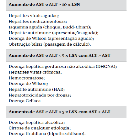 Testes de função hepatica 1. Objetivos · Conhecer os componentes das provas de função hepática. · Conhecer os marcadores de necrose, colestase, avaliação da síntese hepática, capacidade de metabolizar ânios orgânicos e drogas e o metabolismo da bilirrubina. 2. Introdução · Apenas um exame não indica prognóstico ou diagnóstico da doença, por isso que o hepatograma é importante. A prova de função hepática é formada pela TGO, TGP, FA, GGT, bilirrubinas. A maioria dos laboratórios não inclui as proteínas totais e frações (principalmente a albumina) e o TAP. As provas de função hepática identificam doença hepática, tipo, gravidade e eficácia do tratamento. Apresentam sensibilidade e especificidade limitados. Divididos em 4 categorias - marcadores de necrose, marcadores de colestase, avaliação da síntese hepática, capacidade de metabolizar ânions orgânicos e drogas (não são muito usados). 3. Transaminases · Marcadores de necrose: · ALT/TGP: enzima específica do fígado (não é exclusiva), pois é localizada em maior quantidade no citoplasma do hepatócito. É sensível para lesões hepáticas, mostrando-se como um excelente marcador. Porém, correlaciona-se mal com o grau de necrose, atividade histológica, gravidade e prognóstico. · AST/TGO: localizada na mitocôndria (assim, qualquer tecido que tem muita mitocôndria, tem muito TGO), presente no fígado, coração (era utilizada para fazer diagnóstico de infarto), músculos, rins, cérebro, pâncreas, pulmão, leucóticos e hemácias. Um aumento isolado de TGO provavelmente não aponta para uma doença hepática. TGO/TGP > 3 – etiologia alcoólica. · Quando evoluímos para uma hepatite extremamente grave (insuficiência hepática fulminante, ecorrente de FA, por exemplo), há necrose maciça dos hepatócitos. Inicialmente há elevação das transaminases, mas como muitas células vão sendo mortas, esse nível vai diminuindo. Dessa forma, são bons para mostrar doença que mostra predominante morta dos hepatócitos, mas não indica gravidade. · Sinal da cruz em que há aumento de bilirrubina, diminuição de transaminases e alarga o TAP (a redução de transaminases ocorre quando já perdi muitos hepatócitos e pode achar que caiu porque melhorou e na verdade é porque necrosou tudo mesmo). · Para a síntese de transaminases é necessária a vitamina B6, principalmente da TGP. Pacientes com insuficiência hepática de etiologia alcoólica tem um aumento menor de transaminases (quando comparadas com etiologias virais) pois cursam com deficiência de vitamina B6. · O aumento das transaminases deve incluir a relação TGO/TGP, pois TGO necessita de menos B6 para ser sintetizada do que a TGP. Isso direciona o diagnóstico para a etiologia alcoólica quando a TGO estiver com valores 3 vezes maiores do que a TGP. 4. Marcadores de síntese hepática · Albumina: síntese exclusiva pelos hepatócitos, importante pela manutenção da pressão oncótica, em que é responsável 75% da pressão coloido-osmótica. Tem meia-vida de 14-21 dias. Assim, não é um bom marcador para doenças hepáticas aguda, mas excelente marcador de síntese hepática nas hepatopatias crônicas. A sua concentração sérica depende da síntese, degradação e distribuição e também depende de fatores extrahepáticos (ingestão e absorção, perdas nas fezes e urinas, estado de catabolismo). Assim, nunca podemos avaliar somente a albumina. Boa para avaliar estado nutricional do paciente. · Tempo de ação da protrombina (TAP): os fatores envolvidos na síntese de protrombina são o II, V, VII, X. Mede o tempo de conversão da protrombina em trombina. O fígado sintetiza a maioria dos fatores de coagulação da via extrínseca (exceto o VIII que é sintetizado no endotélio). Não é sensível nem específico. Pode haver outras causas de TAP alargado como deficiência congênita de fatores de coagulação, deficiência de vitamina K (necessária para o funcionamento normal dos fatores II, VII, IX e X) e CID. Pode ser usado como prognóstico na IHA e na hepatite alcoólica. Desconfiamos de hepatopatia aguda quando está acima de 6x o valor de referência e precede a encefalopatia, que é o sinal clínico grave do paciente com problemas hepáticos. A vitamina K oral não é absorvida pelo intestino em pacientes ictéricos. · O fator que tem meia-vida menor é o fator VII (dura 6 horas na circulação). Assim, é possível refletir um momento de de hepatopatia aguda do que crônica, como na albumina. · Marcadores de colestase: não são específicas do fígado. · GGT: localiza-se na MC de vários tecidos, principalmente nos ductos biliares (a estase da bile dentro do ducto biliar causa sofrimento do epitélio e acaba sendo liberada; o ácido biliar é um estímulo para a liberação de novas fosfatases) com a função de tranferir o ácido glutâmico pela membrana celular. Também encontrada nos rins, pâncreas, baço, coração, pulmão, cérebro e ausente nos ossos. Metaboliza várias substâncias como álcool, anestésico, cumarínicos, anticonvulsivante (drogas indutoras). Assim, o seu aumento isolado não é indicativo somente de colestase (intra ou extra-hepática), mas devemos investigar o consumo de substâncias, além neoplasias primárias ou metástases hepáticas. Pode diagnosticar abuso agudo (até 2 vezes o valor de referência) ou crônico do álcool. Apresenta meia- ida de 3-4 dias. Assim, melhora primeiro que a FA em uma colestase. · FA: tem isoenzimas hepática, óssea, intestinal, rins, placenta, leucócitos. Localizada no hepatócito e epitélio biliar. É comum estar elevada em adolescentes em puberdade devido ao crescimento óssea (a fração óssea pode ser pedida individualmente), apesar de não ter sua função totalmente esclarecida. Também, participa do transporte de lipídeos no intestino. Apresenta meia-vida de 7 dias. Deve-se comparar com a elevação de GGT (gravidez, TU pulmão, doen