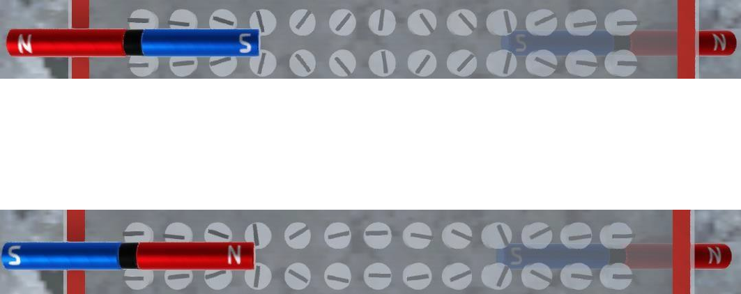 EXPERIMENTO 04 – INTERAÇÃO ENTRE DOIS ÍMÃS PERMANENTES 1 - Posicione os ímãs de forma que os polos semelhantes estejam frente a frente, conforme a figura 1. Qual o tipo de interação que ocorre entre esses polos? Justifique. Resposta: Por ser o mesmo polo Sul de ambos os Imãs, o tipo de campo gerado entre as duas faz com que os polos se repelem, isso ocorre pois quando os polos são iguais (Sul + Sul ou Norte + Norte) os mesmo se repelem. 2 - Posicione os ímãs de forma que os polos opostos estejam frente a frente, conforme a figura 2. Qual o tipo de interação que ocorre entre esses polos? Justifique. Resposta: Por se tratar de polos diferentes (Norte + Sul ou Sul + Norte), ou seja, opostos, os mesmos tendem a se atrair, na figura acima chegamos a perceber o campo saindo do polo Sul do Imã 2 para o polo Norte do Imã 1. 3 - Posicione os ímãs em 3 arranjos distintos e faça um esboço das linhas de indução magnéticas em cada um dos arranjos feitos.