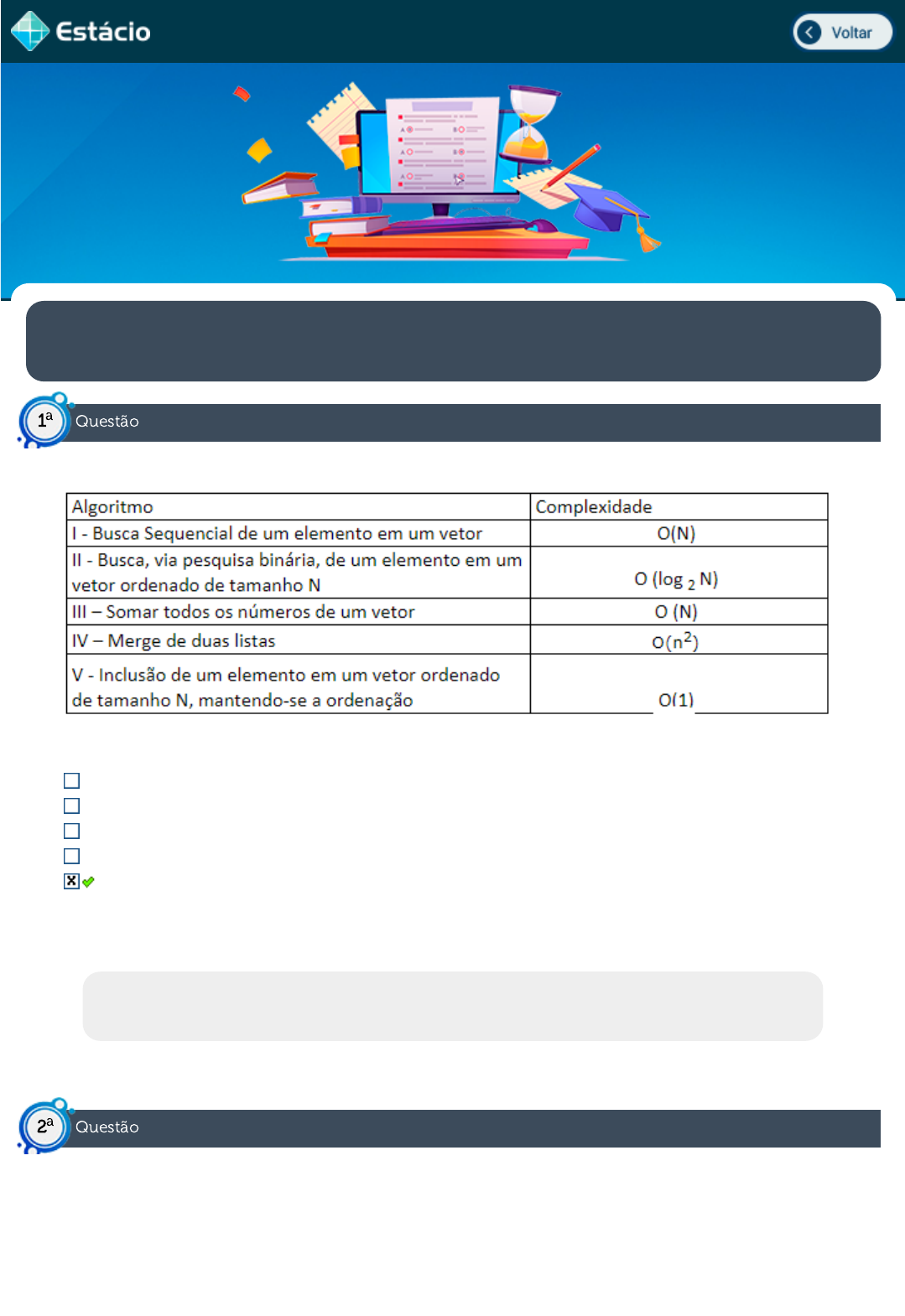 Estão corretas apenas as complexidades indicadas para os algoritmos: