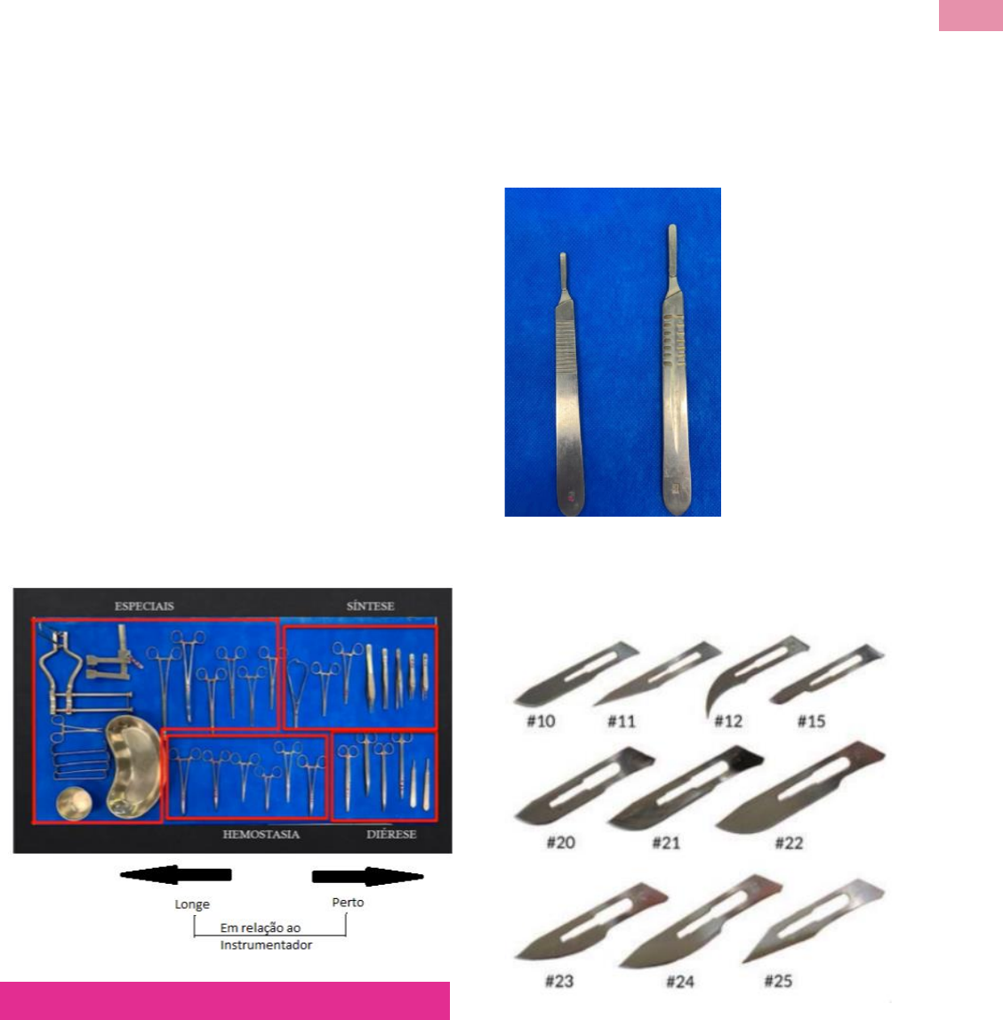 Danielli de Sousa Guedes T2 8°semestre 1 Universidade Nove de Julho Habilidades cirúrgicas Montagem da Mesa cirúrgica Os acessos pela linha média foram os primeiros descritos, utilizando o umbigo como referência. Incisão cirúrgica suprafraumbilical médico se posiciona do lado direito do paciente→ movimento ergonômico. Incisão cirúrgica infraumbilical médico se posiciona do lado esquerdo do paciente. O instrumentador de posiciona contralateral ao cirurgião. Se o cirurgião for canhoto as posições acima invertem. A mesa cirúrgica tem uma organização lógica. a mesa é dividida em 4 quadrantes: INSTRUMENTOS DE DIÉRESE Afastamento de tecidos que estavam juntos. Pode ser feita através de incisão, secção, divulsão (afasta as fibras que estão juntas) , punção, dilatação ou serração. Instrumentos básicos são bisturi e a tesoura. Bisturi cabo 3 e 4 → vem desmontado, pois você escolhe a ponta. Lâmina que começam com 1 encaixam no cabo n°3, as que começam com 2 são do cabo n°4. Nunca colocar a lâmina segurando com a mão o correto é utilizar uma pinça sem apertar a parte da lâmina para não estragar. Danielli de Sousa Guedes T2 8°semestre 2 Universidade Nove de Julho Habilidades cirúrgicas Bisturi é usado principalmente na pele, por ser muito preciso e lesar menos as células. Outro instrumento são as tesouras, usadas na secção e na divulsão. Tesoura de Mayo curva Tesoura de Mayo reta Danielli de Sousa Guedes T2 8°semestre 3 Universidade Nove de Julho Habilidades cirúrgicas Remoção de tecidos que estavam unidos é chamado de estérese. INSTRUMENTOS DE SÍNTESE conectar tecidos em locais próximos para que possam cicatrizar. Pode ser feita através de colagem, grampeamento, adesivar ou sutura. Pinças → causam lesão dependendo da pressão utilizada. Pinça anatomica faz compressão difusa, dente de rato faz lesão pontual. Pinça de adson com dente e sem dente → tem mais controle sobre a transferência depressão feita da mão para o tecido, sendo considerada mais delicada. São muito usadas para fechamento de pele. INSTRUMENTOS DE HEMOSTASIA Processo de contenção do sangramento. Existem diferentes formas: bisturi elétrico, torniquetes, compressas. Dissecções delicadas. Pinça kelly curva/reta (objeto curto é mais fácil de ver a ponta) Danielli de Sousa Guedes T2 8°semestre 4 Universidade Nove de Julho Habilidades cirúrgicas Danielli de Sousa Guedes T2 8°semestre 5 Universidade Nove de Julho Habilidades cirúrgicas