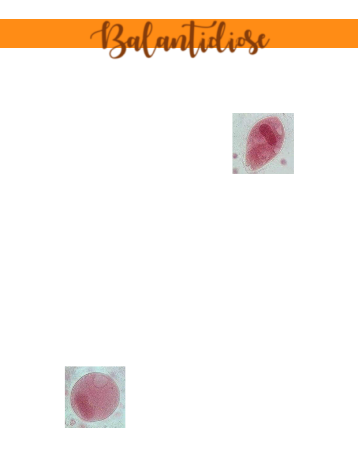 Anna Raphaella – Medicina UFG 68 Balantidiose Introdução: > É uma zoonose causada por um protozoário ciliado, o Balantidium coli > Classificação: • Reino: protista • Filo: Ciliophora • Classe: Ciliata • Ordem: Trichostomatida • Família: Balantiididae • Gênero: Balantidium • Espécie: Balantidium coli > Reservatório natural: suíno (intestino grosso) → não causa doença > Hospedeiro intermediário: ser humano > Transmissão: fecal-oral, contaminação direta pelas mãos > Epidemiologia: • Distribuição ampla • Cosmopolita • Principalmente: América Latina e Sudeste Asiático (regiões tropicais e subtropicais) • Relacionada a baixas condições socioeconômicas e sanitárias • Comum em comerciantes, abatedores, criadores de suínos morfologia: > Cisto • Forma ambiental • Esférico ou ovoide • Parede lisa, espessa e hialina • Macronúcleo • Apresenta maior resistência (ambiente externo e estomacal) • Estão nas fezes formadas > Trofozoíto • Forma ativa • Ovoide • Encontrado no intestino grosso → principalmente ceco • Móvel e veloz • Macro e micronúcleo • Liberados nas fezes diarreicas Ciclo biológico: > Pode ser heteroxênico ou monoxênico > Etapas: 1. Liberação dos cistos pelas fezes humanas 2. Contaminação de água e alimentos 3. Ingestão dos cistos pelos humanos 4. Chega no intestino delgado e inicia o desencistamento 5. Colonização do trofozoíta no intestino grosso → reprodução por divisão binária ou conjugação 6. Pode ocorrer encistamento para posterior liberação patogenia: > Comensal da luz do intestino grosso > Se alimenta de: amido, bactérias > Forma invasiva: penetra mucosa, submucosa, camadas musculares → necroses e ulcerações Quadro clínico: > Maioria das vezes: assintomática > Se confunde com amebíase > Diarreia muco-sanguinolenta > Cólica > Anorexia (pode haver perda de peso) > Febre > Meteorismo > Casos agudos: disenteria, letargia > Casos graves: anemia, formação de abcessos, perfuração intestinal, infecções pulmonares, infecção do tratourogenital > Diagnóstico laboratorial: • Presença de trofozoítos nas fezes diarreicas Anna Raphaella – Medicina UFG 68 • Presença de cistos das fezes formadas (raros no humano) profilaxia: > Higiene individual dos profissionais que trabalham com suínos > Criação de suínos em boas condições sanitárias > Impedir que seus excrementos sejam disseminados > Proteção dos alimentos contra moscas, baratas e outros > Diagnóstico e tratamento precoce das fontes de infecção Ciclo biológico: Anna Raphaella – Medicina UFG 68