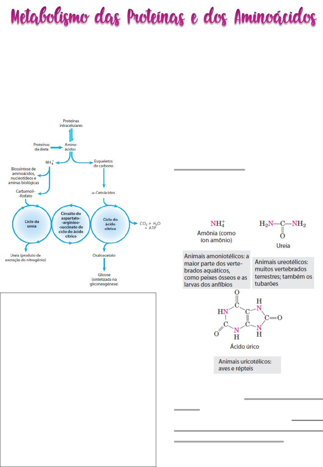 - Uma característica importante distingue a degradação dos aminoácidos de outros processos catabólicos: todos os aminoácidos contêm um grupo amino, e as vias para a degradação dos aminoácidos incluem, portanto, uma etapa fundamental, na qual o grupo alfa-amino é separado do esqueleto de carbono e desviado para as vias do metabolismo do grupo amino; As proteínas intracelulares são degradadas, gerando aminoácidos livres (renovação das proteínas) > de todas as moléculas das células, apenas o DNA é sintetizado uma única vez; O esqueleto carbonado é constituído de alfa-cetoácidos (compostos com um grupo cetona no carbono alfa), os quais entram no ciclo de Krebs e são oxidados (ex.: glutamato tem seu grupo amina retirado, virando alfa-cetoglutarato, entrando no ciclo cítrico para gerar oxalacetato que, por sua vez, é utilizado na síntese da glicose na gliconeogênese); Qualquer aminoácido que possa ser convertido em intermediários do Ciclo de Krebs é chamado aminoácido glicogênico, sendo que, dos 20 aminoácidos que compõem as proteínas, 18 podem virar glicose (exceção da leucina e da lisina - exclusivamente cetogênicos); A amina retirada dos aminoácidos (seja alfa ou da cadeia lateral - presente na arginina, glutamina) pode ter dois destinos: ir para o ciclo da ureia para sintetizar ureia (animais ureotélicos) ou ser utilizada para a biossíntese de aminoácidos, nucleotídeos ou aminas biológicas; Ligando o ciclo da ureia ao ciclo de krebs, existe a lancadeira de aspartato argino succinato do ciclo de krebs; - Os aminoácidos derivados das proteínas da dieta são a origem da maioria dos grupos amino. A maior parte dos aminoácidos é metabolizada no fígado. Parte da amônia gerada nesse processo é reciclada e utilizada em uma variedade de vias biossintéticas; o excesso é excretado diretamente ou convertido em ureia ou ácido úrico para excreção, dependendo do organismo. O excesso de amônia produzido em outros tecidos (extra-hepáticos) é enviado ao fígado (na forma de grupos amino) para conversão em sua forma de excreção; - Há 3 formas de excreção de compostos nitrogenados: amônia, ureia e ácido úrico (diluído nas fezes - aparelho urinário e digestório com parte final comum). O ácido úrico por muito tempo foi uma fonte de compostos nitrogenados para a adubação e é muito encontrado nos ninhais de aves na Cordilheira dos Andes; - Quatro aminoácidos desempenham papéis centrais no metabolismo do nitrogênio: glutamato, glutamina, alanina e aspartato. Eles são aqueles mais facilmente convertidos em intermediários do ciclo do ácido cítrico: glutamato e glutamina são convertidos em alfa-cetoglutarato, alanina em piruvato e aspartato em oxaloacetato; - No citosol das células do fígado (hepatócitos), os grupos amino da maior parte dos aminoácidos são transferidos para o alfa-cetoglutarato, formando glutamato, que entra na mitocôndria e perde seu grupo amino para formar NH4+. O excesso de amônia produzido na maior parte dos demais tecidos é convertido no nitrogênio amídico da glutamina, que circula até chegar ao fígado, entrando na mitocôndria hepática; - No músculo esquelético, os grupos amino que excedem as necessidades geralmente são transferidos ao piruvato para formar alanina, outra molécula importante para o transporte de grupos amino até o fígado; - Em humanos, a degradação das proteínas ingeridas até seus aminoácidos constituintes acontece no trato gastrintestinal. A chegada de proteínas da dieta ao estômago estimula a mucosa gástrica a secretar o hormônio gastrina, que, por sua vez, estimula a secreção de ácido clorídrico pelas células parietais e de pepsinogênio (forma inativa que se transforma em pepsina por uma clivagem proteolítica) pelas células principais das glândulas gástricas; - A pepsina é uma protease ácida (atua em ambientes ácidos) e promove a degradação das proteínas, transformando-as em aminoácidos livres e peptídeos. Essas proteínas parcialmente degradadas vão para o intestino delgado e, no duodeno, é secretado o suco pancreático, o qual é rico em proteases (zimogênios - forma não ativa das enzimas). Finalmente, no intestino, os peptídeos pequenos e aminoácidos são absorvidos pelas vilosidades intestinais; EM CÉLULAS MUSCULARES OU NERVOSAS: o aminoácido reage com o alfa-cetoglutarato (diácido) e perde sua amina, virando um alfa-cetoácido, enquanto o alfa-ceto-glutarato vira glutamato (TRANSAMINAÇÃO). O glutamato é jogado no sangue, indo até o fígado, onde perde seu grupo amina, que é utilizado principalmente para a síntese de ureia. Ele volta a ser alfa-cetoglutarato, que é jogado no sangue, vai para os tecidos periféricos, voltando a reagir com os outros aminoácidos. A glutamina, que possui a mesma estrutura molecular do glutamato (porém é aminado na cadeia lateral), também perde um grupo amina, virando glutamato. A alanina do músculo perde um grupo amina alfa, virando piruvato (alfa-cetoácido); - Chegando ao fígado, a primeira etapa no catabolismo da maioria dos L-aminoácidos é a remoção de seus grupos alfa-amino, realizada por enzimas denominadas AMINOTRANSFERASES ou TRANSAMINASES. Nessas reações de TRANSAMINAÇÃO, o grupo alfa-amino é transferido para o carbono a do alfa-cetoglutarato, liberando o correspondente alfa-cetoácido, análogo do aminoácido. Não ocorre desaminação (perda de grupos amino) efetiva nessas reações, pois o alfa-cetoglutarato torna-se aminado enquanto o alfa-aminoácido é desaminado. O efeito das reações de transaminação é coletar grupos amino de diferentes aminoácidos, na forma de L-glutamato. O glutamato então funciona como doador de grupos amino para vias biossintéticas ou para vias de excreção, que levam à eliminação de produtos de excreção nitrogenados; -Todas as aminotransferases apresentam o mesmo grupo prostético e o mesmo mecanismo de reação. O grupo prostéti