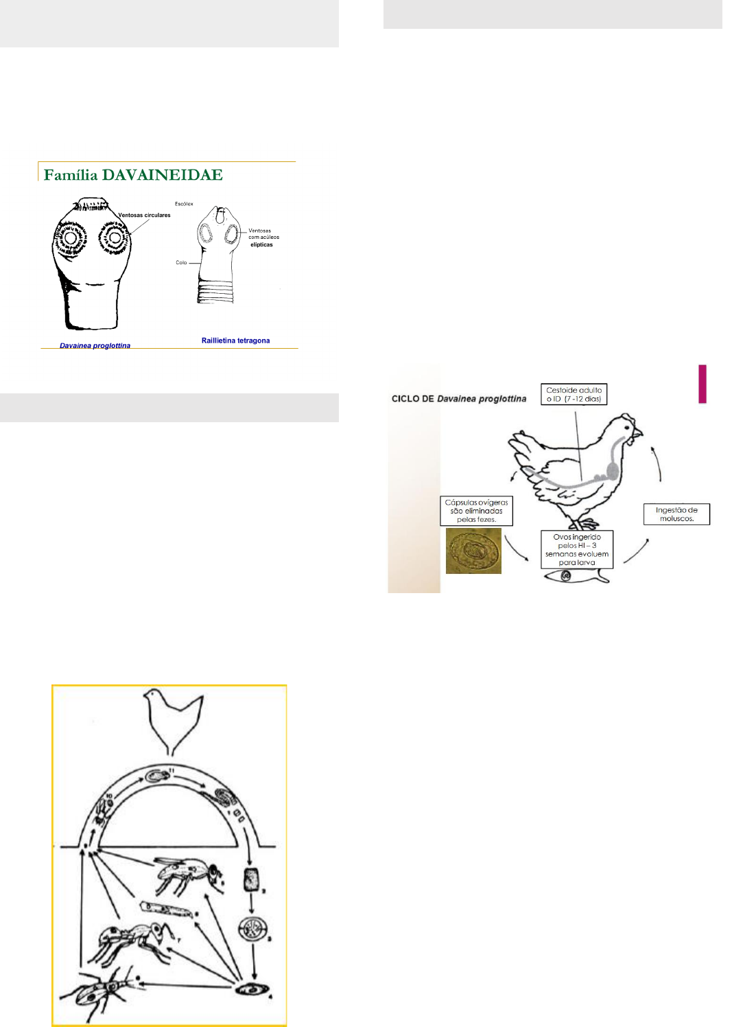 Família Davaineidae Subdividida em dois gêneros principais: • Railietina • Davainea Raillietina tetrágona • 1 a 25 cm • Escólex tetrágono • Rostro com dupla coroa de acúleos e ventosas elípticas e com acúleos; • Hospedeiro definitivo: galinhas, adultos no intestino delgado • Hospedeiro intermediário: formigas, x666666666666666escaravelhos, moscas (larvas em cisticercoides) • Pode causar Nódulos caseosos ou calcificados na mucosa intestinal semelhante a tuberculose aviária; Davainea proglotina • Escolex quadrangular • Rostro com dupla coroa de acúleos • Poucas proglotes→ 4 a 9 • 15 a 50 cm; • Hospedeiro definitivo: galinhas, vermes adultos no intestino delgado • Hospedeiro intermediário: moluscos o Arion, Limax, Agriolimax • Penetra na mucosa→ enterite hemorrágica grave • Penas arrepiadas • Diarreia c/ sg • Caquexia • Morte