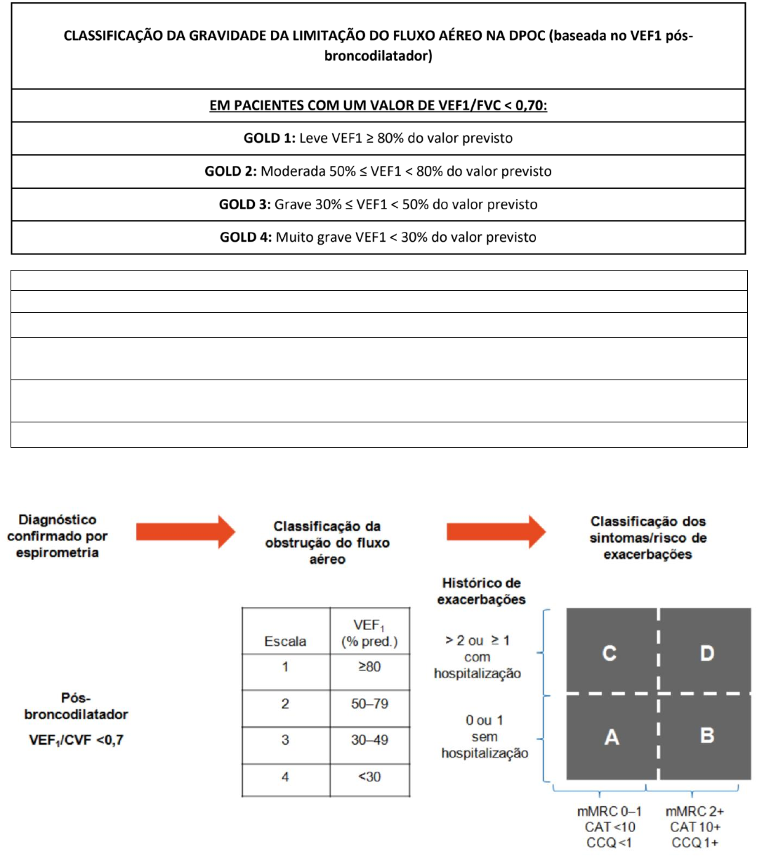 09/09/2021 Clínica médica – Prática Farmacologia DPOC Natalia Lisboa Farmacologia da DPOC Para pensarmos em um tratamento farmacológico para a DPOC é necessário fazer uma classificação desse paciente usando instrumentos criados para avaliar a gravidade da doença ESCALA DE VARIAÇÃO DA DISPNEIA NO PACIENTE COM DPOC Grau 0 de mMRC: só falta ar quando faz exercício físico intenso Grau 1 de mMRC: falta ar para andar rápido em terreno plano, ou andar devagar em uma subida Grau 2 de mMRC: não consegue manter o ritmo caminhando no plano se comparado com pessoas da mesma idade; ou tem que parar para respirar quando está andando em seu próprio ritmo no plano. Grau 3 de mMRC: para e respira depois de andar cerca de 100 metros ou depois de poucos minutos no terreno plano Grau 5 de mMRC: tem dificuldade para se vestir e tirar roupas; tomar banho. A partir disso é possível seguir um fluxograma para o diagnóstico e estadiamento Tratamento O tratamento tem como objetivo reduzir os sintomas e reduzir um risco futuro. Sempre importante lembrar que o paciente deve ser orientado em relação à MEV. 09/09/2021 Clínica médica – Prática Farmacologia DPOC Natalia Lisboa Após classificar o paciente em grupos A, B, C ou D, devemos seguir o esquema abaixo para saber qual o tratamento mais adequado para ele. • Broncodilatadores: ✓ β2 agonistas de curta duração: salbutamol, fenoterol. São usados nos resgates. ✓ β2 agonistas de longa duração: salmeterol, formoterol. São usados no tratamento de manutenção. ✓ β2 agonistas de ultra-longa duração: vilanterol, indacaterol, olodaterol • Anticolinérgicos: ✓ Curta duração: ipatropio ✓ Longa duração: tiotropio, glicopirronium, umeclidinium • Metilxantinas: teogilina, bamifilina. O uso atualmente é desestimulado por ter baixo poder broncodilatador e alto índice de efeitos colaterais. • Corticoides inalatórios: ✓ 8-12h: Budesonida, fluticasona ✓ 24h: mometasona, furoato de fluticasona ✓ A evidência atual sugere possibilidade de desescalonamento após melhora sintomática. ✓ Em risco aumentado de pneumonia com o tratamento contínuo deve-se avaliar o risco benefício. ✓ Nunca em monoterapia no DPOC • Corticoides sistêmicos: Prednisolona, hidrocortisona, metilprednisolona. Somente indicados no tratamento da exacerbação aguda, por 5-7 dias • Inibidores de PDE4: Roflumilaste. É um anti-inflamatório de segunda linha com pouco impacto na qualidade de vida e/ou sintomas, mas reduz exacerbações e melhora a função pulmonar. • Macrolídeos: azitromicina, eritromicina. É opção par pacientes mais graves já em tratamento otimizado; reduz exacerbações, mas pode induzir resistência bacteriana. • Mucolíticos e antioxidantes: NAC e carbocisteina. Reduzem risco de exacerbação em pacientes que não estão em uso de CI • Estatinas: sinvastatina, atorvastatina. Não há evidência para indicação de uso, porém estudos em pacientes que usam tais medicações por outros motivos sugerem efeito benéfico. 09/09/2021 Clínica médica – Prática Farmacologia DPOC Natalia Lisboa Acompanhamento Indicações para uso de ICS