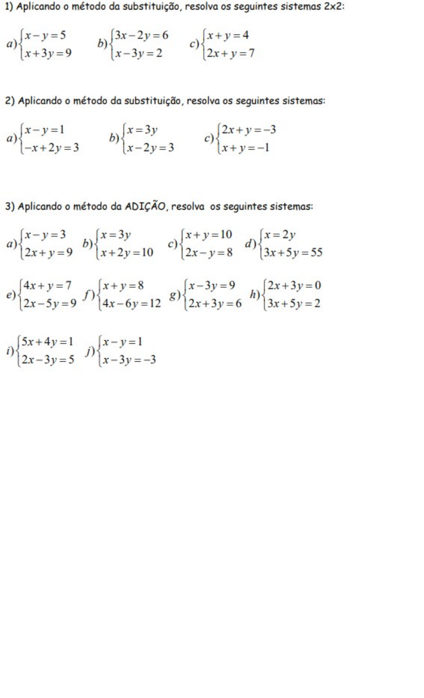 SISTEMAS LINEARES I – 8° ANO João usou apenas cédulas de R$ 20,00 e de R$ 5,00 para fazer um pagamento de R$ 140,00. Quantas cédulas de cada tipo ele usou, sabendo que no total foram 10 cédulas? Em sua rua, André observou que havia 20 veículos estacionados, dentre motos e carros. Ao abaixar-se, ele conseguiu visualizar 54 rodas. Qual é a quantidade de motos e de carros estacionados na rua de André? Em uma praça há 18 crianças andando de bicicleta ou de skate. No total, há 50 rodas girando pela praça. Quantas crianças andam de bicicleta e quantas andam de skate? Nós não conhecemos o número de bicicletas e de skates que circulam pela praça, mas nós sabemos que a soma das bicicletas e dos skates é a mesma do total de crianças. Portanto, se chamarmos por b as bicicletas e por s os skates, teremos: s + b = 18 Se há 50 rodas girando pela praça, podemos dizer que a soma das rodas das bicicletas e dos skates é 50. Vale lembrar que cada skate tem 4 rodas e cada bicicleta tem 2 rodas. Teremos uma nova equação em função das rodas: 4.s + 2.b = 18 Podemos formar o seguinte sistema de equações: Agora, multiplicamos a primeira equação por menos 2, somando-a com a segunda: – 2b – 2s = – 36 2b + 4s = 50 2s = 14 s = 14 2 s = 7 Então, nesse parque, há 7 skates. Resta-nos encontrar a quantidade de bicicletas. Para isso, utilizaremos a equação s + b = 18, na qual substituiremos o valor de skates encontrado: s + b = 18 7 + b = 18 b = 18 – 7 b = 11 Portanto, nessa praça há 7 crianças andando de skate e 11 crianças andando de bicicleta. A soma de dois números é 37. A diferença entre eles é 9. Quais são esses números? Vamos identificar os números que procuramos como x e y. Vamos supor ainda que x > y. Temos então que x + y = 37 e x – y = 9. Utilizaremos o método da adição, somando as duas equações: x + y = 37 x – y = 9 2x = 46 x = 46 2 x = 23 Substituindo esse valor em alguma das equações, teremos: x + y = 37 y = 37 – x y = 37 – 23 y = 14 Portanto, os números procurados são 23 e 14. (Unirio – RJ) Em um escritório de advocacia trabalham apenas dois advogados e uma secretária. Como o Dr. André e o Dr. Carlos sempre advogam em causas diferentes, a secretaria Cláudia coloca 1 grampo em cada processo do Dr. André e 2 grampos em cada processo do Dr. Carlos, para diferenciá-los facilmente no arquivo. Sabendo-se que , ao todo, são 78 processos nos quais foram usados 110 grampos. Calcule o número de processos do Dr. Carlos. Ver Resposta QUESTÃO 3 (Unifor – CE) Um pacote tem 48 balas: algumas de hortelã e as demais de laranja. Se a terça parte correspondente ao dobro do número de balas de hortelã excede a metade do de laranjas em 4 unidades, determine o número de balas de hortelã e laranja. Questão 2 Dr. André : x Dr. Carlos: y O número de processos do Dr. Carlos é igual a 32. Voltar a questão Questão 3 Hortelã: x Laranja: y Temos 24 balas de hortelã e 24 de laranja. A soma de um número x com o dobro de um número y é - 7; e a diferença entre o triplo desse número x e número y é igual a 7. Sendo assim, é correto afirmar que o produto xy é igual a: a) -15 b) -12 c) -10 d) -4 e) - 2 Ver Resposta Vamos começar montando as equações considerando a situação proposta no problema. Desta forma, temos: x + 2.y = - 7 e 3.x - y = 7 Os valores de x e y devem satisfazer ao mesmo tempo as duas equações. Portanto, formam o seguinte sistema de equações: Podemos resolver esse sistema pelo método da adição. Para tal, vamos multiplicar a segunda equação por 2: Somando as duas equações: Substituindo na primeira equação o valor de x encontrado, temos: 1 + 2y = - 7 2y = - 7 - 1 Assim, o produto xy será igual a: x.y = 1 . (- 4) = - 4 Alternativa: d) - 4