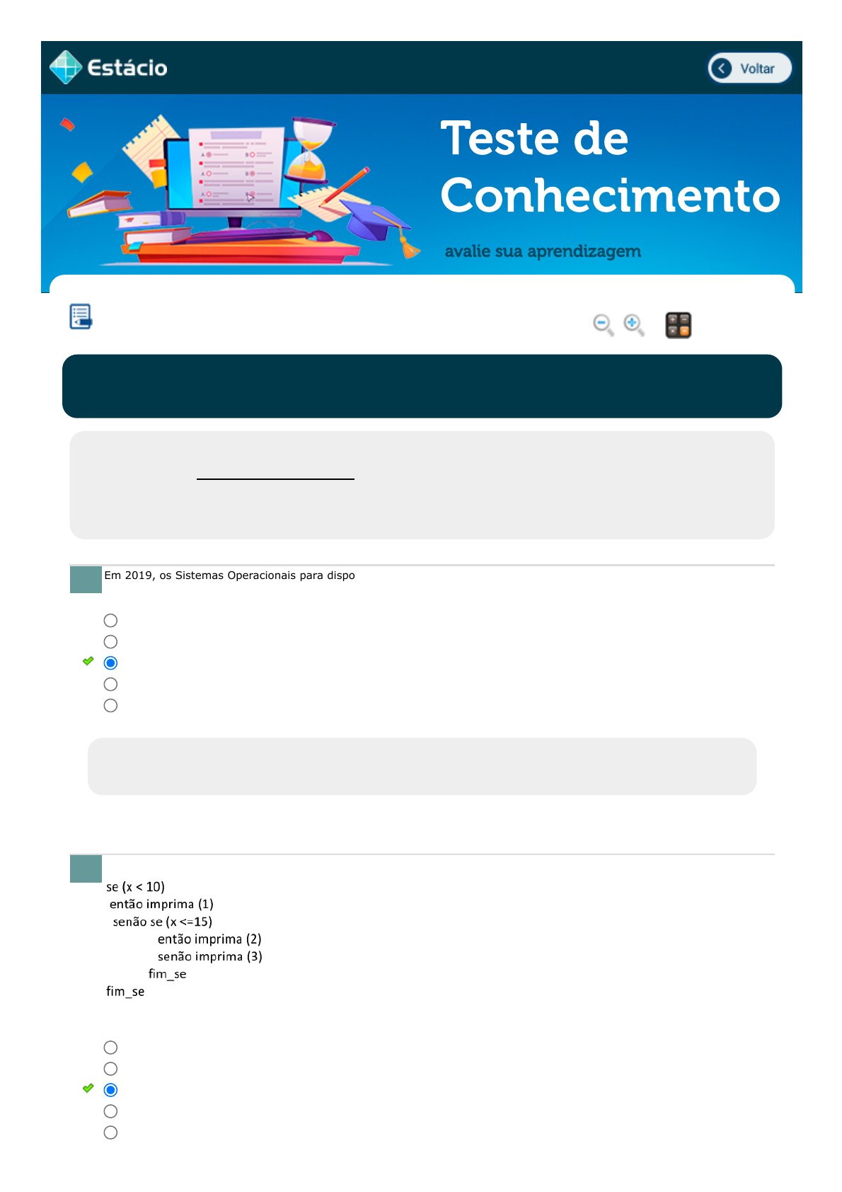 30/09/21, 14:22 Estácio: Alunos https://simulado.estacio.br/alunos/?p0=456951780&user_cod=3776686&matr_integracao=202102159555 1/4 Teste de Conhecimento avalie sua aprendizagem Em 2019, os Sistemas Operacionais para dispositivos móveis (mobileOS) já respondiam por mais de 50% do market share dos Sistemas Operacionais. Qual das funcionalidades a seguir não é responsabilidade do mobileOS de um celular? (Quadrix - 2013) Analise o seguinte trecho de algoritmo, utilizado em programação de computadores. É correto afirmar que se o valor da variável x for: LÓGICA DE PROGRAMAÇÃO Lupa Calc. EEX0100_202102159555_ESM Aluno: WANDERSON ANTÔNIO DIAS ROSA Matr.: 202102159555 Disc.: LÓGICA DE PROG. 2021.2 - F (G) / EX Prezado (a) Aluno(a), Você fará agora seu TESTE DE CONHECIMENTO! Lembre-se que este exercício é opcional, mas não valerá ponto para sua avaliação. O mesmo será composto de questões de múltipla escolha. Após responde cada questão, você terá acesso ao gabarito comentado e/ou à explicação da mesma. Aproveite para se familiarizar com este modelo de questões que será usado na sua AV e AVS. 1. Mostrar a carga restante da bateria. Mostrar notificações. Calcular rotas. Prover comunicação com a rede celular. Ler a tela touchscreen. Data Resp.: 30/09/2021 14:19:36 Explicação: . 2. 200, não será impresso nenhum valor. -1, não será impresso nenhum valor 10, será impresso o valor 2. 13, será impresso o valor 1. 15, será impresso o valor 3 Data Resp.: 30/09/2021 14:19:44 javascript:voltar(); javascript:voltar(); javascript:diminui(); javascript:aumenta(); javascript:calculadora_on(); 30/09/21, 14:22 Estácio: Alunos https://simulado.estacio.br/alunos/?p0=456951780&user_cod=3776686&matr_integracao=202102159555 2/4 Em um programa escrito em linguagem Python, o comando de atribuição x = int(4.8) fará com que a variável x: (IF-MT - 2018) Considere o seguinte fragmento de código fonte, escrito em linguagem Python: a = 3 b = a * 2 a, b = b, a Após a execução de todos os comandos, qual é o resultado apresentado pelo comando abaixo? print(a) Considere o seguinte trecho de um programa escrito em Python: numero = 40 # numero = numero - 1 print(numero) Após a execução do trecho, é correto afirmar que: (UNIRIO - Analista Tecnologia da Informação - Desenvolvimento de Sistemas - 2014) Sobre o comando range para construção de listas na linguagem Python, é CORRETO afirmar que 3. passe a armazenar o valor 5 passe a armazenar o valor 4 passe a armazenar o valor 4.8 passe a armazenar o valor 32 passe a armazenar o valor 0.5 Data Resp.: 30/09/2021 14:19:53 4. 36 63 3 a 6 Data Resp.: 30/09/2021 14:20:28 5. Será impresso o valor 40 Será impressa a string oremun Será impressa a string numero Será impresso o valor 41 Será impresso o valor 39 Data Resp.: 30/09/2021 14:20:52 Explicação: . 6. range(5,1,-2) gera a lista [4,5]. range(5) gera a lista [1,2,3,4,5]. range(4,6) gera a lista [4,5,6,7,8,9]. range(4,6) gera a lista [4,5]. range(5,1) gera a lista [5]. Data Resp.: 30/09/2021 14:21:05 30/09/21, 14:22 Estácio: Alunos https://simulado.estacio.br/alunos/?p0=456951780&user_cod=3776686&matr_integracao=202102159555 3/4 (Ano: 2019 Banca: COMPERVE Órgão: UFRN Prova: COMPERVE - 2019 - UFRN - Técnico de Tecnologia da Informação) Python é uma linguagem de programação de alto nível, interpretada, orientada a objetos, funcional, de tipagem dinâmica e forte. Levando isso em conta, analise o código em Python abaixo. def e(b): a = b*b return a a = 10 e(a) e(a) print(e(a)) Nesse caso, ao executar o programa, o valor impresso será: Considere as afirmações relacionadas a reutilização de software e responda: i. Software menores são mais simples de manter. ii. Atualmente não há ferramentas que permitam o compartilhamento e versionamento de código fonte. iii. Em algumas metodologias de desenvolvimento escrevemos os testes mesmo antes de começar a programar as funcionalidades do sistema. iv. Módulos que realizam tarefas específicas facilitam seu reuso em outros sistemas. Qual estrutura de dados utiliza a lógica LIFO (Last In First Out), em português: Último a Entrar Primeiro a Sair? 7. 100 1 10 1000 10000 Data Resp.: 30/09/2021 14:21:09 8. Todas estão corretas Apenas I, iii e iv estão corretas Todas estão erradas Apenas I, II e iv estão corretas Apenas I e II estão corretas Data Resp.: 30/09/2021 14:21:15 Explicação: . 9. Matriz Lista Encadeada Fila Vetor Pilha Data Resp.: 30/09/2021 14:21:36 30/09/21, 14:22 Estácio: Alunos https://simulado.estacio.br/alunos/?p0=456951780&user_cod=3776686&matr_integracao=202102159555 4/4 Considere o Código a seguir: >>> lista = [x+5 for x in [0,1,2,3,4,5] if x < 3] Assinale a opção com o valor da variável lista: 10. [5, 6, 7, 8, 9, 10] [8, 9, 10] [0, 1, 2] [0, 5, 10] [5, 6, 7] Data Resp.: 30/09/2021 14:21:50 Explicação: . Não Respondida Não Gravada Gravada Exercício inciado em 30/09/2021 14:19:08.