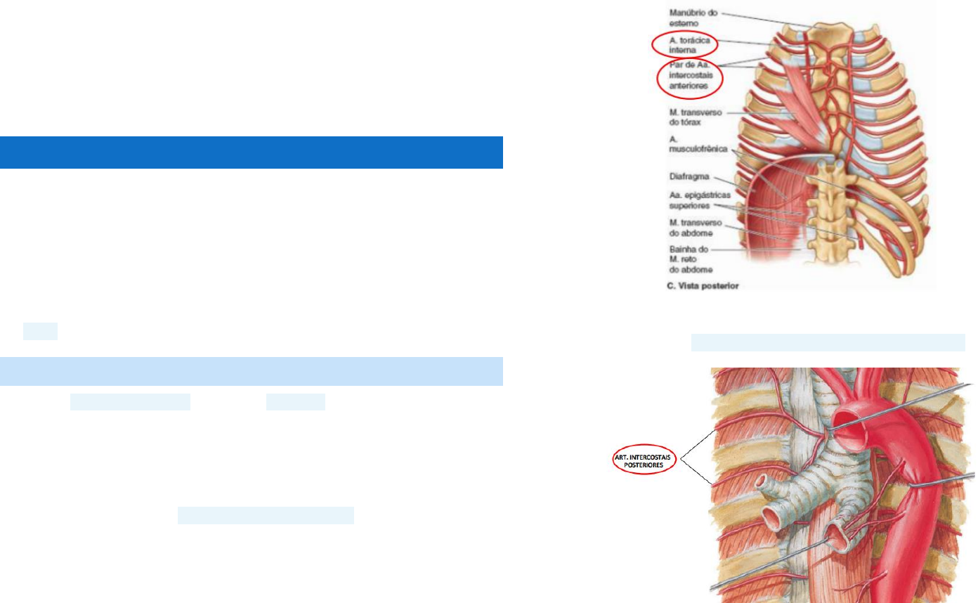 @resumosdamed_ VASCULARIZAÇÃO PARIETAL DA CAIXA TORÁCICA DIVISÃO DO CORPO HUMANO: O compartimento central em que se insere os membros superiores e inferiores e o local de onde se projeta o pescoço e a cabeça é chamado de tronco ou dorso. Pode ser subdividido em: • Toráx: parte superior; • Abdome: inferior ao tórax; e • Pelve: inferior ao abdome. O tórax é a parte do tronco situada entre o pescoço e o abdome. IRRIGAÇÃO ARTERIAL DO TÓRAX: Tanto a parede anterior quanto a posterior da caixa torácica são irrigadas por um grupo de artérias denominadas de artérias intercostais, pois são artérias que transitam nos espaços intercostais (espaços que existem entre as costelas). Elas são divididas em: • Artérias Intercostais Anteriores: irrigam a parede anterior do tórax, sendo originadas da artéria torácica interna (antigamente era chamada de a. mamária), que tem trajeto descendente, passando paralelo ao osso esterno, e tem origem na artéria subclávia. • Artérias Intercostais Posteriores: irrigam a parede posterior do tórax, sendo originadas da porção torácica da aorta descendente. @resumosdamed_ As Artérias Intercostais Posteriores e Anteriores vão se anastomosar formando uma circulação em forma de cesto (circulação colateral) ao redor da caixa torácica. @resumosdamed_ DRENAGEM VENOSA DO TÓRAX: As veias intercostais acompanham as artérias intercostais e estão em posição superior nos sulcos das costelas. Portanto, elas são divididas em: • Veias Intercostais Anteriores: drenam a parede anterior do tórax, sendo tributárias da veia torácica interna, que possui trajeto ascendente e é tributária da veia braquiocefálica, que é tributária da veia cava superior. Portanto: veias intercostais anteriores → veia torácica interna → veia braquiocefálica → veia cava superior. • Veias Intercostais Posteriores: drenam a parede posterior do tórax, sendo que o lado em que se encontram diferenciam-se em sua tributação. ➢ Lado direito: as veias intercostais posteriores do lado direito são tributárias da veia ázigo, que, por sua vez, é tributária da veia cava superior. Portanto: veias intercostais posteriores do lado direito → veia ázigo → veia cava superior. ➢ Lado esquerdo: as veias intercostais posteriores mais superiores do lado esquerdo são tributárias da veia hemiázigo acessória, enquanto as mais inferiores são tributárias da veia hemiázigo, que, por sua vez, é tributária da veia ázigo. Portanto: veias intercostais posteriores do lado esquerdo → mais superiores/mais inferiores → veia hemiázigo acessória/veia hemiázigo → veia ázigo → veia cava superior. @resumosdamed_ DRENAGEM LINFÁTICA DO TÓRAX: A parede anterior do tórax é drenada pelos linfonodos paraesternais, que levam a linfa para os troncos broncomediastinais direito e esquerdo. Enquanto a parede posterior do tórax é drenada pelos linfonodos intercostais, que, também, levam a linfa para os troncos broncomediastinais direito e esquerdo. Obs: os linfonodos intercostais mais inferiores levam a linfa para o ducto torácico. REFERÊNCIAS BIBLIOGRÁFICAS: 1. MOORE, K. L.; DALLEY, A. F. Anatomia orientada para a clínica. 5 ed. Rio de Janeiro: Guanabara Koogan, 2007.