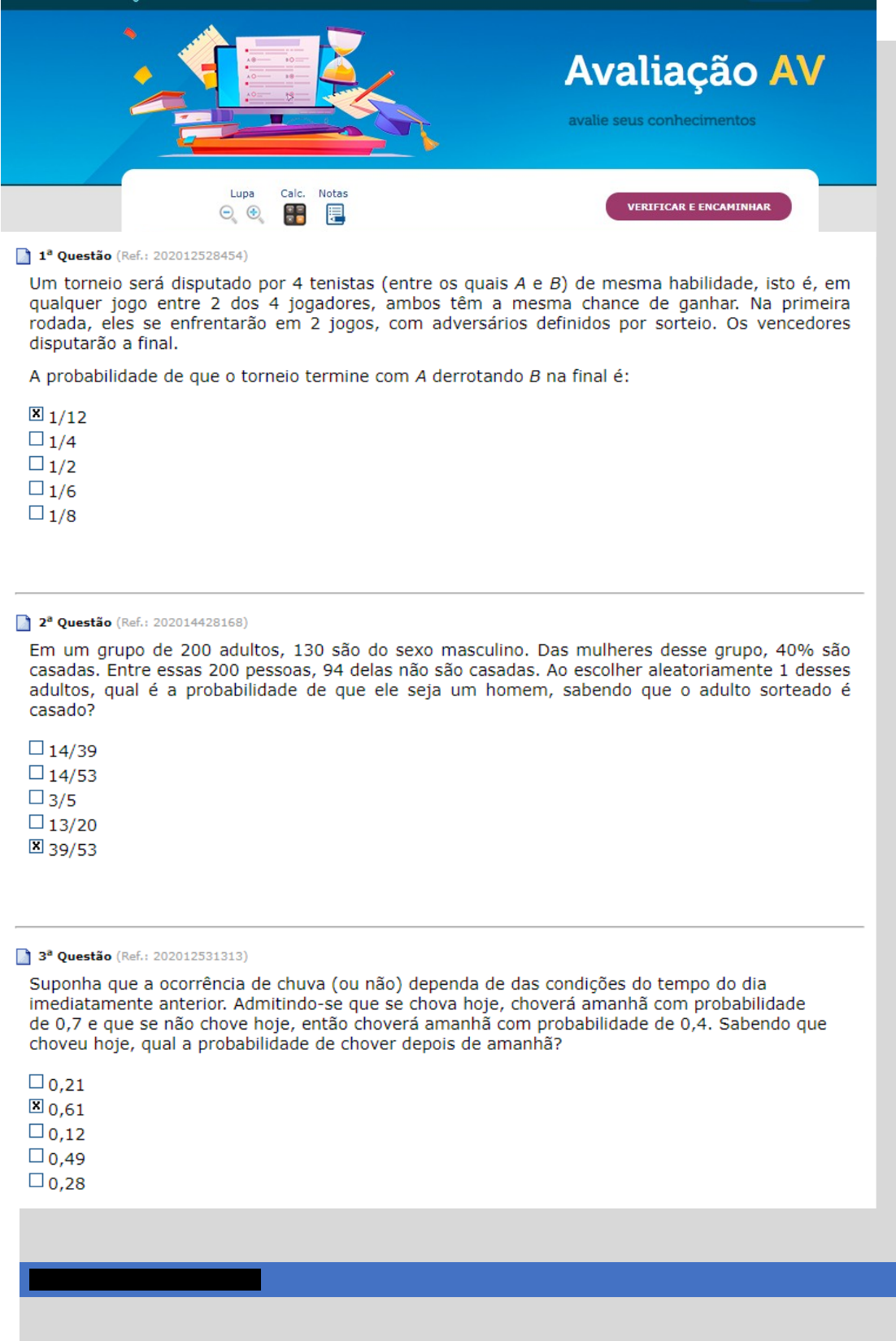 1a Questão (Ref.: 202012528454) Um torneio será disputado por 4 tenistas (entre os quais A e B) de mesma habilidade, isto é, em qualquer jogo entre 2 dos 4 jogadores, ambos têm a mesma chance de ganhar. Na primeira rodada, eles se enfrentarão em 2 jogos, com adversários definidos por sorteio. Os vencedores disputarão a final. A probabilidade de que o torneio termine com A derrotando B na final é: 1/12 1/4 1/2 1/6 1/8 2a Questão (Ref.: 202014428168) Em um grupo de 200 adultos, 130 são do sexo masculino. Das mulheres desse grupo, 40% são casadas. Entre essas 200 pessoas, 94 delas não são casadas. Ao escolher aleatoriamente 1 desses adultos, qual é a probabilidade de que ele seja um homem, sabendo que o adulto sorteado é casado? 14/39 14/53 3/5 13/20 39/53 3a Questão (Ref.: 202012531313) Suponha que a ocorrência de chuva (ou não) dependa de das condições do tempo do dia imediatamente anterior. Admitindo-se que se chova hoje, choverá amanhã com probabilidade de 0,7 e que se não chove hoje, então choverá amanhã com probabilidade de 0,4. Sabendo que choveu hoje, qual a probabilidade de chover depois de amanhã? 0,21 0,61 0,12 0,49 0,28 4a Questão (Ref.: 202012531300) Considere dois eventos A e B, os quais são mutuamente excludentes, sendo P(A) a probabilidade de ocorrência de A e P(B) a probabilidade de ocorrência de B. Assinale a alternativa correta. A e B são independentes se, e somente se, P(A|B) = P(A) e P(B|A) = P(B) P(A|B) = 0 A e B são independentes se P(B|A) = P(B) A e B são independentes se P(A|B) = P(A) P(A|B) = 1 5a Questão (Ref.: 202012531328) A variável aleatória discreta \(X\) assume apenas os valores 0, 1, 2, 3, 4 e 5. A função densidade de probabilidade de \(X\) é dada por: P(X = 0) = P (X = 1) = P(X = 2) = P(X = 3) = a P(X = 4) = P(X = 5) = b P(X \(\ge\) 2) = 3P(X \(<\) 2) O valor esperado de \(X\) é igual a : 6/8 9/4 3 10 7 6a Questão (Ref.: 202012531323) Um importador adquiriu vários artigos ao preço médio de US$ 15,00, com um desvio padrão de US$ 1,00. Sabendo-se que a taxa de câmbio é de R$ 3,00 por dólar, é incorreto afirmar que: Em reais, o desvio padrão será de R$ 3,00. A variância em dólares é igual a 1,00. Se ao preço original de cada artigo, um intermediário adicionar uma margem de lucro fixa de R$ 10,00, o novo preço médio será R$ 55,00, com um desvio padrão de R$ 6,00. Convertendo-se o valor das compras para reais, o preço médio dos produtos adquiridos será de R$ 45,00. Se a margem de lucro for de 20% sobre o preço em reais, o novo preço médio será R$ 54,00 e o novo desvio padrão será R$ 3,60. 7a Questão (Ref.: 202012566646) A variável aleatória X tem função de densidade de probabilidade f(x) = 6x (1−x), se 0 < x < 1 e f(x) = 0, se x £ 0 ou x ³ 1. Qual é a média de X? 0,5 0,4 0,75 0,6 0,8 8a Questão (Ref.: 202012599542) Considere o conjunto de dados a seguir: 60 80 80 85 85 85 85 90 90 90 90 90 100 100 100 100 100 100 O box plot correspondente a esse conjunto de dados é: (C) (A) (D) (E) (B) 9a Questão (Ref.: 202012593704) A tabela a seguir apresenta a distribuição de frequências associada à duração de chamadas telefônicas, em minutos, em uma determinada região. A mediana e o terceiro quartil, calculados com base na tabela acima são, respectivamente: 10,5 e 13,5 11 e 14,45 15 e 22,5 11 e 13,5 10,5 e 12,95 10a Questão (Ref.: 202012528670) Um empresário, investindo em um determinado empreendimento, espera ter os seguintes lucros em função dos cenários "Bom", "Médio" e "Ruim": A expectância e a variância do respectivo lucro são, em R$ e (R$)2, respectivamente: 5.300,00 e 3.160.000 5.500,00 e 3.160.000 5.000,00 e 3.160.000 5.300,00 e 3.510.000 5.000,00 e 3.510.000 ESTATÍSTICA E PROBABILIDADE DÊNISSON HÉLDER Dinéh 2