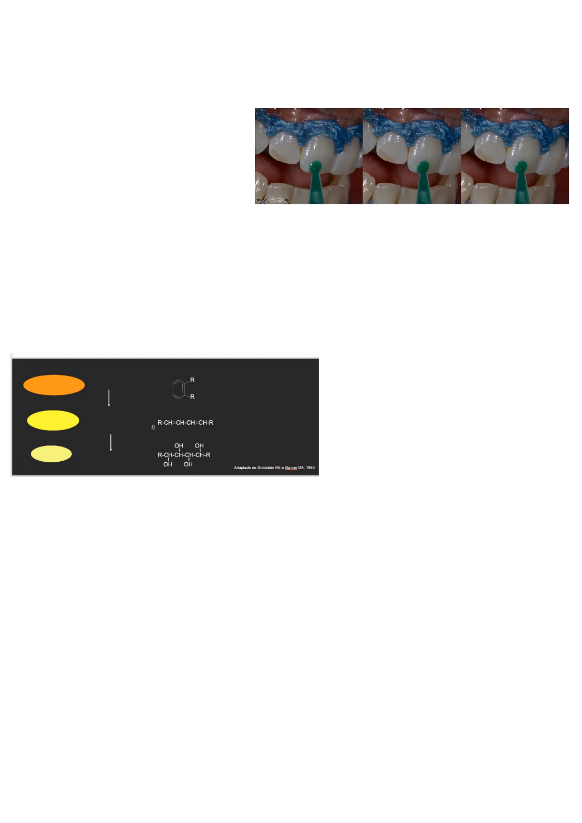 Clareamento de dentes vitais 13/04/21 EST1 Técnica não invasiva que permite melhorar a estética por meio do uso tópico de um gel clareador na superfície do esmalte. - Não desgasta o dente, não há necessidade de preparo. Quando fazemos um planejamento estético, na maioria das vezes o clareamento está envolvido. O gel irá agir na estrutura dentária por uma ação de óxido-redução Atualmente, temos peróxido de hidrogênio, peróxido de carbamida ou perborato de sódio. Em todos os casos quem vai agir no clareamento é o peróxido de hidrogênio que agirá na estrutura dentária, os outros se dissociam e o peróxido de hidrogênio será o composto ativo. Esses que precisam se dissociar possuem o processo mais lento. -> Ele atua quebrando as cadeias das partículas dos pigmentos, atua no esmalte e dentina, principalmente na dentina, pois no esmalte é pigmentação externa que pode sair com profilaxia. O peróxido de hidrogênio é limitante -> chega um momento ele para de agir nos pigmentos. Alguns géis são muito ácidos, (para estabilizar), mas isso não é bom pois pode desmineralizar a estrutura dentária e causar sensibilidade-> precisamos analisar isso para a escolha do produto! Quando não é tão ácido a própria saliva vai repondo aos poucos. Não pode fazer clareamento em dentes cariados ou com qualquer outra patologia que precisa ser tratada ou controlada antes. INDICAÇÕES: - Dentes que apresentam coloração amarela ou escurecida - Manchamento leve ou moderado por tetraciclina (quando queremos clarear só uma faixa ou um dente específico o ideal é o clareamento de consultório), mas o pigmento de tetraciclina é difícil, até clareia porém as faixas ainda ficam perceptíveis, por isso recomendamos o caseiro a looongo prazo. - Dentes com alteração de cor originada por traumatismo. (quando o paciente apresenta um incisivo mais escuro que o outro, pode ser necrose pulpar ou calcificação distrófica) - Dentes com fluorose leve - Dentes com escurecimento em função da perda parcial do esmalte pela idade ou desgaste fisiológico (cuidado em pacientes com erosão, precisa estar controlado) Dentes com restaurações antigas que necessitam de substituição e o paciente apresenta expectativa de clarear (o paciente precisa ser avisado sobre a possibilidade ou necessidade de substituição das restaurações, o clareamento vem antes -> primeiro clareia depois restaura) ***Clareamento não remove mancha branca, remove pigmentos. -> Não atua na resina, mas pode agir no pigmento externo que está nela. A prof não indica clareamento caseiro para pacientes fumantes, pois eles podem querer fumar com a moldeira e o gel associado ao fumo pode potencializar carcinogênese. O dente nunca volta o que era, por isso é importante fotografar e mostrar para o paciente, pois eles esquecem ou não percebem a diferença. TIPOS DE CLAREAMENTO PARA DENTES VITAIS - O caseiro precisa ser supervisionado pelo profissional (a prof acompanha uma vez por semana.). - O de consultório é realizado pelo profissional. - Combinado: faz uma sessão no consultório e continua com moldeira em casa. Existem moldeiras não personalizadas, a é ideal a personalizada para evitar extravasamento do gel. -> Utilizar produtos com uma menor concentração. O peróxido de carbamida 10% se dissocia em peróxido de hidrogênio a 3,5% e uréia (alcaliniza o meio), ou seja, optamos pelo caseiro quando há risco de sensibilidade e o mais seguro seria o peróxido de carbamida a 10%. -> Quanto maior a concentração maior o risco de sensibilidade e quanto maior a concentração menor o tempo de uso. -> A sensibilidade está diretamente proporcional ao tempo e a concentração. Se eu tenho no consultório alta concentração e o paciente possui sensibilidade, o indicado é o caseiro supervisionado com baixa concentração. Analisar a sensibilidade e o perfil do paciente -> será que ele vai lembrar de usar a moldeira pelo tempo indicado? Muitas vezes eles desistem pela falta de disciplina, pois quando coloca a moldeira não pode comer, beber...conseguimos maior adesão do paciente quando coloca durante a noite. O estudo acima aponta que o clareamento caseiro depende só de tempo, mas não depende da concentração, já os efeitos secundários(sensibilidade) dependem da concentração do agente ativo, portanto, não há necessidade de usar produtos de alta concentração. O protocolo mais eficaz é a baixa concentração (peróxido de carbamida 10%) com uso noturno. Ou seja, no clareamento caseiro não há necessidade de usar uma concentração alta, pois só mudaria os efeitos adversos -> sensibilidade. O pico do peróxido ocorre em uma hora, mas ele continua agindo depois, por isso podemos usar ele de 1 hora até 8 horas por dia, pois depois da 1 hora (pico de ação) ele continua agindo. ____________________________________________ O paciente tem que retirar a moldeira, remover o gel e escovar com um dentifrício não abrasivo. TÉCNICA (CASEIRO) 1- Exame clínico -> observar se não está com alguma patologia ativa 2- Registro da cor -> fotografar a cor inicial segundo a escala tal 3- Moldagem em alginato (superior e inferior) 4- Obtenção dos modelos de gesso e confecção da moldeira-> moldeira pode ser de silicone(0,5mm) ou acetato (1mm) Vídeo: Ter um modelo adequado, pegando bem o fundo do vestíbulo, remover a parte do palato, feito isso, antigamente faziam alívio para o gel, hj não faz mais. Placa de acetato ou silicone que será aquecida e depois será acionado um vácuo que puxa o material em contato com o dente. Depois de adaptado, recorta a placa com tesoura ou lâmina de 2 a 3 mm acima do bordo gengival. -> Este trabalho avaliou moldeiras com ou sem alívio, ao lado que possuía alívio causou uma inflamação gengival não apenas imediatamente, mas até 45 dias após o tratamento clareador. ->o alívio não gera maior eficácia 5- Prova da moldeira e instruções de uso Chama o paciente e faz