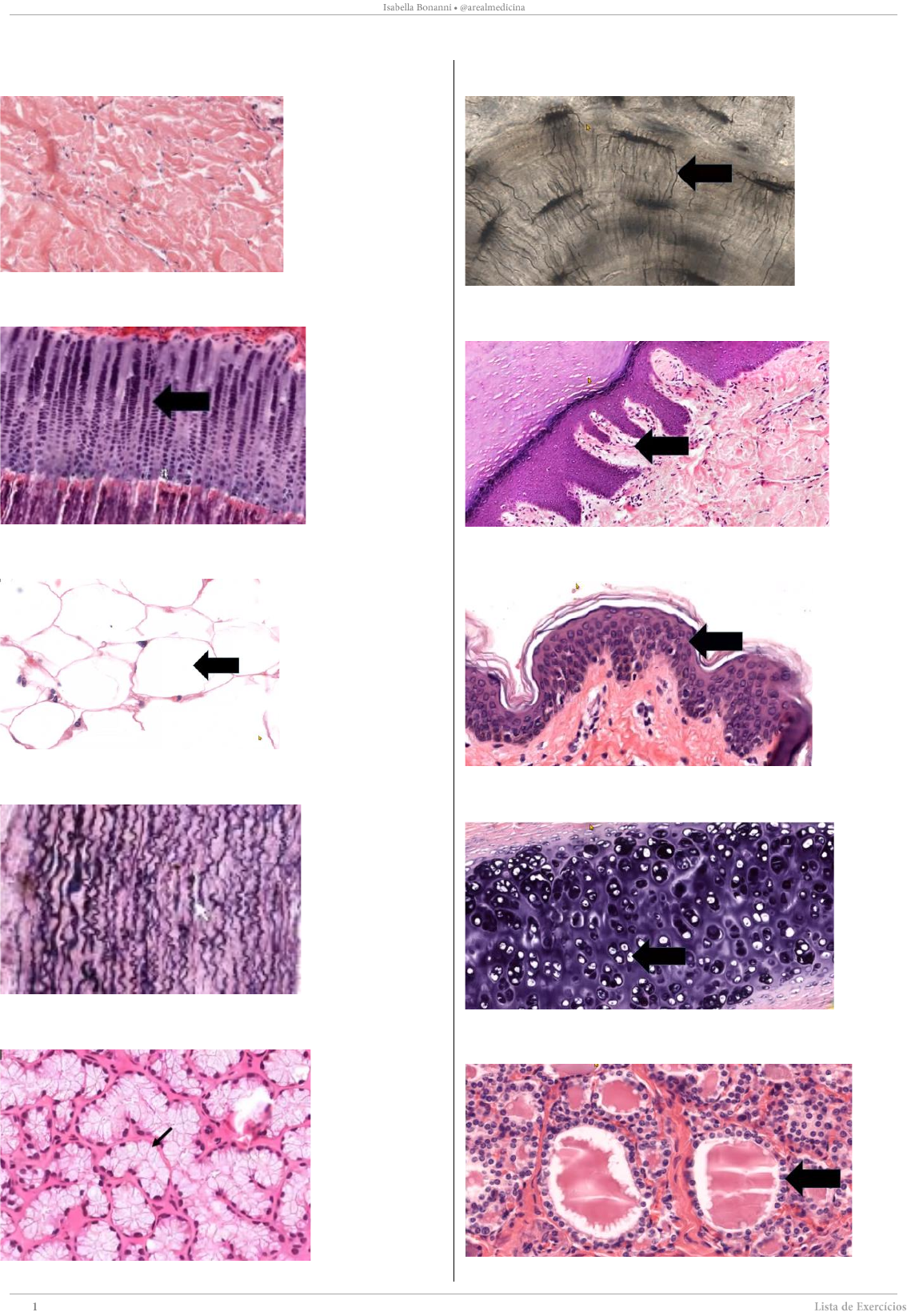 Histologia Básica - Prática Questão 1: Classifique o tecido abaixo: Questão 2: Classifique a zona de ossificação apontada: Questão 3: Nomeie a célula apontada na seta: Questão 4: Nomeie a estrutura apontada na seta: Questão 5: Identifique a estrutura abaixo: Questão 6: Identifique a estrutura apontada pela seta Questão 7: Classifique o tecido na seta Questão 8: Classifique o tecido na seta: Questão 9: Identifique a célula apontada pela seta: Questão 10: Classifique o tecido apontado pela seta Gabarito Questão 1: tecido conjuntivo denso não modelado Questão 2: zona de proliferação Questão 3: adipócito Questão 4: lâmina/fibra elástica Questão 5: túbulo mucoso Questão 6: canalículos Questão 7: tecido conjuntivo propriamente dito frouxo Questão 8: tecido epitelial de revestimento pavimentoso estratificado queratinizado Questão 9: condrócito Questão 10: tecido epitelial glandular endócrino – glândula endócrina folicular