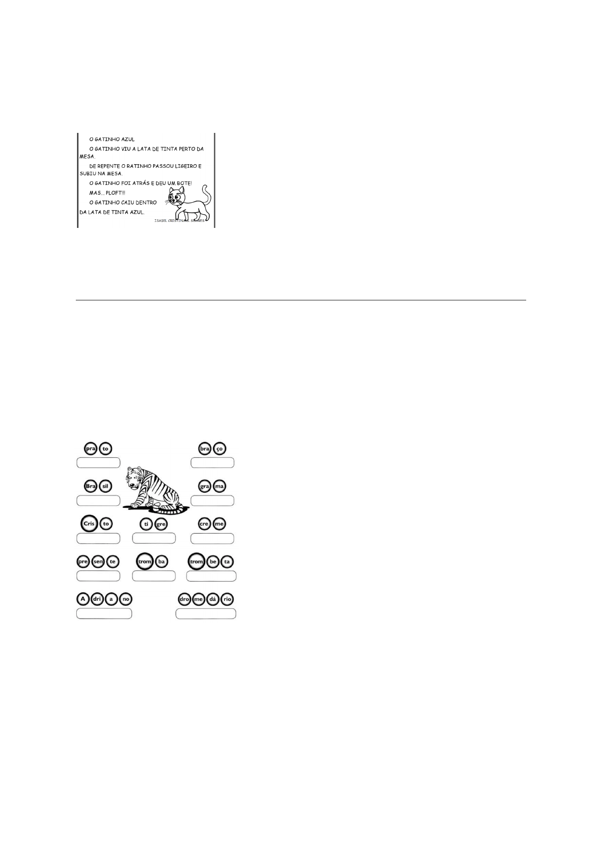 Avaliação de Português 1- Leia o texto . a - Escreva abaixo o título do texto . b - Os personagens do texto são : ( ) A lata e o gatinho . ( ) O gatinho e o ratinho . ( ) A lata de tinta . 2 - Junte as sílabas e escreva as pala- Vras . 3 - Descubra as palavras embaralhadas escreva-as no quadro . 4 - Ordene as sílabas e forme palavras . 5 - Separe as sílabas e o número de sílabas . 6 - Circule a palavra de acordo com o nome de cada figura . 7 Observe as s encontros consonantais Complete as palavras com os adequados . br cr dr fr gr pr tr vr pa e mático eira a aço teado igo li aria andalhao agao Uzeiro 8 - Observe as cenas e complete a história com as palavras do quadro abaixo .