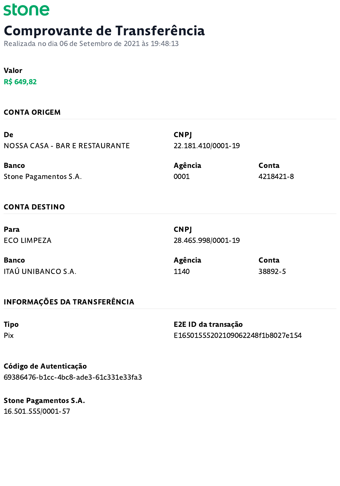 Comprovante de Transferência Realizada no dia 06 de Setembro de 2021 às 19:48:13 Valor R$ 649,82 CONTA ORIGEM De NOSSA CASA - BAR E RESTAURANTE CNPJ 22.181.410/0001-19 Banco Stone Pagamentos S.A. Agência 0001 Conta 4218421-8 CONTA DESTINO Para ECO LIMPEZA CNPJ 28.465.998/0001-19 Banco ITAÚ UNIBANCO S.A. Agência 1140 Conta 38892-5 INFORMAÇÕES DA TRANSFERÊNCIA Tipo Pix E2E ID da transação E16501555202109062248f1b8027e154 Código de Autenticação 69386476-b1cc-4bc8-ade3-61c331e33fa3 Stone Pagamentos S.A. 16.501.555/0001-57