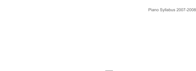 PIANO (Subject Code: 01) a The lists of pieces remain in force for two years, and ABRSM Publishing issues a selection of the set pieces for Grades 1–8. b Schedule of maximum marks for all grades: Scales and Arpeggios/Broken Chords 21 Pieces: 1 30 Pieces: 2 30 Pieces: 3 30 Playing at Sight 21 Aural Tests 18 Total 150 c When marking, the examiner will pay attention not only to accuracy of notes and time, but also to other elements inherent in a good performance, for example quality of touch, variety and gradation of tone, choice of tempo, observance of marks of expression, rhythm, phrasing and accent, and the use of practical fingering. d Scales, arpeggios and broken chords should be played from memory, ascending and descending throughout the prescribed compass, at a pace appropriate to the technical demands of the grade, consistent with accuracy and distinctness, and without undue accentuation. In all grades, broken chords and arpeggios should be played legato; scales in Grades 1 to 5 legato, Grade 6 legato or staccato only as indicated in the syllabus, but in Grades 7 and 8 legato or staccato as directed by the examiner. Any practical and systematic fingering which produces a good result will be accepted. Pedalling must not be used. e Candidates will be given a short interval of up to half a minute in which to look through and, if they wish, try out any part of the test for Playing at Sight before they are required to perform it for assessment. f Candidates should use their discretion in the choice of pieces in order to present a contrasted and balanced programme. g Discretion in the use of the pedals will be taken into account, although candidates in the lower grades who cannot reach the pedals easily will not be penalized. Similarly, candidates whose hands are too small to play the music as written will not be penalized for ‘spreading’ chords or omitting occasional notes at wide stretches provided the result is musically satisfactory. h ABRSM Centres provide a satisfactory piano (which may be upright or grand). Practice before the examination cannot be arranged, but examiners will recognize that the instrument may be one to which candidates are unaccustomed. i When examinations are held at Visits (i.e. premises provided by a school or teacher and visited by the examiner), a satisfactory piano must be provided. An electronic piano may be used, provided it has a clearly recognizable piano tone, a touch-sensitive keyboard with full-size weighted keys, and an action, compass and facilities that match those of an ordinary piano, including a sustaining pedal. Prep Test. Information about this test, designed as a preparation for the Grade 1 examination and to encourage the building of good musical and technical foundations, is contained in a separate leaflet. The test, lasting approximately 10 minutes, takes the form of a positive assessment with no marks or a ‘pass’ or ‘fail’ result. A certificate, incorporating the examiner’s written report, is presented to the candidate at the end of the assessment. The three tunes, a choice of set pieces and examples of the listening games which comprise the material used for the assessment are published by ABRSM Publishing in Piano Prep Test. Any piece or pieces from one of the Party Time! for Piano albums or Roundabout (all published by ABRSM Publishing) may be presented as alternatives to the set pieces in Piano Prep Test. Piano Duet. Examinations for piano duet are available at three levels – Primary, Intermediate and Advanced. Details of the requirements and suggested pieces are listed under the subject heading Ensembles in the Harpsichord, Organ, Guitar, Harp, Percussion, Singing & Ensembles Syllabus published separately. 18 Piano Syllabus 2007-2008 PPiiaannoo GGRRAADDEE 11 SCALES, ARPEGGIOS AND BROKEN CHORDS*: from memory, legato: Scales: major and minor (melodic or harmonic at candidate’s choice): (i) with each hand separately, up and down (L.H. may, at the candidate’s choice, be played down and up) in the following keys: C, G, D, F majors A, D minors (ii) in contrary motion with both hands beginning and ending on the key-note (unison), in the key of C major only (one octave) Arpeggios: the common chords of C, G and F majors, and A and D minors, in root position only, with each hand separately (one octave) Broken Chords: formed from the chords of C, G and F majors, and A and D minors, with each hand separately, according to the following pattern: THREE PIECES: one chosen by the candidate from each of the three Lists, A, B and C: LIST A 1 Corelli Sarabanda: 3rd movt from Sonata in D minor, Op. 5 No. 7 Selected Piano Exam Pieces 2 Hässler Moderato in C: No. 5 from 50 pièces à l’usage des commençans, Op. 38 2007–2008, Grade 1 3 Mozart Allegro in F, K. 1c (observing first repeat) (ABRSM Publishing) 4 Kress Menuet. No. 1 from Easy Pieces of the 17th and 18th Centuries, Vol. 1 5 Krieger Menuet. No. 10 from } (Bärenreiter Praha H 4014/Bärenreiter) 6 Türk Carefree Happiness: No. 32 from 60 Pieces for Aspiring Players, Book 1 (ABRSM Publishing) LIST B 1 K. J. Bischoff The Industrious Student, Op. 31 No. 3 Selected Piano Exam Pieces 2 Enckhausen Andante: No. 22 from 41 Klavierstücke, Op. 93 2007–2008, Grade 1 3 R. Fuchs Banges Herzelein (Sad at Heart): No. 5 from Jugend-Album, Op. 47 (ABRSM Publishing) 4 Blatný Allegretto. No. 8 from Album Etud (Album of Studies), Vol. 1 (Bärenreiter Praha H 2348/Bärenreiter) 5 Köhler Melody, Op. 190 No. 27. More Romantic Pieces for Piano, Book 1 (ABRSM Publishing) 6 Loeschhorn Study in C, Op. 65 No. 3. A Romantic Sketchbook for Piano, Book 1 (ABRSM Publishing) LIST C 1 N. Bachinskaya The Old Cuckoo-Clock Selected Piano Exam Pieces 2007–2008, 2 Michel Le Coz Mini Rag: from Original Piano Jazz Grade 1 (ABRSM Publishing) 3 David Sawer Moebius 4 Alan Bullard Flying above the Clouds. Piano Time: Going Places, arr. Hall (OUP) 5 Elissa Milne Skedaddle: from Little Peppers (Faber) 6 Lionel