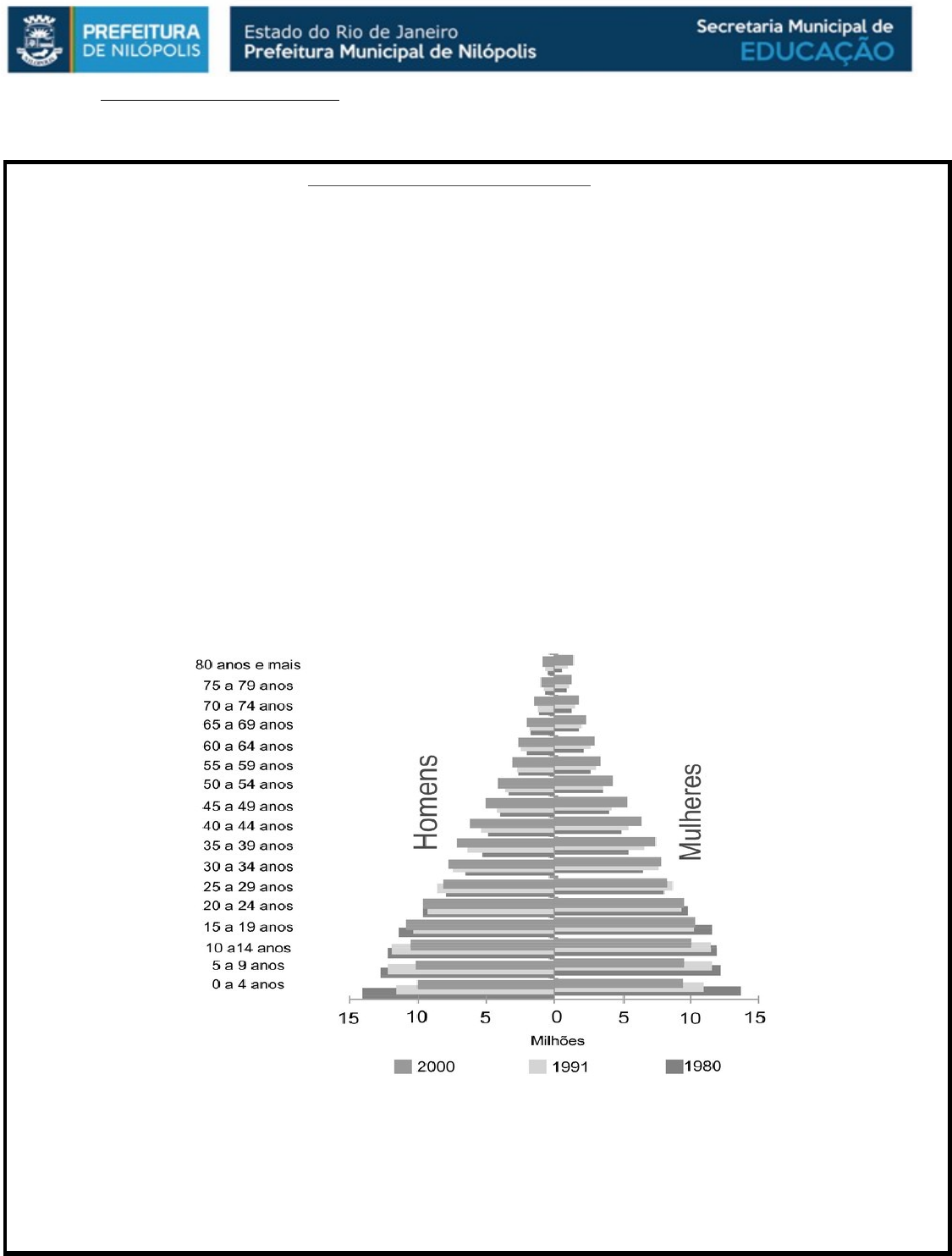 TURMA. 8º - ANO – GEOGRAFIA. ATIVIDADES EAD DE GEOGRAFIA. DINÂMICA POPULACIONAL. O estudo sobre a dinâmica populacional do mundo não é algo recente. Remonta-se a um período anterior ao século XVIII, em que se formularam teorias sobre o crescimento populacional utilizadas até os dias atuais. Cada uma dessas teorias correspondia a uma visão de sociedade e do próprio movimento histórico que se seguia. Embora houvesse essas distinções, todas as teorias formuladas até então se preocupavam em explicar o crescimento da população e seus impactos sobre a natureza e a organização da sociedade. Assim, para conseguir responder às duvidas sobre o futuro das sociedades o estudo sobre a dinâmica populacional elencou três tipos de indicadores, que funcionariam como padrões a serem analisados: mortalidade, natalidade e fecundidade. A mortalidade é calculada a partir da relação entre o número de óbitos em um determinado ano e a população total neste mesmo ano; a seguir, multiplica-se o resultado por mil (para evitar excesso de decimais). Já a mortalidade infantil é calculada a partir da multiplicação por mil do número de crianças, com menos de um ano, que morreram em um determinado ano; a seguir, divide-se o resultado pelo número de crianças nascidas vivas naquele mesmo ano. Os números oferecidos por estas equações matemáticas devem ser interpretados, ou seja, obter somente o número não é revelador da situação em que a sociedade está submetida. Por isso, alguns pensadores argumentam que a elevação dos números relativos à mortalidade indicaria a superexploração do trabalhador, uma vez que seria o reflexo da redução de salários e acesso à saúde e cuidados básicos. A natalidade é calculada com base na multiplicação por mil do número de nascimentos em um dado ano, dividindo-se o resultado pela população total no ano e local considerados na análise. A fecundidade, por sua vez, relaciona o número de crianças com menos de cinco anos ao número de mulheres em idade reprodutiva (este dado varia conforme o país, podendo ser de 15 a 44 anos; 14 a 49 anos ou 20 a 44 anos). A taxa de fecundidade sofreu alterações com a consolidação da industrialização, uma vez que as mulheres adentraram ao mercado de trabalho, demorando mais tempo para engravidar e constituir família. Vale destacar que os índices de natalidade também vem sofrendo reduções em função das melhores condições de vida de uma parcela significativa da sociedade, como também, por causa de um novo entendimento sobre o papel da família na contemporaneidade. FASES DO CRESCIMENTO POPULACIONAL. O crescimento populacional é marcado por fases de crescimento. Em uma primeira fase, característica dos países subdesenvolvidos, as taxas de natalidade e mortalidade são elevadas. Isso demonstra que o país não dispõe de políticas públicas ligadas à saúde, uma vez que a população morre com pouca idade e, sequer, oferece métodos contraceptivos à sua população, já que as taxas de natalidade são altas. Nessa fase, a pirâmide populacional apresenta base larga e topo fino. Na segunda fase do crescimento populacional, características dos países em desenvolvimento, como o Brasil, as taxas de natalidades apresentam diminuição, mas as taxas de mortalidade permanecem altas. Essas mudanças são reflexos de algumas situações: Entrada da mulher no mercado de trabalho, o que pressupõe planejamento familiar; - Urbanização crescente, pessoas migrando do campo em direção às cidades. - Alto custo de vida nas cidades, famílias começam a reduzir sua prole dado os gastos com a criação (escola, saúde, lazer, entre outros). - Acesso à contraceptivos, que promovem o controle da natalidade. - Nesta fase, por sua vez, a pirâmide é apresentada com uma base menor e o topo pequeno, se assemelhando a uma coluna. A última fase do crescimento populacional é caracterizada pelas baixas taxas de natalidade e mortalidade, situação pertencente aos países desenvolvidos, sobretudo da Europa. Os países em desenvolvimento e subdesenvolvidos ainda não alcançaram essa fase, estima-se que o Brasil a alcance somente em 2050. Embora possa parecer que estas fases representem etapas para “um país melhor”, países como a França e o Japão temem pelo futuro de suas economias, uma vez que a oferta de força de trabalho tem se reduzido drasticamente, aumentando, em contrapartida, os gastos com o sistema previdenciário. Nesta fase, a pirâmide é invertida em relação à primeira fase, pois apresenta topo largo e base muito estreito Dessa maneira, por mais que o país tenha um gasto menor com a população jovem (como por exemplo, educação), precisa se preocupar com o envelhecimento de sua população adulta, o que vai gerar mais aposentados e menos força de trabalho disponível, onerando o sistema previdenciário. Para amenizar sua situação, o Japão passou a facilitar a entrada de imigrantes descendentes de japoneses para trabalharem nos setor secundário e terciário de sua economia. Esses imigrantes descendentes de japoneses ficaram conhecidos como dekasséguis. Em países europeus, como a França, a entrada de mão de obra estrangeira é problemática, pois o país possui grupos xenofóbicos, que são contrários à entrada de imigrantes, sobretudo àqueles vindos de países da África. Além da França, os Estados Unidos também possui grupos contrários à entrada de imigrantes, sobretudo àqueles vindos do México. Exercícios de verificação dos conteúdos aplicados. 1) Convivendo com países com dados antagônicos tais como: rendas per capita superiores a U$ 10.000 e inferiores a U$ 599, taxas de mortalidade inferiores a 6% e superiores a 100% e taxas de analfabetismos que vão de 1% a mais de 50%, este continente, que concentra o maior número de metrópoles do mundo é formado por um mosaico étnico, religioso e cultural com ilhas de desenvolvimento e bolsões de pob