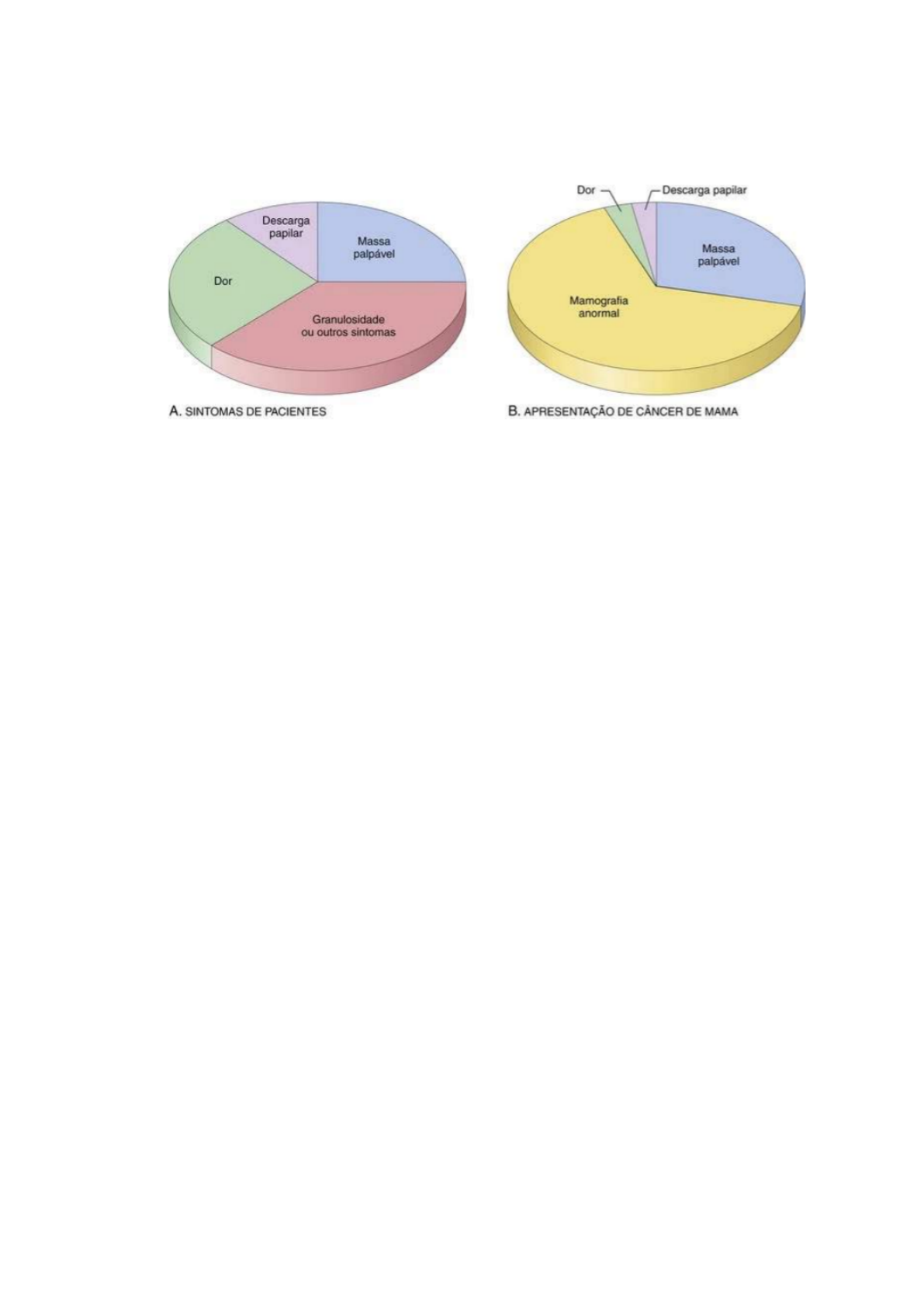 Doenças da Mama: Sinais e Sintomas: - Dor (mastalgia ou mastodinia): + Clínica com menstruação ocorrendo com ou sem ciclo; + Clínica difusa pode ocorrer por um edema pré-menstrual; + Não clínica: localizada em uma área da mama; ● Cistos rompidos; ● Lesões físicas; ● Infecções; - Massas palpáveis são comuns e devem ser distinguidas da nodularidade normal da mama; - As lesões palpáveis mais comuns são: cistos, fibroadenomas e carcinomas invasivos; - A probabilidade de malignidade acontece com a idade; - Descarga papilar: + Menos comum, mas é mais indicativa de carcinomas quando é espontânea e unilateral; + Galactorréia não está associada a malignidade; + Descargas hemorrágicas podem ser causadas por papilomas ductais e cistos, porém durante a gravidez pode ocorrer pelo rápido crescimento e remodelamento das mamas; OBS: - A maioria dos tumores que têm a capacidade de metastatizar, o terão feito quando alcançarem um tamanho que possam ser palpáveis — cerca de 2 a 3 cm; - Descargas lácteas (galactorreia) estão associadas a níveis elevados de prolactina (p. ex., um adenoma hipofisário), hipotireoidismo ou síndromes endócrinas anovulatórias e podem ocorrer em pacientes que estejam usando contraceptivos orais, antidepressivos tricíclicos, metildopa ou fenotiazínicos Achados Mamográficos: - Densidades: + As lesões mamárias que substituem o estroma adiposo da mama por tecido radiodenso formam as densidades mamográficas; + Densidades arredondadas são mais comumente alterações benignas, fibroadenomas ou cistos; + Enquanto os carcinomas invasivos geralmente formam massas irregulares; - Calcificações: + As calcificações são formadas em secreções, restos necró6cos ou estroma hialinizado. • As calcificações geralmente estão associadas a lesões benignas, como grupamentos de cistos apócrinos, fibradenomas hialinizados e adenose esclerosante. • Calcificações associadas a malignidade são geralmente pequenas, irregulares, numerosas e agrupadas. Doenças Inflamatórias: - Pouco comuns e geralmente apresentam os sinais flogísticos clássicos de uma inflamação; - Pacientes geralmente do seco feminino, mas pode acometer homens; - Em idade fértil e geralmente quando está amamentando; - Dor e vermelhidão, geralmente em forma aguda; - Mulheres costumam a procurar o médico quando apresentam febre; - Mastite Aguda: + Infecção aguda da mama; + Geralmente causada por: ● Staphylococcus aureus; Streptococcus sp (entram por fissuras nos mamilos); ● Na lactação: já nas primeiras semanas há algumas fissuras e rachaduras pela própria amamentação que influencia a entrada das bactérias pela papila mamária; + Dor, Hiperemia; edema; calor e febre; + Exsudato neutrofílico; + Uso de antibiótico; + Pode haver a formação de abscessos mamários com grande produção de pus e pode haver a formação de um granuloma imunogênico (parecido com um nódulo); + A terapia com laser faz a cura e reparo para essas lesões e prevenir a infecção. Ele estimula a hipervascularização das áreas lesadas e influencia o processo de cura e reparo; + Formas raras de mastite: ● Mastite aguda com resolução incompleta: - Fibrose, infiltrado inflamatório linfomononuclear com histiócitos e plasmócitos; ● Mastite crônica granulomatosa: - Idiopática (provavelmente autoimune, sem agentes identificáveis); - Mulheres pardas na faixa etária de 20 a 40 anos • Micobactérias e fungos (paracoccidioidomicose, histoplasmose, actinomicose) - pacientes imunossuprimidos - mais raras; - Histologia: granuloma, necrose, destruição do parênquima; - Metaplasia Escamosa dos Ductos Galactíferos: + Processo inflamatório (em homens e mulheres) associado com piercings; tabagismo; alcoolismo e deficiência de vit. A; + Essa metaplasia causada pela lesão faz com que ocorra uma obstrução do grande ducto que vai ao mamilo e quando há um nódulo é um abscesso formado devido à essa obstrução; - Ectasia Ductal (mastite por plasmócitos): + Alteração da 5a e 6a década; + Dilatação dos grandes ductos; + Não necessariamente ocorre dor o hiperemia, ou seja, o processo inflamatório. Isso acontece pois esse processo acontece nas periferias, não havendo tempo para que desenvolva de fato os sinais flogísticos da inflamação; + Saída de secreção branca (gordura) e espessa pelo mamilo; + Secreção espessa e macrófagos xantomatosos (englobam lipídicos); + Processo inflamatório peri ductal por rompimento do ducto e não por presença de bactéria; - Outros processos inflamatórios: + Necrose gordurosa: ● Trauma ou cirurgia prévia, pós cirúrgico; ● Necrose gordurosa liquefativa, neutrófilos, macrófagos crónicamente - fibrose com calcificação distrófica; + Lobulite Linfocítica Esclerosante ou Mastite Linfocítica: ● Mulheres com diabetes tipo I em idade fértil apresentam chances de mastite toda vez que há uma alteração glicêmica; ● Conhecida como Mastoptia diabética; ● Infiltrado Linfocitário no parênquima, associado a doenças auto-imunes e DM 1; ● Regressão espontânea ou após controle dos níveis glicêmicos; ● Com o excesso da glicose o linfócito se acumula na região do ducto e faz a quimiotaxia com outras células inflamatórias; Reação à Prótese Mamária: - Inflamação Aguda (imediato a inserção); - Fibrose e rejeição (expulsa a prótese); - Ruptura; - Reação granulomatosa não imunogênica - corpo estranho (silicone); - Prótese é colocada entre ou na frente dos músculos; Ginecomastia: - Aumento das mamas masculinas; - Desequilíbrio entre estrogênio e androgênio; - Uni ou Bilateral; - Aumento do colágeno e hiperplasia ductal, por isso há o aumento da mama; - Não há a formação de lóbulos; - É decorrente do avanço da idade, Drogas como álcool, maconha, heroína, terapias antirretrovirais e anabolizantes esteroides estão associados
