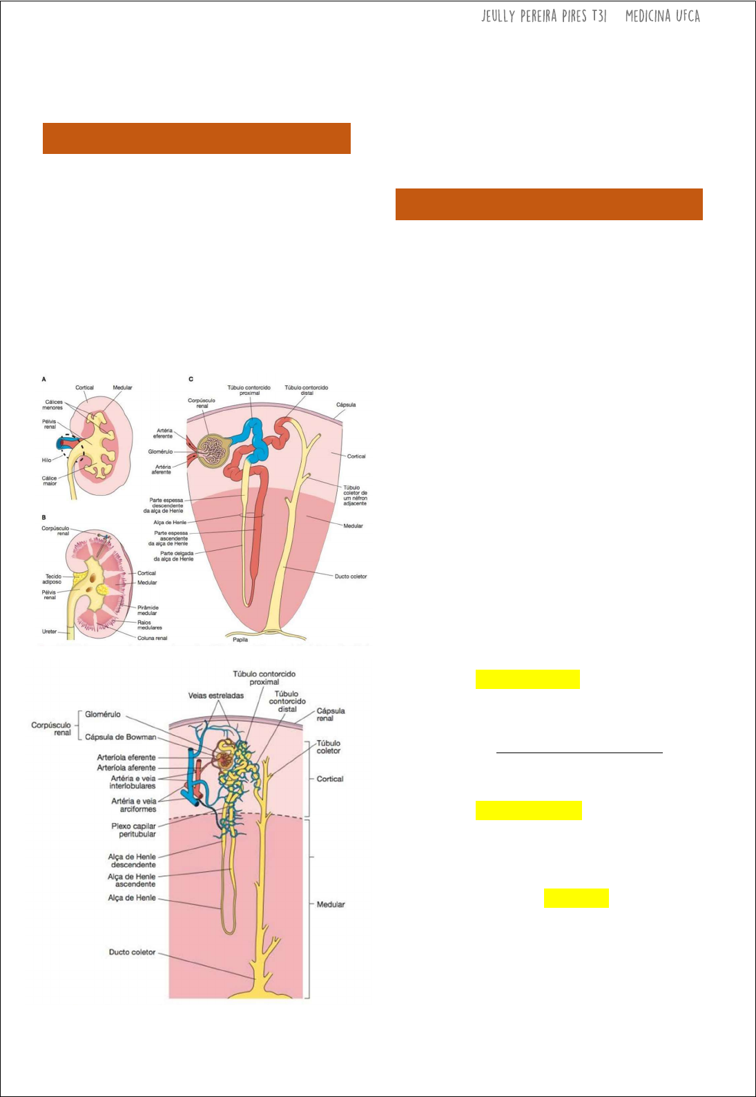 – Histologia do Sistema Urinário Introdução - O sistema urinário é composto por: 02 rins; 02 ureteres; 01 bexiga; 01 uretra; - Urina formada nos rins segue o fluxo do ure- ter à bexiga, sendo armazenada. E posterior- mente é excretada através da uretra; Fonte: Junqueira Rim - Composto pelo Néfron (unidade estrutural e funcional do rim); - Os Néfrons são responsáveis pela produção de urina. São organizados da seguinte ma- neira: 1. Corpúsculo renal; 2. Túbulo contorcido Proximal; 3. Alça de Henle; 4. Túbulo Contorcido distal; 5. Túbulo coletor; 6. Ducto coletor; -Corpúsculo renal = Corpúsculo de Malpighi; Porção inicial do néfron; Formado pelo glomérulo (novelo de capilares); Glomérulo é envolto pela cápsula de Bowman, que contém o: 1. Folheto parietal: → + externo; → Delimita o corpúsculo renal; → Ep. Pavimentoso simples apoi- ado sobre uma lâmina basal e uma fina camada de fibras reticulares; 2. Folheto visceral: → + interno; → se encontra junto aos capilares glomerulares; → Possui podócitos: cujos corpos celulares originam prolongamen- tos secundários, e são responsá- veis por envolver os capilares do glomérulo, formando fendas de filtração; – 3. Espaço capsular: → Espaço entre os dois folhetos; → Recebe o líquido filtrado por meio dos glomérulos e do folheto visceral; Os capilares glomerulares são do tipo fenestrados; Entre os capilares e os podócitos há uma espessa membrana basal que forma a barreira de filtração glomeru- lar; Céls. mesangiais → Encontradas nos glomérulos; → contráteis ; → Contém receptores de angiotensina II e fator natriurético; Polo vascular: → Artéria aferente – Entra; → Artéria eferente – Sai; Polo urinário: → Início do túbulo contorcido proxi- mal; Vermelho: glomérulo renal (novelo de capila- res sanguíneos) Azul: Cápsula de Bowman (ep. simples pavi- mentoso) Espaço entre os dois é denominado espaço de Bowman Corpúsculo circundado por túbulos renais. Vermelho: Glomérulo renal Azul claro: Pedúnculo que prende o glomé- rulo renal a superfície interna da cápsula de bowman = Polo vascular do corpúsculo Setas: Ep. simples pavimentoso que revestem internamente a cápsula de Bowman Pelo pedúnculo passam as arteríolas aferente e eferente do glomérulo; Polo urinário do corpúsculo renal – Entrada e saída do filtrado glomerular do esaço de bowman p/ o lúmen de um túbulo contorcido proximal; Azul: Glomérulo Amarelo: Espaço de Bowman; – Vermelho: Início de um túbulo contorcido proximal; - Túbulo contorcido proximal Início no polo urinário Ep. Cúbico simples; Céls. com citoplasma basal bastante acidófilo; Citoplasma apical c/ microvilos que formam orla em escova; Devido as técnicas histológicas: - Lúmen reduzido; - Orla em escova mal conservada; Túbulos contorcidos distais e proximais Azul: Túbulo contorcido proximal - Ep. simples cúbico - Céls bem coradas e altas - lúmen “sujinho” - Lúmen estreito Rosa: Túbulo contorcido distal - Tecido ep. simples cúbico; - Céls. pouco coradas e baixas; - Lúmen mais amplo que o do proximal; - Alça de Henle Formato de U; Composta por: → 01 segmento delgado(está entre os segmentos espessos); → 02 segmentos espessos; – Segmentos espessos: Ep. Cúbico simples; Segmento delgado: Ep. pavimentoso simples; Obs: devido a esse tipo de epitélio o lúmen do segmento delgado é largo; Segmento espesso final da alça de henle: torna-se tortuosa e passa a ser chamada de túbulo contorcido distal. - Azul claro: Ductos coletores → Iniciam seu trajeto na cortical (corte longitudinal) e se dirigem para a região me- dular. - Azul escuro: Porções delgadas de Alças de Henle; → Ductos de parede muito delgada → Lúmen ressaltado em azul - Túbulo contorcido distal Ep. cúbico simples; Cortes histológicos: Mácula densa: → Local do túbulo contorcido distal que se encosta no corpúsculo renal do mesmo néfron: → Céls altas: → Céls cilíndricas; → Polo vascular → Núcleos alongados e próximos uns aos outros; → Região mais escura; Azul claro: Parede de túbulo contorcido distal ressaltada Azul escuro: Região da parede deste túbulo, adjacente ao polo vascular do corpúsculo, que constitui a mácula densa – Verde: Para comparação – um outro túbulo contorcido distal, afastado do corpúsculo e sem mácula densa. Céls. da mácula densa + céls. justaglo- merulares(da arteríola aferente, prod. Renina) + Céls. mesangiais = Apare- lho justaglomerular - Túbulos coletores e Ductos coletores Dos túbulos contorcidos distais, a urina passa para os túbulos coletores. Após os túbulos coletores a urina é di- recionada para os ductos coletores; Tubos mais calibrosos; Se dirigem as papilas renais; Ep. cúbico simples; Céls. se aproximam das papilas, se fundem e tornam-se mais cilíndrica e o diâmetro do tubo aumenta; Citoplasma pouco corado pela eosina e possuem limites intercelulares bas- tante nítidos; Azul claro: Túbulo coletor(corte longitudinal) Azul escuro: Túbulo contorcido proximal Rosa: Túbulo contorcido distal - O rim é formado por: 1. Cápsula de tecido conjuntivo denso; 2. Zona cortical; 3. Zona medular; - Cápsula de tecido conjuntivo denso; Camada externa: fibroblastos e fibras colágenas; Camada interna: miofibrilas; - Zona Cortical Corpúsculos renais; Túbulos renais; – Raios Medulares: estriações verti- cais que emanam da medula em dire- ção ao córtex e consistem em agrega- dos de túbulos retos e ductos coleto- res; Verde: corpúsculos renais ou de Malpighi Azul: Túbulo contorcido proximal Restante da imagem são túbulos renais. Azul claro: Conjunto de túbulos renais dispos- tos em feixes paralelos – Raios medulares; - Zona medular Túbulos retos/Alça de Henle; Ductos coletores em meio a capilares e outros vasos; Papilas renais → Parte mais interna da medula; → Formam saliências convexas que se projetam nos cálices renais; → Formadas por p