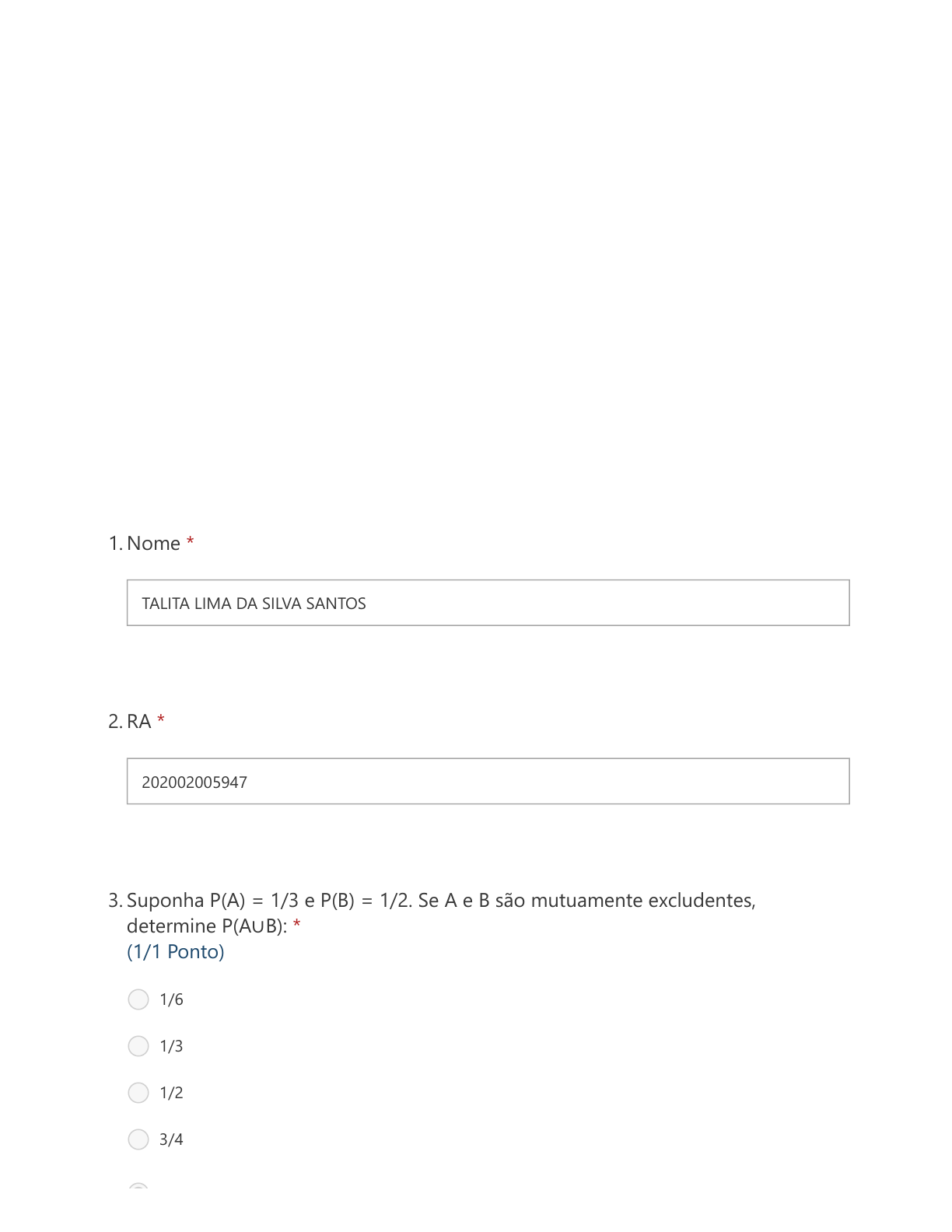 20/04/2021 QUIZZ 2 - PROBABILIDADE https://forms.office.com/pages/responsepage.aspx?id=zIHgKT-YUk2x0BA1lSE7xk4a0CxKdaFEid9Wzyj8uCNUMEg3NzBaN1lBMk9aVUFVVDJUUUh… 1/6 Pontos: 10/10 QUIZZ 2 - PROBABILIDADE Teste seus conhecimentos em Probabilidade Nome * 1. TALITA LIMA DA SILVA SANTOS RA * 2. 202002005947 Suponha P(A) = 1/3 e P(B) = 1/2. Se A e B são mutuamente excludentes, determine P(A∪B): * (1/1 Ponto) 3. 1/6 1/3 1/2 3/4 20/04/2021 QUIZZ 2 - PROBABILIDADE https://forms.office.com/pages/responsepage.aspx?id=zIHgKT-YUk2x0BA1lSE7xk4a0CxKdaFEid9Wzyj8uCNUMEg3NzBaN1lBMk9aVUFVVDJUUUh… 2/6 5/6 Um comerciante possui duas lojas em centros comerciais diferentes. A probabilidade de um cliente entrar em na primeira loja e comprar é de 30%, sendo o ticket médio de compras da loja de R$ 120,00. Na segunda loja a probabilidade de compra é de 25% e o ticket médio é de R$ 300,00. O movimento em ambas as lojas é respectivamente de 2.100 clientes por mês na loja 1 e 800 clientes por mês na loja 2. Qual o faturamento consolidado esperado no mês? * (1/1 Ponto) 4. R$ 135.600,00 R$ 75.600,00 R$ 60.000,00 R$ 100.800,00 R$72.000,00 Uma bola é retirada aleatoriamente de uma urna que contém 20 bolas vermelhas, 8 azuis e 7 brancas. Qual a probabilidade delas serem: * (1/1 Ponto) 5. 0,47 0,57 0,67 0,23 0,20 20/04/2021 QUIZZ 2 - PROBABILIDADE https://forms.office.com/pages/responsepage.aspx?id=zIHgKT-YUk2x0BA1lSE7xk4a0CxKdaFEid9Wzyj8uCNUMEg3NzBaN1lBMk9aVUFVVDJUUUh… 3/6 O estudo antropométrico em uma amostra de 100 funcionários de determinada empresa resultou na seguinte tabela, que relaciona os pesos com as alturas: Abaixo de 1,70m Acima de 1,70m Abaixo de 80kg 30 15 Acima de 80kg 10 45 Considerando que um funcionário foi escolhido aleatoriamente, qual é a probabilidade de que ele tenha peso abaixo de 80kg e altura abaixo de 1,70m? * (1/1 Ponto) 6. 1/10 1/5 3/10 4/10 1/2 De um baralho de 52 cartas retiram-se, ao acaso, duas cartas sem reposição. Qual a probabilidade de ambas serem de copas? * (1/1 Ponto) 7. 0,06 0,006 0,0006 0,16 0,016 A probabilidade de um cliente entrar em uma loja e comprar é de 15%, sendo o ticket médio de compras da loja de R$ 60,00. Num dia com movimento agitado passam pela loja 200 clientes, nestas condições qual o faturamento esperado no dia? * (1/1 Ponto) 8. R$ 1.800,00 20/04/2021 QUIZZ 2 - PROBABILIDADE https://forms.office.com/pages/responsepage.aspx?id=zIHgKT-YUk2x0BA1lSE7xk4a0CxKdaFEid9Wzyj8uCNUMEg3NzBaN1lBMk9aVUFVVDJUUUh… 4/6 R$ 1.600,00 R$ 12.000,00 R$ 16.000,00 R$ 18.000,00 O estudo antropométrico em uma amostra de 100 funcionários de determinada empresa resultou na seguinte tabela, que relaciona os pesos com as alturas: Abaixo de 1,70m Acima de 1,70m Abaixo de 80kg 30 15 Acima de 80kg 10 45 Considerando que um funcionário foi escolhido aleatoriamente, qual é a probabilidade de que ele tenha altura acima de 1,70m? * (1/1 Ponto) 9. 0,40 045 0,55 0,60 0,65 De um baralho de 52 cartas retiram-se, ao acaso, duas cartas sem reposição. Qual a probabilidade de a primeira carta ser o ás de paus e a segunda ser o rei de paus? * (1/1 Ponto) 10. 0,0004 0,004 0,04 0,0008 0,0016 20/04/2021 QUIZZ 2 - PROBABILIDADE https://forms.office.com/pages/responsepage.aspx?id=zIHgKT-YUk2x0BA1lSE7xk4a0CxKdaFEid9Wzyj8uCNUMEg3NzBaN1lBMk9aVUFVVDJUUUh… 5/6 Este conteúdo foi criado pelo proprietário do formulário. Os dados que você enviar serão enviados ao proprietário do formulário. A Microsoft não é responsável pela privacidade ou práticas de segurança de seus clientes, incluindo aqueles do proprietário deste formulário. Nunca forneça sua senha. Da plataforma Microsoft Forms | O proprietário deste formulário não forneceu uma política de privacidade sobre como usará seus dados de resposta. Não forneça informações pessoais ou confidenciais. | Condições de uso Voltar à página de agradecimento No lançamento de um dado, qual a probabilidade de se obter um número não- inferior a 5 * (1/1 Ponto) 11. 1/2 1/3 1/4 1/5 2/5 Duas bolas são retiradas aleatoriamente (uma após a outra, sem reposição), de uma urna que contém 20 bolas vermelhas, 8 azuis e 7 brancas. Qual a probabilidade delas serem uma bola vermelha e uma bola azul, respectivamente? * (1/1 Ponto) 12. 0,13 0,57 0,05 0,23 0,20 https://go.microsoft.com/fwlink/?linkid=866263 javascript:void(0) 20/04/2021 QUIZZ 2 - PROBABILIDADE https://forms.office.com/pages/responsepage.aspx?id=zIHgKT-YUk2x0BA1lSE7xk4a0CxKdaFEid9Wzyj8uCNUMEg3NzBaN1lBMk9aVUFVVDJUUUh… 6/6