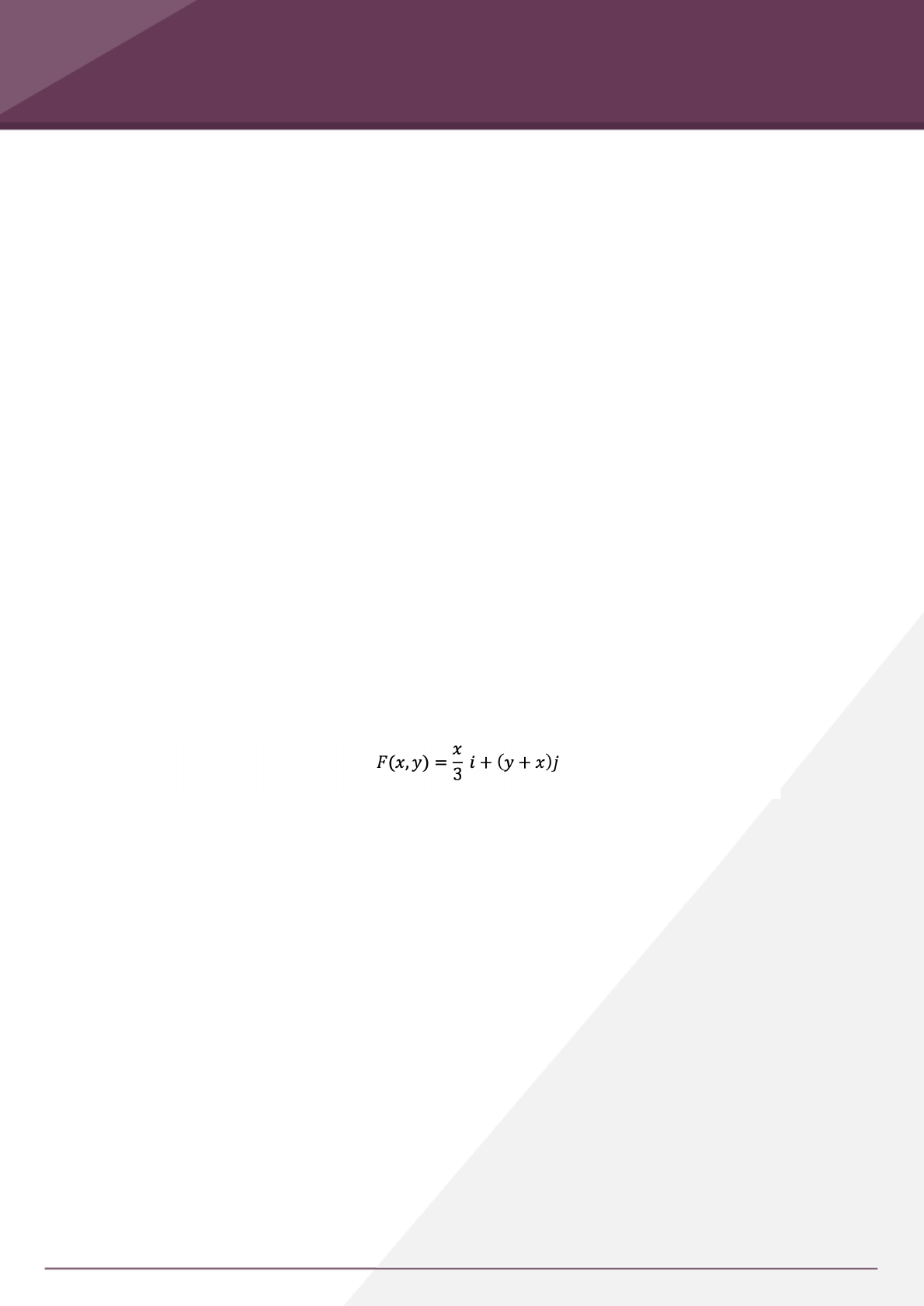 LISTA DE EXERCÍCIOS 1. Calcule o divergente da função F (x, y, z) = (x2 + y, y2 + z, z + 1). 2. Determine o vetor gradiente f(x, y,z) = xyz + x3 + y3 + (z3 – 3z). 3. Qual o divergente da função F (x, y, z) = (e2x, 3x2yz + 2y2z + x). 4. Calcule o rotacional de F (x, y, z) = (x2yz2, xyz2, x + y + z). 5. Determine o divergente da função f (x, y, z) = (3x2y, -2 xy4, xy). 6. Sendo um campo vetorial definido por F (x, y, z) = (ex sen y, ex cos y, z) determine seu divergente. 7. Esboce o campo vetorial da função 8. Sendo o campo vetorial F(x, y, z) = (3x2 + 4y , 2x2y + 5z, 3x + 4y + 5z3), calcule o rotacional. 9. Sendo o campo vetorial F(x, y, z) = (3x2 + 4y , 2x2y + 5z, 3x + 4y + 5z3), calcule o divergente. 10. Calcule o divergente da função f(x, y, z) = x2y i + 3y4j + 7 z k. GABARITO 1. Div f = (2x + 2y + 1) 2. ∇(x, y, z) = (yz + 3x2 )i + (xz + 3y2 ) j + (xy + 3z2 – 3) z 3. Div f = (2e2x+ 3x2z + 2y2) 4. Rot f = ( 1 – 2xyz) i – ( 1 -2x2yz) j + (yz2 – x2z2) k 5. Div f = (6xy – 8xy3) 6. Div f = 1 7. XXXXXX 8. Rot f = - i – 3j + 4(xy – 1)k. 9. Rot f = 6x + 2x2 + 15z2. 10. Div f = 2xy + 12 y3 + 7