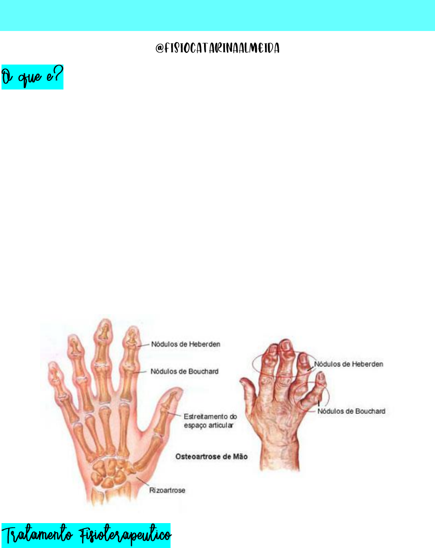 Osteoartrose Nodal Normalmente o acometimento de mãos na osteoartrose é do tipo simétrico e bilateral, podendo ocorrer tanto em articulações interfalangianas distais quanto as proximais. O acometimento das interfalangianas pode ser, por vezes, indolor, sendo que algumas pacientes só se dão conta da importância e da gravidade desta doença quando as deformidades já estão instaladas. Quando o comprometimento articular é das Interfalangianas proximais com formação de nodosidades, são estas chamadas de nódulos de Bouchard enquanto, o acometimento de inter falangianas distais tem suas nodosidades denominadas nódulos de Heberden. - Gelo: dor aguda - Calor: dor crônica, rigidez matinal - Banho de imersão em água quente associado ao exercício (ajuda na dor) - Laser - Ondas curtas - Mobilização articular (ajuda na amplitude de movimento, lubrificação da articulação e mobilidade articular) -Liberação Muscular -Tração articular (para liberar espaçamento) Quais atividades fazem sentir dor? Importante saber o que gera sobrecarga e com isso saber a intensidade que faz essas atividades para conseguir amenizar esses sintomas. Por que qualquer atividade de sobrecarga articular vai piorar os sintomas.