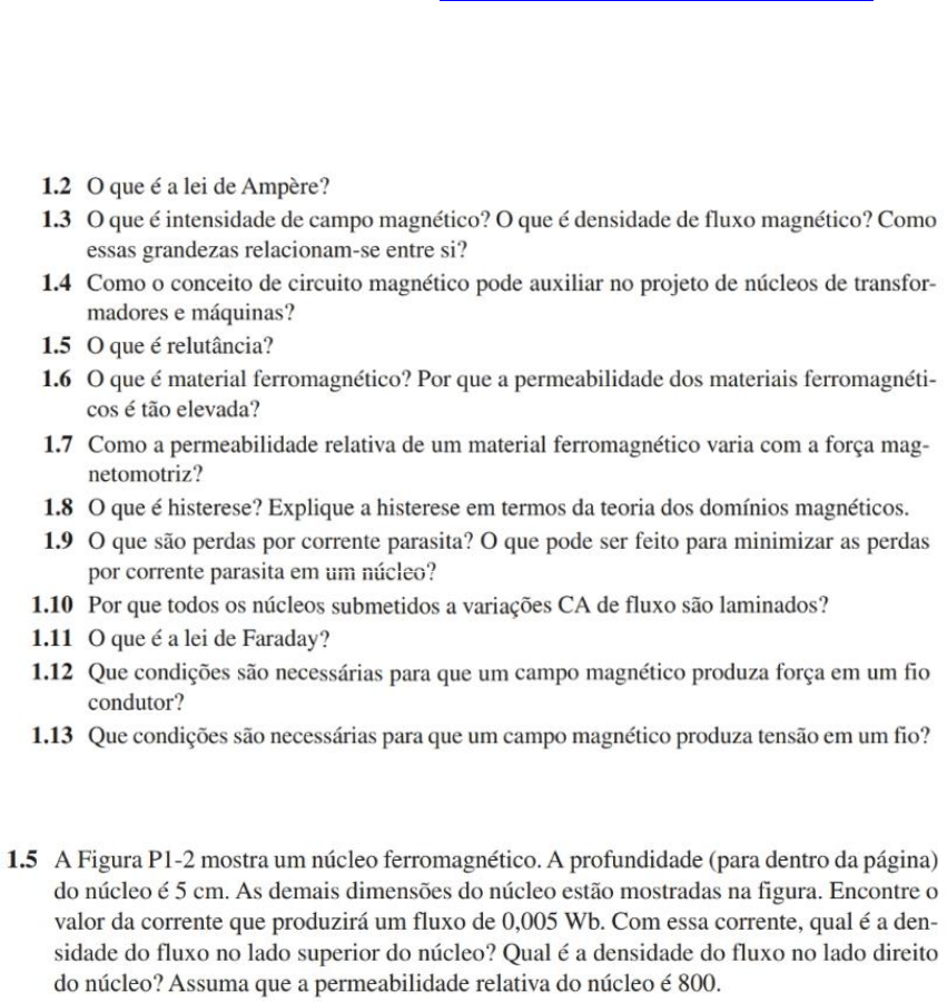 Lista de exercícios – cap1 – Introdução aos princípios de máquinas Livro: CHAPMAN, Stephen J. Fundamentos de Máquinas Elétricas, 5th edição. AMGH, 04/2013. Disponível em: https://integrada.minhabiblioteca.com.br Páginas: 55 a 61 Fazer: - Perguntas: - Problemas: 1.5 a 1.15. https://integrada.minhabiblioteca.com.br/books/9788580552072 Respostas dos problemas: 1.5) i = 2,5 A; Bsup = 0,67 T; Bdir = 2 T. 1.6) Фcentro = 1,47 mWb; Фesq = 0,68 mWb; Фdir = 0,79 mWb; Besq = 185 mT; Bdir = 215 mT. 1.7) Фtot = 6,53 mWb. 1.8) Фcentro = 0,86 mWb; Фesq = 1,48 mWb; Фdir = 0,62 mWb; Bcentro = 115 mT; Besq = 329 mT; Bdir = 138 mT. 1.9) F = 1 N entrando na página; 1.10) e = 0,354 V com positivo na parte de baixo; 1.11) e = 0 V; 1.12) Фtot = 3,83 mWb; µr = 704. A consideração de que µr = 1200 não é muito boa neste caso. 1.13) a) i = 0,12 A; b) i = 0,202 A, não; c) Rcentro = 12,6 kAe/Wb, Rdir = 50,4 kAe/Wb; d) Rcentro = 13,4 kAe/Wb, Rdir = 37,8 kAe/Wb; e) As relutâncias dos núcleos magnéticos reais não são constantes. 1.14) i = 0,651 A; Bdir = 0,524 T; Bcima = Besq = Bbaixo = 0,262 T; Фtot = 1,31 mWb. 1.15) Фtot = 0,218 mWb; B = 1,35 T.