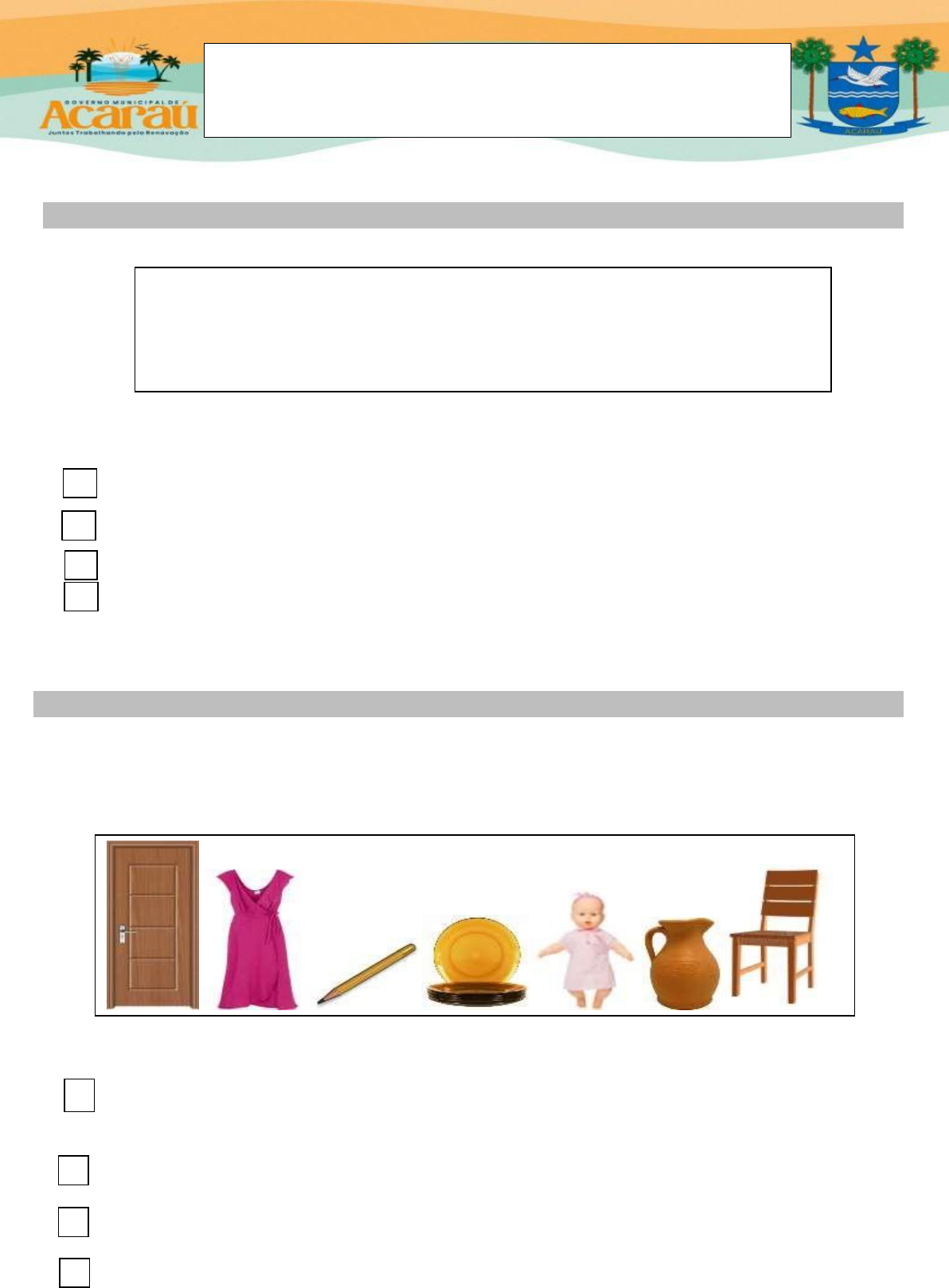 QUESTÃO 01 Leia o texto abaixo. Marque a alternativa correta. A) Os materiais de origem animal são obtidos das plantas. B) Os materiais de origem mineral são obtidos dos animais. C) Os materiais de origem vegetal são obtidos dos animais. D ) Os materias de origem mineral são obtidos do solo. QUESTÃO 02 Voce já percebeu a variedade de objetos que existem ao nosso redor? Observe as imagens abaixo e analise que materia foram utilizados na fabricação de cada objeto. Marque a alternativa que contém o nome dos objetos que são feitos de madeira. A) Boneca, cadeira e lápis. B) Cadeira, lápis e porta. C) Jarro, porta e prato. D) Vestido, boneca e jarro Os objetos que utilizamos no dia a dia são feitos de diferentes materiais. Esses materiais podem ser de origem vegetal, animal ou mineral. Exemplos: a lã é de origem vegetal, a madeira de origem animal e o vidro de origem mineral. ATIVIDADE BIMESTRAL 2 º Ano NOME:__________________________________________________________ ESCOLA:_________________________________________________________ PROFESSORA:________________________ DATA:______/_______/_________ QUESTÃO 03 Observe as cenas abaixo. A energia elétrica já se tornou parte integrante do dia a dia da maioria das pessoas. De acordo com essa afirmação e com as figuras que você observou, qual das cenas mostra uma situação onde a energia elétrica é utilizada? A) As crianças andando de bicicleta. B) As crianças brincando na gangorra. C) O menino jogando bola. D) Os meninos assistindo televisão QUESTÃO 04 Nosso corpo retira dos alimentos a energia necessária para realizar suas funções .O conceito de energia se refere a que tipo de energia.Marquue a opção correta: A) B) C) D) QUESTÃO 05 Muitos objetos são feitos de mais de um material .Identifique na imagem abaixo os materiais ultizados nas partes indicadas do objeto. Marque a opção correta em relação aos materiais utilizados para fazer o apontador. A) madeira e plástico B) plástico e metal C) tecido e metal D) vidro e metal