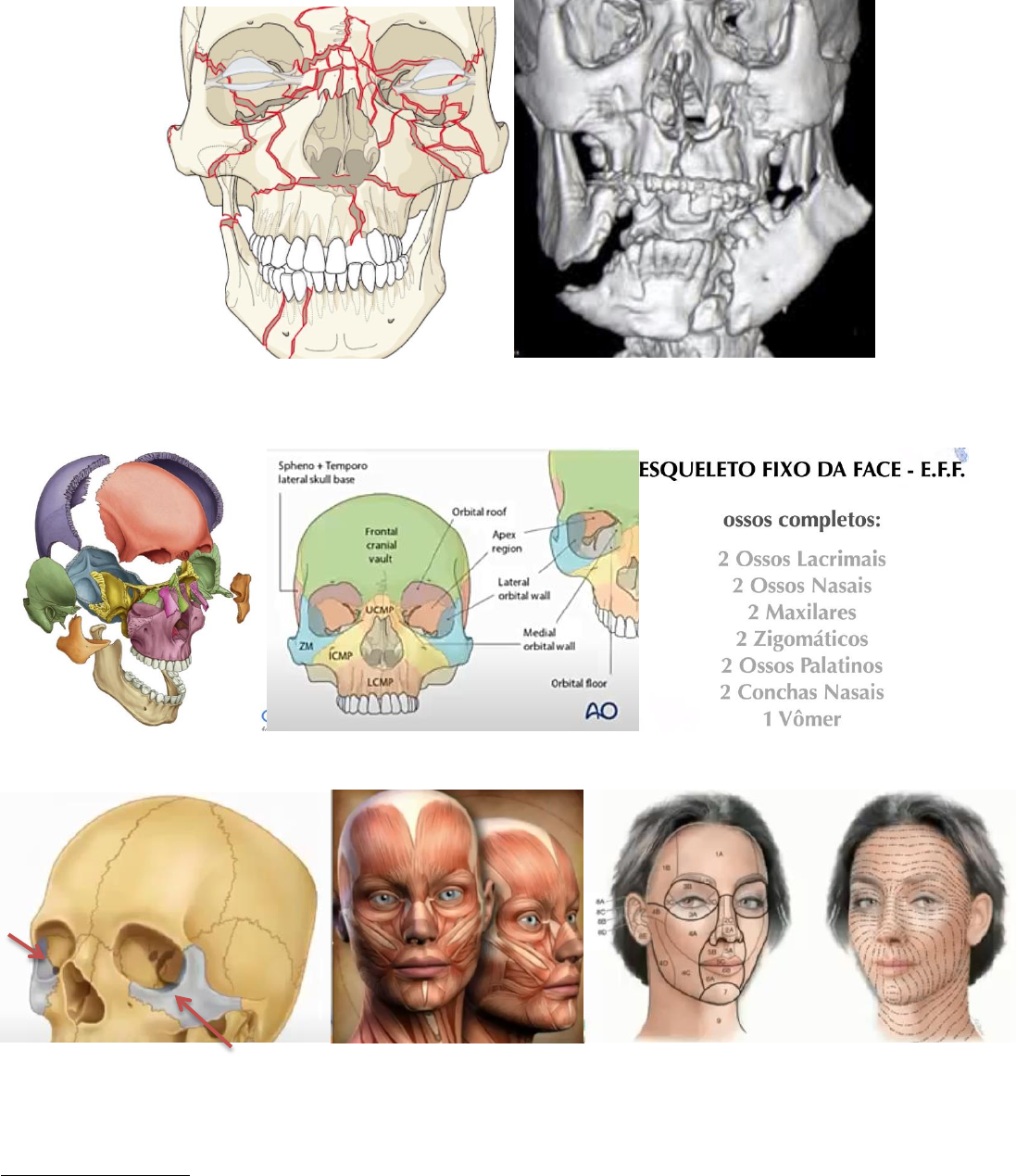 TRAUMA BUCO Buco 24/08 - Caco ARQUITETURA DO ESQUELETO FACIAL Parte facial do crâneo = esqueleto fixo (terço médio) + esqueleto móvel (mandíbula). Dividido em zonas: orbitária, frontal, zigomática, maxilar, nasalo, etc. Fratura do osso zigomático em aproximadamente 100% dos casos há o envolvimento de órbita. Todas as artérias causam sangramento extenso e pode levar ao óbito. Musculatura dita sentido da incisão. Linhas de expressão facial = tensão facial. ESQUELETO FIXO DA FACE (EFF): imóvel, diversos ossos, constituição lamelar, apresenta cavidades, continuidade com o crânio, rica vascularização (sangra bastante), alta complexidade das fraturas, pequenas alterações na oclusão, diagnóstico mais complexo, tratamento mais complexos, maior gravidade. Esponjoso (pouca cortical). Ossos incompletos (além dos completos já citados): 2 Ossos temporais, 1 osso frontal, 1 osso etmoide, 1 osso esfenoide. Rowe & Killey (1955): 3 vigas emparelhadas, transmitindo força uniformemente para a base craniana, com retorno na linha média. Em seu diagrama arquitetônico, o palato (arqueado) e as bordas infraorbitárias articulam-se com as vigas anterior e mediais. 2 vigas anteriores (caninas – pilar canino), que se ligam pelo pilar supra nasal. Pilar zigomático é ligado ao canino pelo arco infraorbitário e palatino. Sicher & Dubrull (1975): Também reconhecem a importância dos 3 pilares emparelhados na transmissão da força. Dão grande importância para os pilares horizontais que unem os pilares curvos verticais, especialmente os pilares supra-orbitários. Sturla et al. 1980: enfatizam a importância dos pilares verticais e das “plataformas transversais” – o palato duro e os ossos frontais e esfenoides. Cortes tomográficos (Gentry et al 1983): 3 horizontais (superior, medial ou orbital e inferior ou palatal), 3 sagitais (medial ou palatal, parasagital e lateral, 5 coronários anteriores (frontal, zigomático – frontal, nasofrontal, maxilar anterior e alveolar anterior) e 2 coronários posteriores (maxilar posterior e pterigoide). Azul = onde tem resistência suficiente para a colocação das placas. Amarela não tem necessidade (estrutura óssea) para a colocação de placas. O autor adiciona a zona alveolar, que se une ao palato duro (sturla). PILARES: Pilar canino (vermelho saindo da região de canino), pilar zigomático (sai da região de ápice de 1° molar superior e corre pela “maçã do rosto”, o zigoma, e vai para parede lateral da órbita), Pilar pterigoideo (sai de região de 3° molar superior, corre pelo osso esfenoide e termina também na parede lateral da órbita, mais posteriormente). VIGAS: Viga alveolar (que se une ao palato), viga zigomática (que, principalmente, corre pela região infraorbitária até arco zigomático) e as vigas supra orbitárias que unem as regiões supraorbitárias e região supra nasal. Pilar – “segura barraca” mantém a face. Viga – sustenta pilar. Esqueleto fixo da face: Zonas de fragilidade - horizontais, oblíquas (irregulares), longitudinais (rafe palatina). Em vermelho temos zonas principais de fragilidade (parede lateral de seio maxila, parede lateral de nariz e dorso nasal e zona frontal, principalemnte). Dificilmente pura de zigomático, havendo envolvimento de órbita, maxila, etc. Seio maxilar promove fragilidade. 7 ossos compõe a orbita. MANDÍBULA: zonas de fragilidade – processo condilar, processo coronóide, ângulo da mandíbula, corpo da mandíbula, sínfise e parassínfese mandibular e processo alveolar. *Móvel osso único, cortical, apresenta cavidades, contiguidade com o crânio, pobre vascularização, menor complexidade das fraturas, grandes alterações na oclusão, diagnóstico menos complexo, tratamentomenos complexo, menor gravidade. Zonas de resistência: trajetória marginal, temporal, alveolar e mentual. Zonas de fragilidade: processo condilar, p. coronóide, ângulo mandibular, corpo da mandíbula, sínfise e parassínfese mandibular, processo alveolar. Vermelho: linhas de força/ Azul: linhas de compressão/ Branco: linhas de torção = causados pelos músculos inseridos no mento. Usa essas regiões para fixação de placas e parafusos. Azul: Pelo movimento do masseter e do digástrico, tem-se na base da mandíbula região de compressão. Vermelho: região de tensão na linha oblíqua. Tende a abrir a fratura na região de alvéolo e fechar na região de base. CUIDADO COM CANAL MANDIBULAR NA FIXAÇÃO DE PLACAS! Regiões de alvéolo mono cortical (mais curto), por conta da raíz dos dentes. Na região da base, pode bi cortical (mais longo e mais estável). TRAUMA BUCOMAXILOFACIAL EPIDEMIOLOGIA Fatores socioeconômicos, geográficos e culturais. Mudança no padrão epidemiológico: acidentes de trânsito (motocicletas e automóveis), violência urbana, práticas esportivas, acidentes domésticos (idosos), acidentes de trabalho (EPIs). A consequência imediata são os traumas de grande intensidade, envolvendo várias estruturas anatômicas e com maior mobilidade. Graças às técnicas modernas de resgate e manutenção da vida, mais e mais pacientes acabam chegando com vida no hospital. Tais lesões devem receber tratamento emergencial, pois podem evoluir ao óbito, causando choque hipovolêmico (perdeu sangue), obstrutivo ou neurogênico (dor mata – choque neurogênico) – devido à proximidade de estruturas vitais (edema, hemorragia intensa, obstruções de vias aéreas). ATUALIDADE: Avanço nos protocolos de atendimento do paciente vítima de trauma – politraumatizado (ATLS), evolução dos materiais – fixação interna rígida (placas e parafusos) e progressos no diagnóstico de imagem: RX digital, tomografia 3D e RNM, cirurgia guiada virtualmente. EXAME FÍSICO: Dor e edema, equimoses, hipostesias e parestesias, maloclusão e/ou trismo, distúrbios visuais, assimetrias, epistaxe e otorragia (substância secretada pelo canal auditivo externo é o sangue). Ver se maxila e