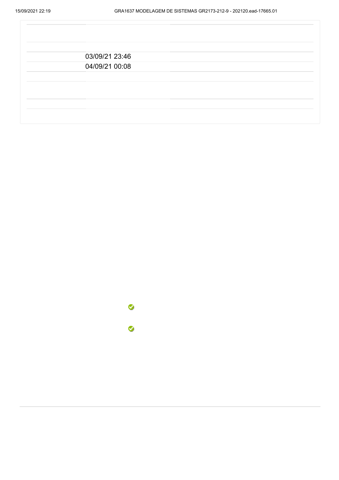 15/09/2021 22:19 GRA1637 MODELAGEM DE SISTEMAS GR2173-212-9 - 202120.ead-17665.01 https://anhembi.blackboard.com/webapps/late-course_engine_soap-BBLEARN/Controller?COURSE_ID=_736400_1 1/6 Curso GRA1637 MODELAGEM DE SISTEMAS GR2173-212-9 - 202120.ead- 17665.01 Teste ATIVIDADE 4 (A4) Iniciado 03/09/21 23:46 Enviado 04/09/21 00:08 Status Completada Resultado da tentativa 9 em 10 pontos Tempo decorrido 21 minutos Resultados exibidos Respostas enviadas, Respostas corretas, Comentários Pergunta 1 Resposta Selecionada: Resposta Correta: Comentário da resposta: A modelagem de sistemas pode utilizar vários tipos de ferramentas, apesar de o processo depender do analista. Atualmente, somados ao repertório clássico matemático e de representação de processos, utilizam-se softwares do tipo CAD para gerar diagramas e outros artefatos de projeto. Com relação aos modos de representação de um sistema e sua utilização, analise as afirmativas a seguir. I. Os softwares CAD ( Computer Aided Design ) permitem realizar apenas cálculos, sem representação gráfica. II. O diagrama de blocos é uma forma de representação em caixas de um processo qualquer, com o objetivo de identificar todos os componentes. III. Para que possa ser utilizada a modelagem matemática, é preciso mapear as variáveis do processo e suas transformações. IV. Caso seja preciso modelar as funções matemáticas associadas a elementos do diagrama de blocos, será necessário utilizar as redes de Petri. Está correto o que se afirma em: II e III, apenas. II e III, apenas. Resposta correta. A alternativa está correta, pois os softwares CAD são softwares que fazem a representação gráfica do processo, com o propósito de gerar diagramas e permitir a visualização. O diagrama de blocos se preocupa com a identificação dos elementos que constituem o processo, gerando uma visão abrangente e de forma esquemática. A análise matemática permite a visualização mais aprofundada, por meio da explicitação das transformações às quais as variáveis são submetidas. As redes de Petri, apesar de terem elementos mistos, são o intermediário entre os fluxogramas e a representação matemática do sistema. Pergunta 2 Quando não se conhecem as equações e os parâmetros de um determinado componente, é preciso fazer o levantamento desses elementos usando técnicas de regressão, que não passam de formas de estabelecer a correlação entre 1 em 1 pontos 1 em 1 pontos 15/09/2021 22:19 GRA1637 MODELAGEM DE SISTEMAS GR2173-212-9 - 202120.ead-17665.01 https://anhembi.blackboard.com/webapps/late-course_engine_soap-BBLEARN/Controller?COURSE_ID=_736400_1 2/6 Resposta Selecionada: Resposta Correta: Comentário da resposta: duas variáveis, a fim de se obter a equação de um fenômeno. Com base no apresentado, analise as asserções, a seguir, e a relação proposta entre elas. I. É impossível fazer a regressão nos componentes de um sistema; é possível utilizar essa técnica somente em sistemas inteiros. Pois: II. É necessária uma visão holística do processo para a modelagem ser significativa, e isso inclui o mapeamento de todas as variáveis. A seguir, assinale a alternativa correta. A asserção I é uma proposição falsa, e a II é uma proposição verdadeira. A asserção I é uma proposição falsa, e a II é uma proposição verdadeira. Resposta correta. A alternativa está correta. A asserção I é falsa, pois não há restrição quanto a utilizar essa técnica em componentes do processo, desde que se saiba quais variáveis se deseja relacionar. A asserção II é verdadeira, porque é preciso realizar a regressão baseada na maior quantidade de informações possível, caso contrário corre-se o risco de que o modelo fique incompleto e não corresponda à realidade. Pergunta 3 Resposta Selecionada: Resposta Correta: Comentário da resposta: Para realizar uma análise confiável de determinado sistema, é preciso criar um modelo fidedigno de um sistema, utilizando técnicas matemáticas e estatísticas. Para verificar quão próximo da realidade um modelo está, são utilizados parâmetros estatísticos de confiabilidade. Considerando, portanto, os parâmetros estatísticos envolvidos na modelagem de sistemas, analise as afirmativas a seguir. I. A precisão é um parâmetro relacionado a quão próximo o resultado da simulação está do resultado obtido no sistema real. II. A modelagem deve ser realizada a partir de valores quaisquer, mas nunca mais de um, já que não é possível modelar fidedignamente diversas variáveis. III. Os modelos matemáticos não precisam ser validados, uma vez que esse tipo de modelo é intrinsecamente fidedigno. IV. Como não há um único meio de se representar um processo, é possível exprimir processos de várias formas, como diagramas de blocos e equações. Está correto o que se afirma em: I e IV, apenas. I e IV, apenas. Resposta correta. A alternativa está correta, pois um modelo de baixa precisão não consegue expressar de maneira fidedigna os resultados do mundo real. Para essa modelagem, porém, é possível utilizar quantas variáveis forem precisas, a depender da validação das funções matemáticas para verificar que o modelo corresponde ao processo modelado. E, dependendo do processo, o tipo de modelagem mais apropriado pode variar, podendo ser por meio de equações matemáticas, diagrama de blocos, rede de Petri ou outros. 1 em 1 pontos 15/09/2021 22:19 GRA1637 MODELAGEM DE SISTEMAS GR2173-212-9 - 202120.ead-17665.01 https://anhembi.blackboard.com/webapps/late-course_engine_soap-BBLEARN/Controller?COURSE_ID=_736400_1 3/6 Pergunta 4 Resposta Selecionada: Resposta Correta: Comentário da resposta: O controle de um sistema tem como objetivo diminuir o erro na saída, dada uma entrada qualquer, ainda que esta seja submetida a variações provenientes de perturbações do sistema. Os controladores possuem vários graus de complexidade e podem ser implementados com v