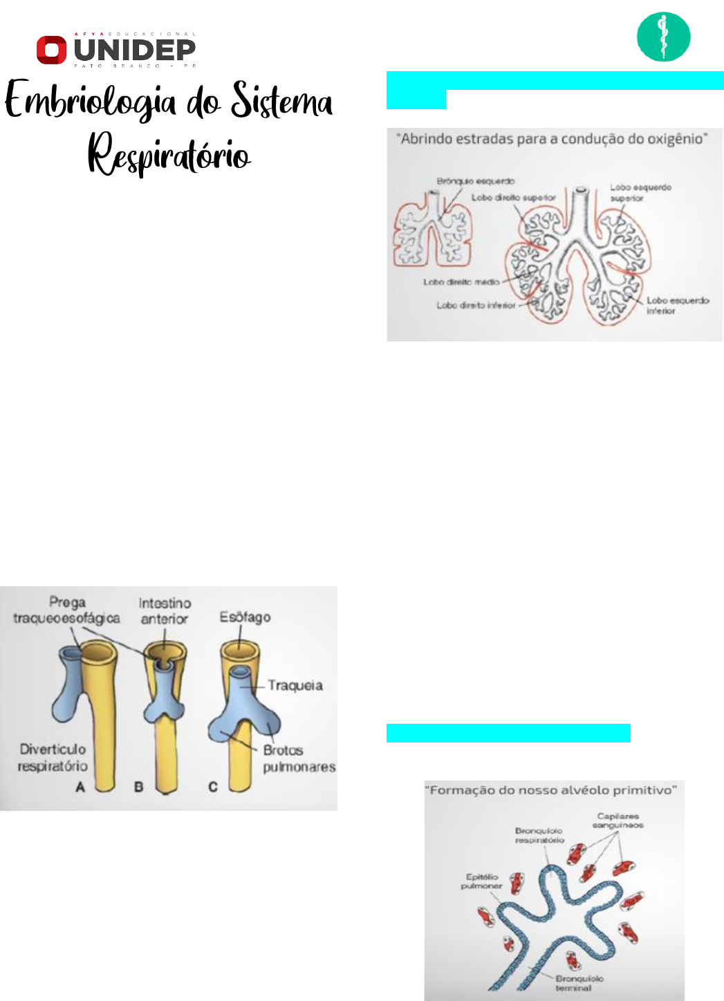 1 Aula SanarFlix ➢ Formação da Árvore Brônquica (4° semana do desenvolvimento) ➢ Desenvolvimento do parênquima pulmonar ➢ Formação da Pleura Endoderma – da origem a todo o epitélio do trato do sistema respiratório Mesoderma – cartilagens e vasos Ectoderma – sistema nervoso central 4 – 8° Semana = Organogênese Trato respiratório nasce do divertículo respiratório na 4° semana, esse divertículo sai do interior do intestino primitivo – é como se o esôfago e a traqueia fossem irmãos separados ao longo das semanas Formação da Traqueia 4° Semana Formação do divertículo Traqueia -> brotos pulmonares (é o pulmão direito e esquerdo na sua origem) Período Pseudoganglionar – 5 a 16° semana O parênquima pulmonar se forma paralelamente a formação da traqueia/acompanha a árvore brônquica. Formação dos brônquios direito e esquerdo - > porções lobares -> porções segmentares Lado Direito – 3 lobos pulmonares Lado Esquerdo – 2 lobos pulmonares Começa a formar uma árvore que vai se dividindo e dividindo – arvore brônquica vão aumentando e junto vai o tecido pulmonar Os lobos primitivos do pulmão Se um bebe nascer na 16° semana, é impossível que ele respire porque faltam estruturas especializadas – os alvéolos Não tem ainda a estrutura de troca gasosa Período Canalicular – 16° a 26° - formação do alvéolo primitivo 2 O sistema de condução continua se desenvolvimento e começa ter os primeiros contatos com o sistema sanguíneo – vasos sanguíneos Começa a surgir o alvéolo primitivo porque os vasos sanguíneos ficam próximo desses locais Bronquíolos respiratórios, bronquíolos terminais (condução) Formação de um epitélio pulmonar – células de epitélio achatadinhos para formar a nossa membrana de troca Já poderia ter troca gasosa num bebê de 26 semanas Período de Saco Terminal – 26° semana ao parto) As estruturas de troca começam se especializar ainda mais, o epitélio respiratório fica fininho e os capilares começam a ficar mais próximos dessas estruturas Surgimento de Células especializadas Surgimento do pneumócito Tipo 1 – reveste o saco alveolar Tipo 2 – fundamental porque produz o surfactante (um detergente que fica dentro dos nossos alvéolos e evita o colapso pela diminuição da tensão superficial) Se entrar em colapso o bebê não consegue respirar Período Alveolar (do parto aos 8 anos) Aonde de fato há o desenvolvimento máximo dessas estruturas As trocas acontecem de forma mais efetiva Movimentos respiratórios (inspiração e expiração) Remoção do líquido pulmonar após o nascimento -> líquido por ar depois que nasce Até os 8 anos aumenta o número de alvéolos – nossa função pulmonar só se estabelece depois da idade adulta Membrana alvéolo-capilar – MEMBRANA DE TROCA Surfactante e o alvéolo Se não tivesse essa membrana do alvéolo ele iria entrar em colapso – síndrome da angústia respiratória do recém nascido Alvéolos fechados e ele não tem força para abrir esses alvéolos 3 Formação da Pleura – Enquanto a árvore brônquica e as estruturas estão se desenvolvendo em paralelo há um canal pericardioperitoneal A nossa cavidade pleural e pericárdica está conectada inicialmente A partir que o sistema respiratório vai crescendo ele vai ganhando espaço e vai se formando o espaço pleural Pleura visceral – conectada no órgão Pleura Parietal – parte externa 4