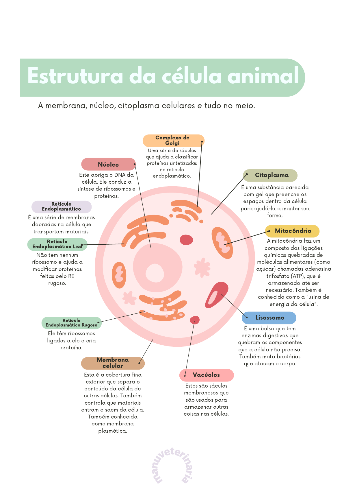 Este abriga o DNA da célula. Ele conduz a síntese de ribossomos e proteínas. Uma série de sáculos que ajuda a classificar proteínas sintetizadas no reticulo endoplasmático. É uma substância parecida com gel que preenche os espaços dentro da célula para ajudá-la a manter sua forma. A mitocôndria faz um composto das ligações químicas quebradas de moléculas alimentares (como açúcar) chamadas adenosina trifosfato (ATP), que é armazenado até ser necessário. Também é conhecido como a "usina de energia da célula". É uma bolsa que tem enzimas digestivas que quebram os componentes que a célula não precisa. Também mata bactérias que atacam o corpo. Estes são sáculos membranosos que são usados para armazenar outras coisas nas células. Ele têm ribossomos ligados a ele e cria proteína. Não tem nenhum ribossomo e ajuda a modificar proteínas feitas pelo RE rugoso. É uma série de membranas dobradas na célula que transportam materiais. Esta é a cobertura fina exterior que separa o conteúdo da célula de outras células. Também controla que materiais entram e saem da célula. Também conhecida como membrana plasmática. Núcleo Complexo de Golgi Citoplasma Mitocôndria Lisossomo Vacúolos Retículo Endoplasmático Rugoso Retículo Endoplasmático Liso Retículo Endoplasmático Membrana celular Estrutura da célula animal A membrana, núcleo, citoplasma celulares e tudo no meio. ma nu veterinaria